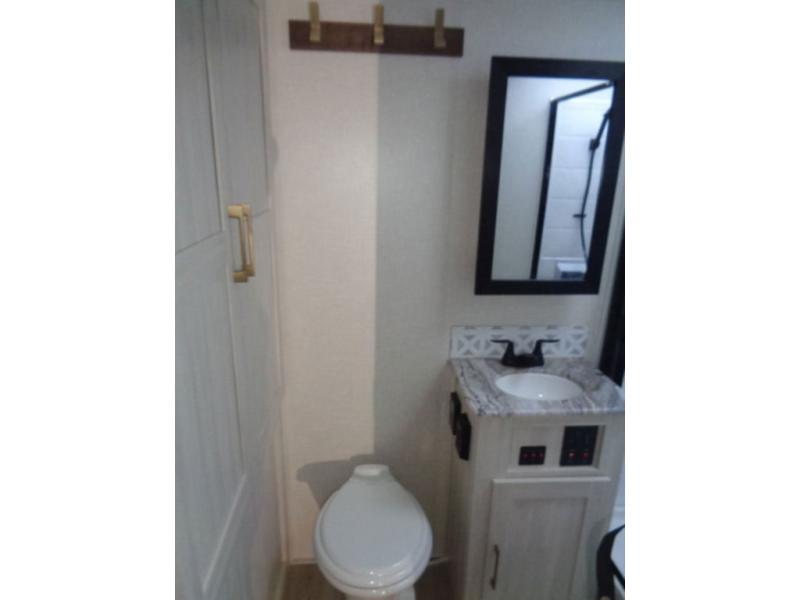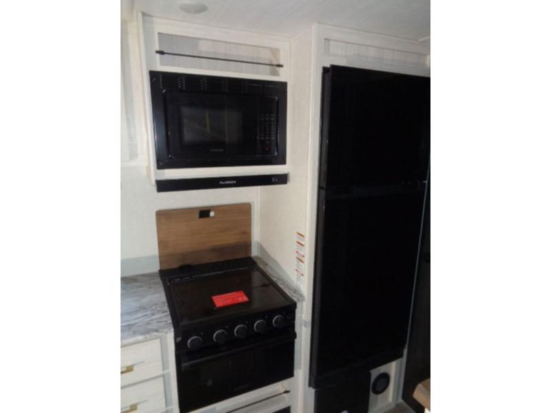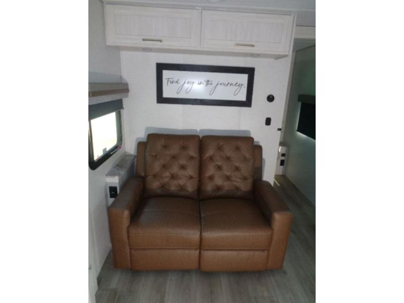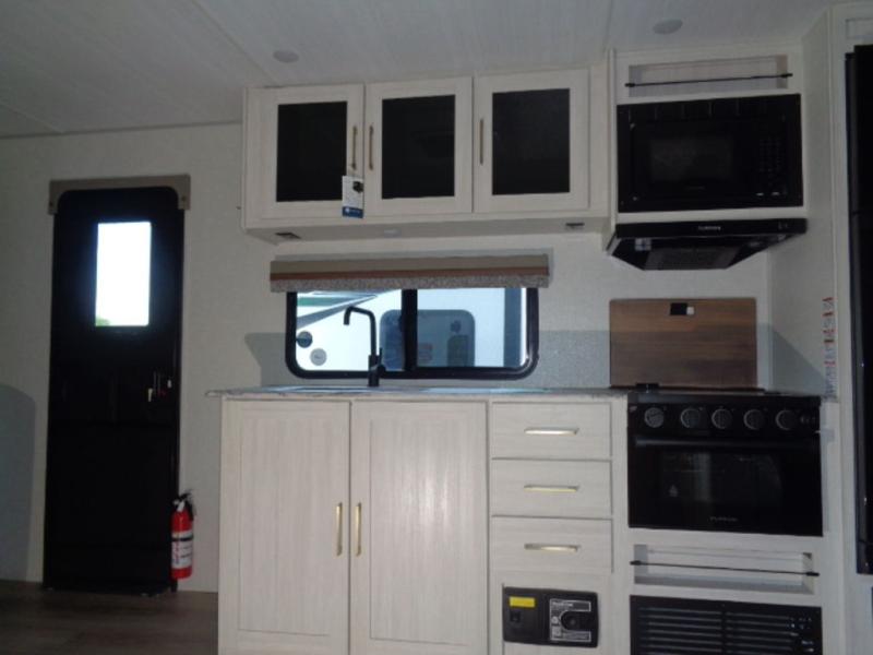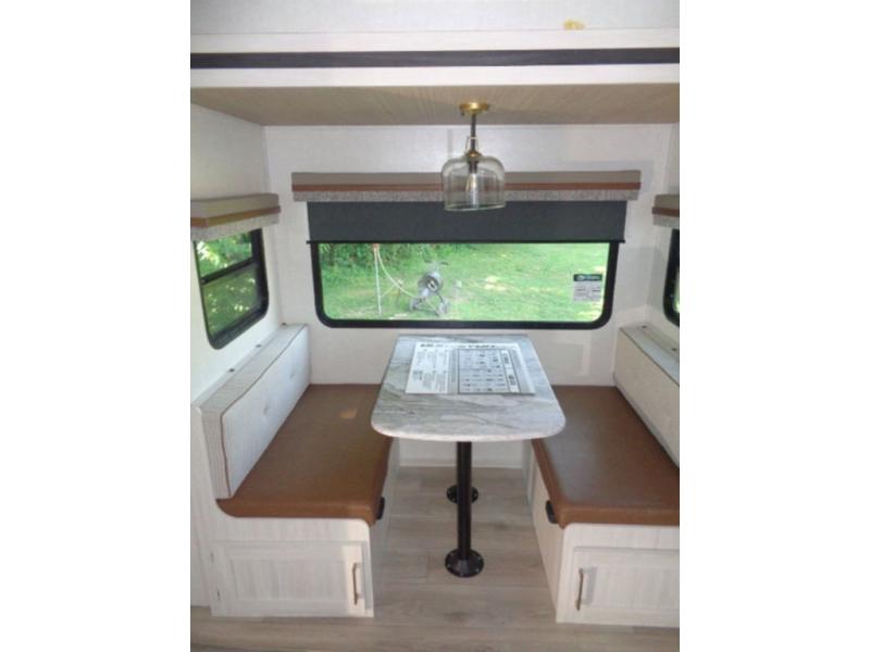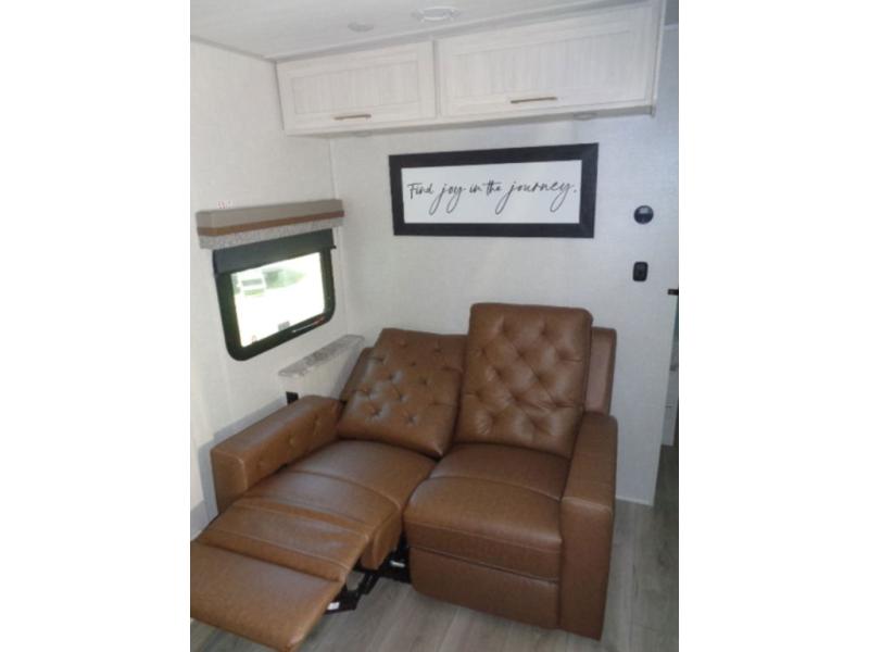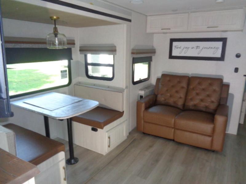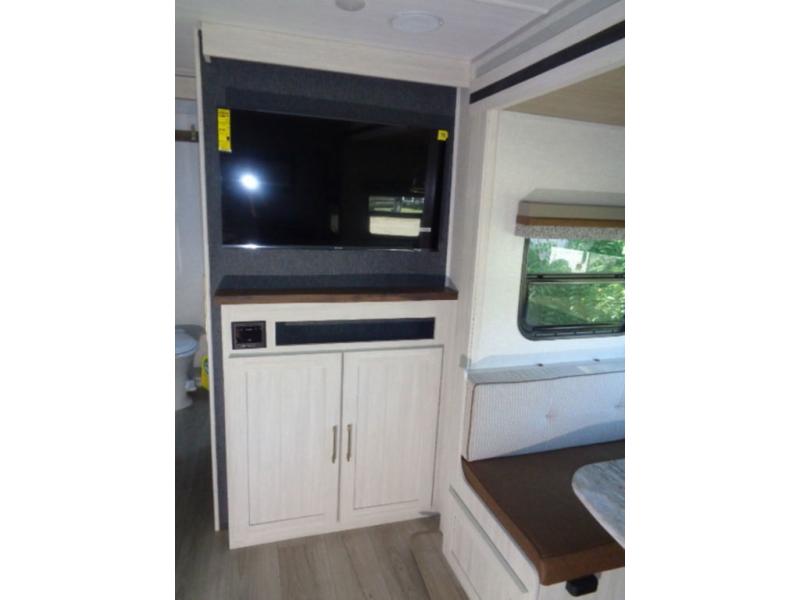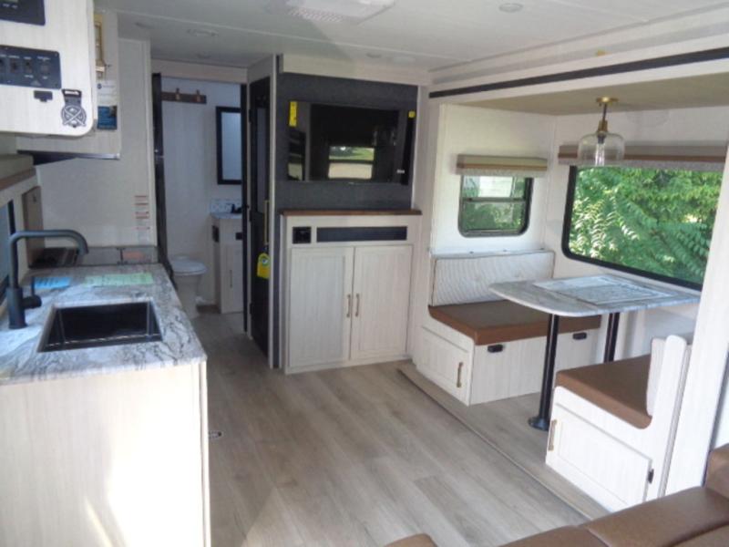 Whether you're camping with friends or family, you'll love the space and comfort found in this travel trailer. The outside kitchen is packed with features, such as a gas griddle, sink, refrigerator, and a shelf, plus there is a 21' electric awning for shade. Head inside to relax on the tri-fold sofa, or play a game at the booth dinette. You will also love the HD TV for your favorite shows at night. This model includes a full rear bath with a linen closet for clean towels and an upgraded slow-close shower door.