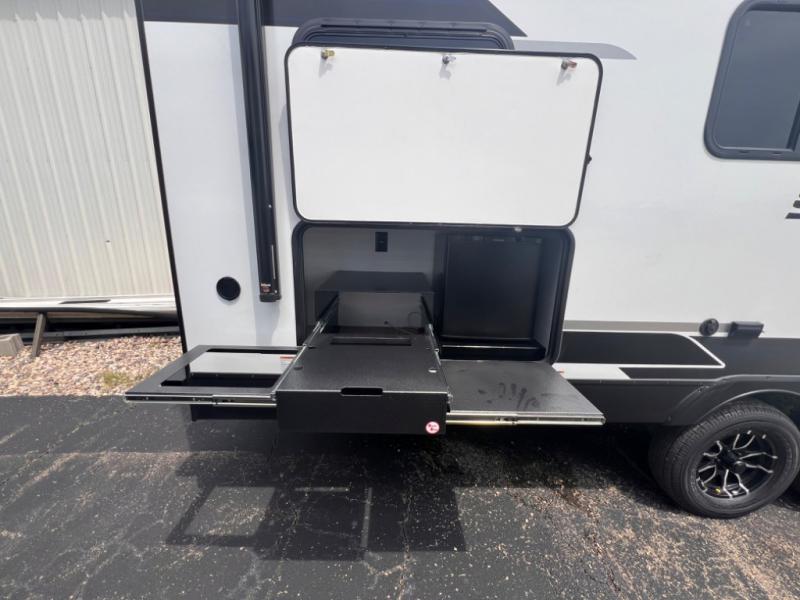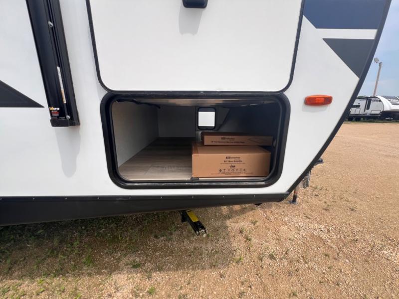 Every trip to the campground will be spent in comfort with this single slide out travel trailer. Once you arrive at the site, remove the kayaks or bikes from the rear storage door, start lunch on the outside kitchen, and put out the 15' power awning with LED lights. The interior includes a booth dinette slide with storage, a bar top with stools, plus an HD TV for movie nights. After a day of fun, head to the front private bedroom for a great night's rest on the queen bed, and you can store your belongings in the dual bedroom wardrobes!