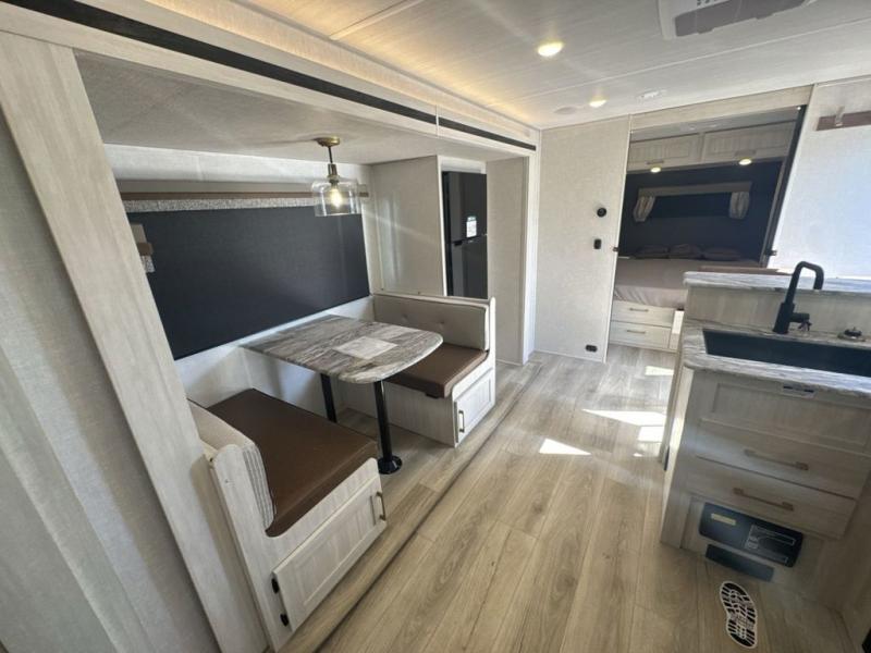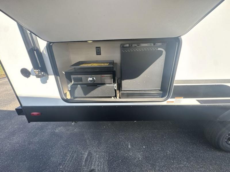 Every trip to the campground will be spent in comfort with this single slide out travel trailer. Once you arrive at the site, remove the kayaks or bikes from the rear storage door, start lunch on the outside kitchen, and put out the 15' power awning with LED lights. The interior includes a booth dinette slide with storage, a bar top with stools, plus an HD TV for movie nights. After a day of fun, head to the front private bedroom for a great night's rest on the queen bed, and you can store your belongings in the dual bedroom wardrobes!