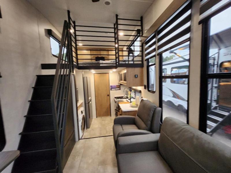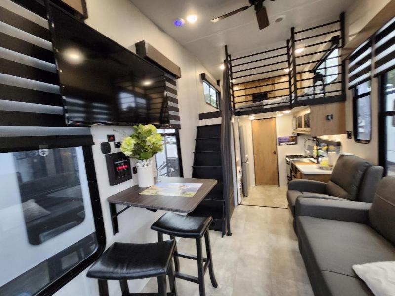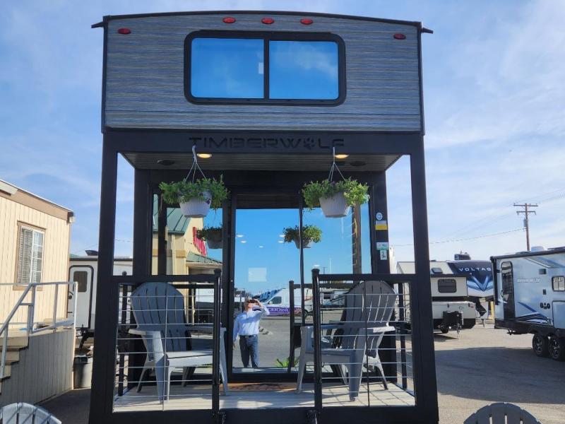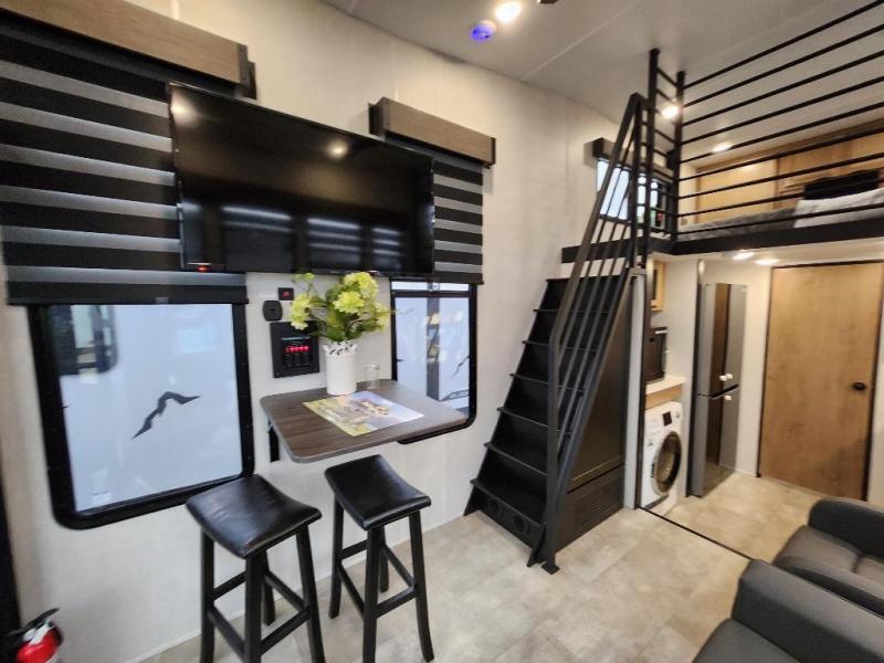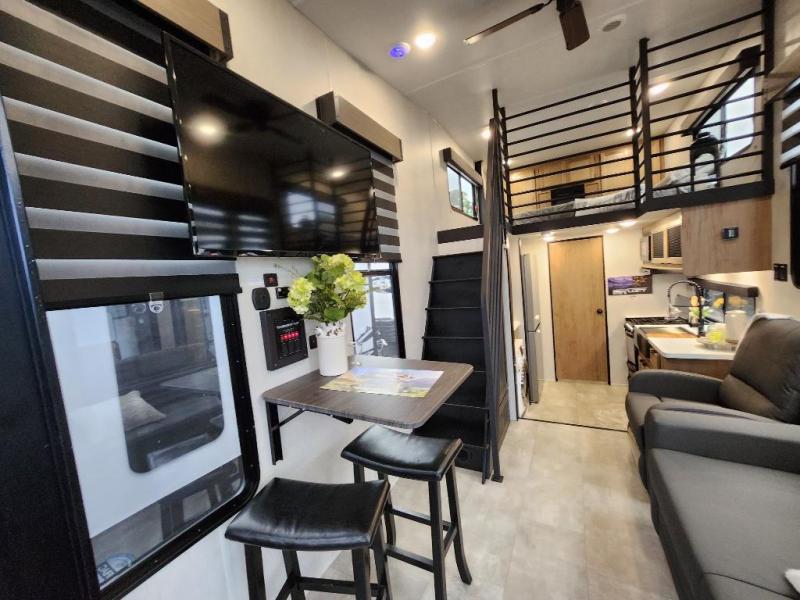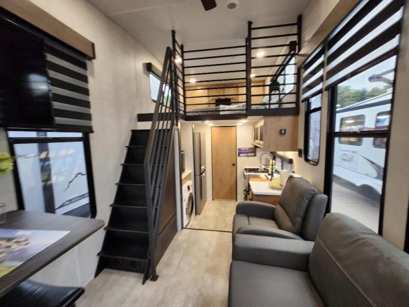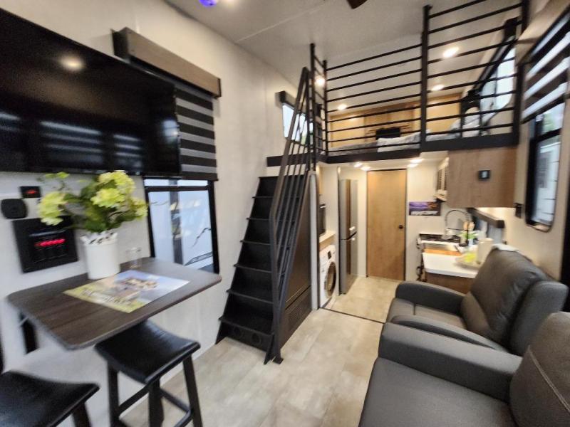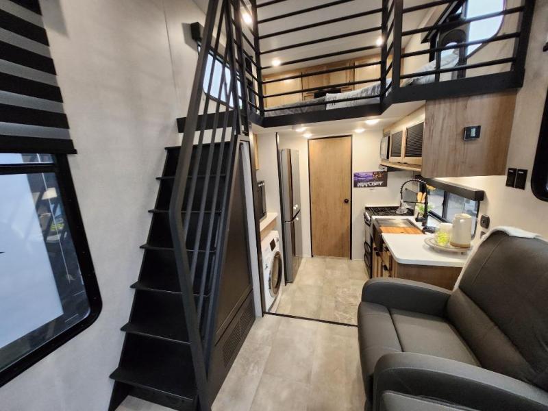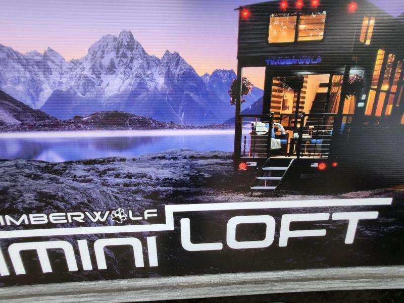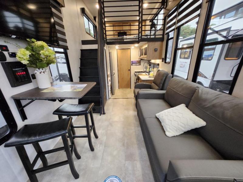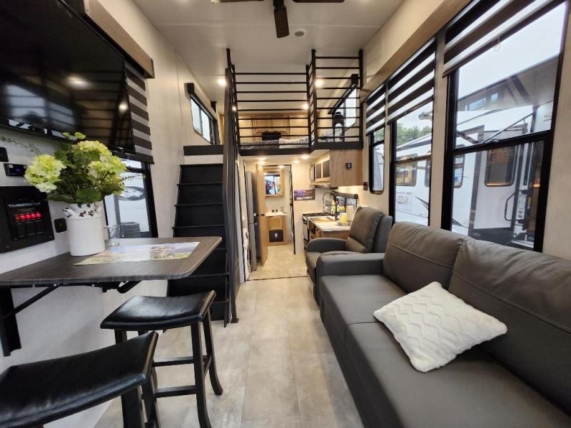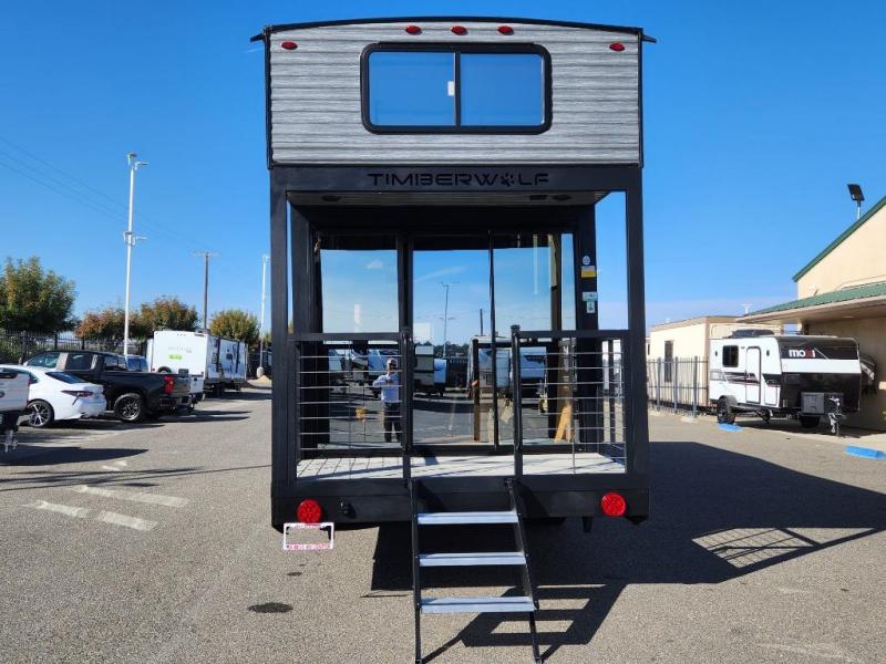 You will fall in love with this mini-loft Timberwolf that will feel more like a tiny home. There are steps leading up to the loft with a queen bed, cabinets, and even a fireplace! The kitchen includes a cooktop and a microwave oven to prepare meals, plus an 11 cu. ft. 12V residential refrigerator with Travel Lock. You'll enjoy relaxing on the 58" sofa, dining at the high top table, or reading a book on the lounge chair. There is also a rear deck with patio doors where you can spend your evenings together, and there is even a second loft above the deck for added sleeping or storage space!