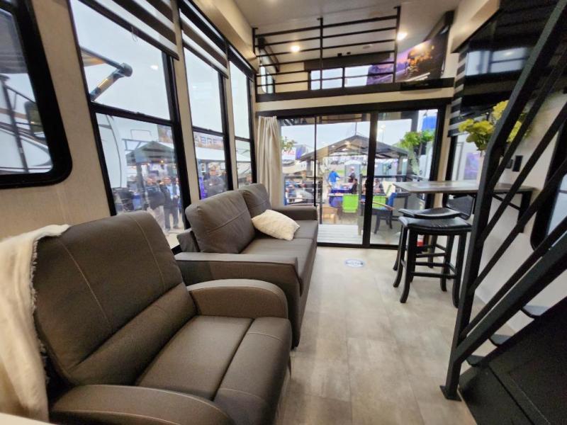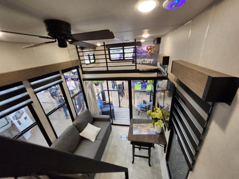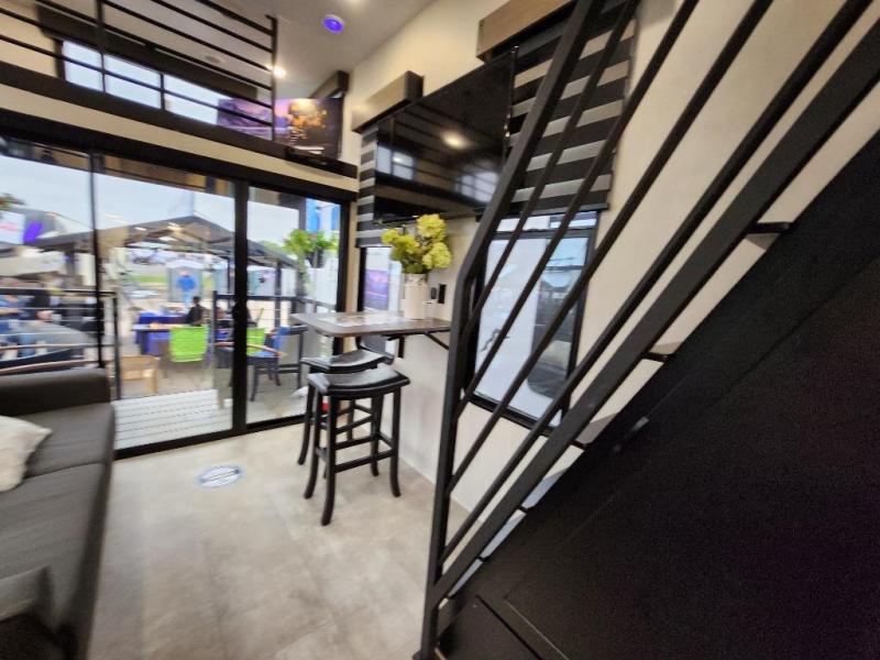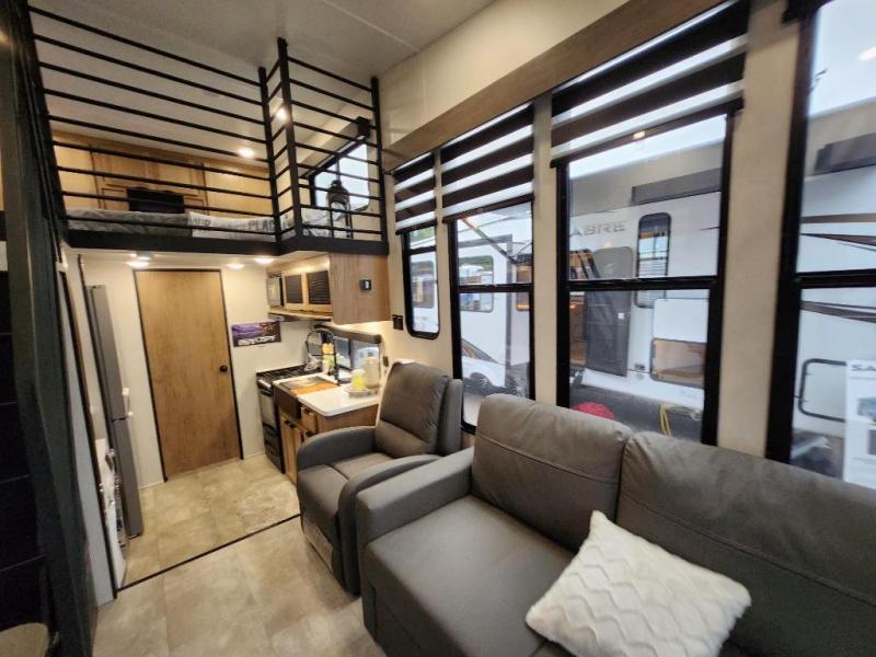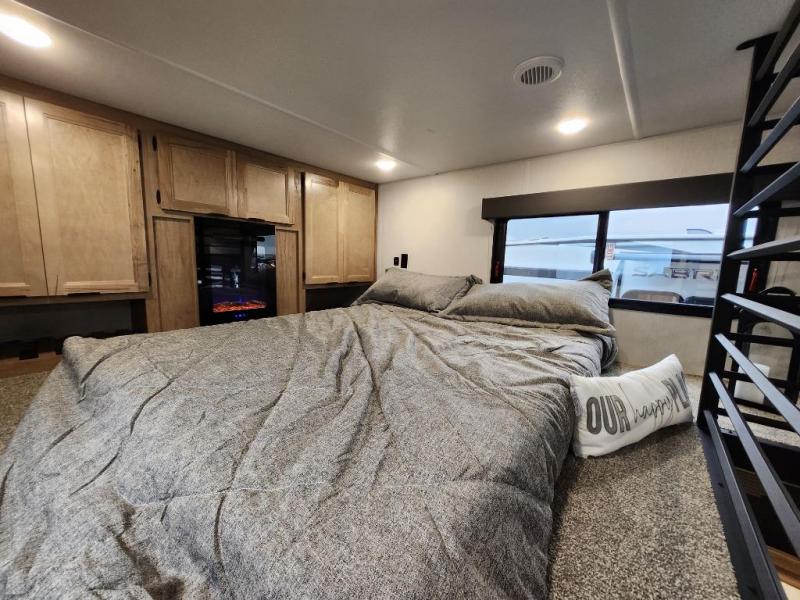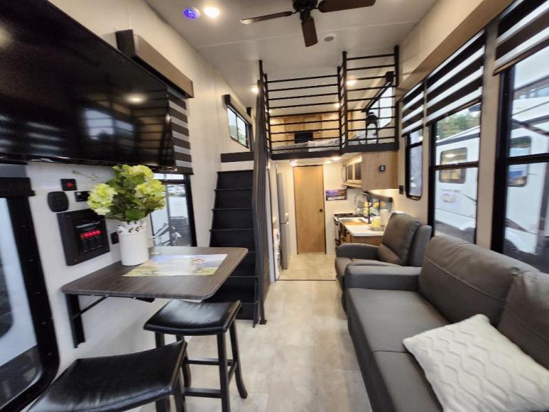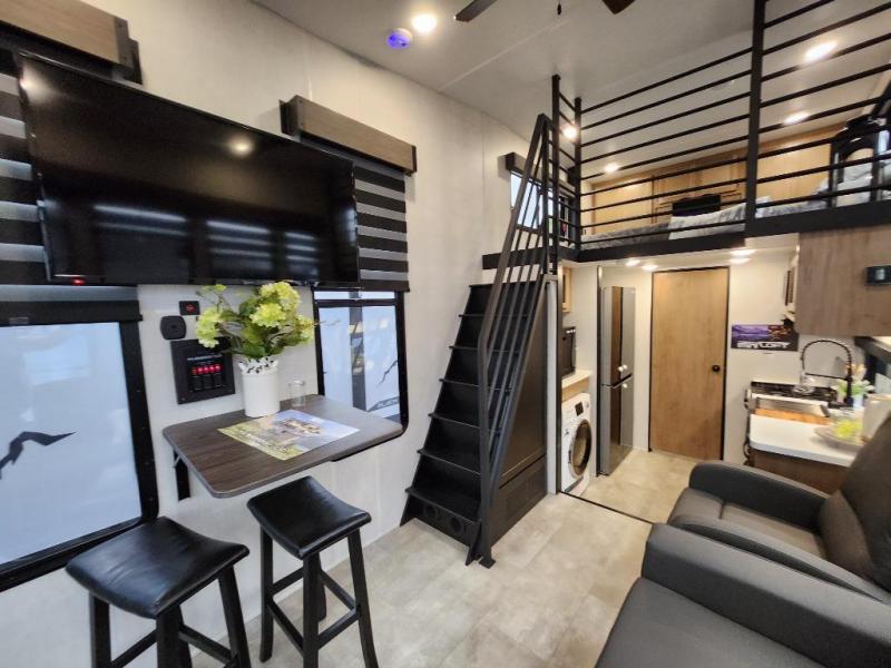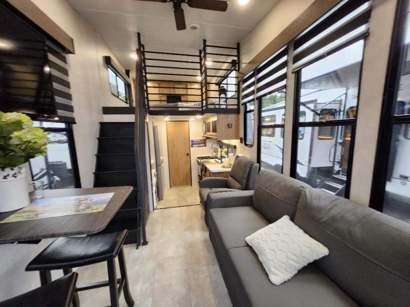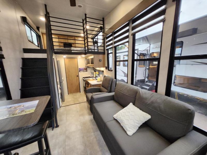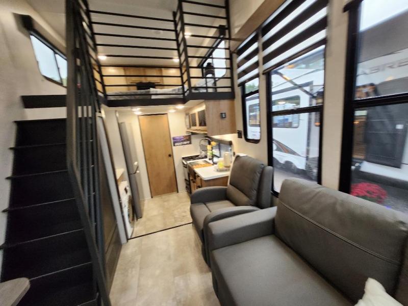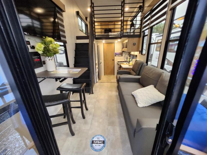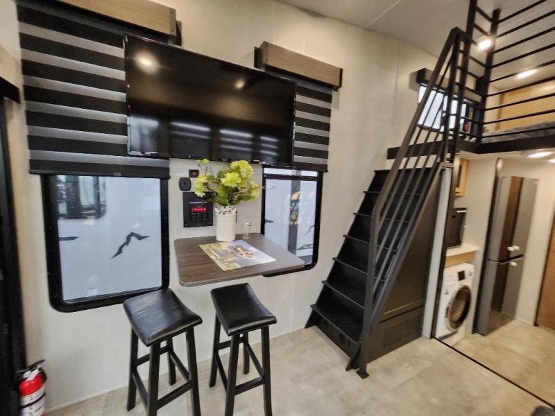 You will fall in love with this mini-loft Timberwolf that will feel more like a tiny home. There are steps leading up to the loft with a queen bed, cabinets, and even a fireplace! The kitchen includes a cooktop and a microwave oven to prepare meals, plus an 11 cu. ft. 12V residential refrigerator with Travel Lock. You'll enjoy relaxing on the 58" sofa, dining at the high top table, or reading a book on the lounge chair. There is also a rear deck with patio doors where you can spend your evenings together, and there is even a second loft above the deck for added sleeping or storage space!