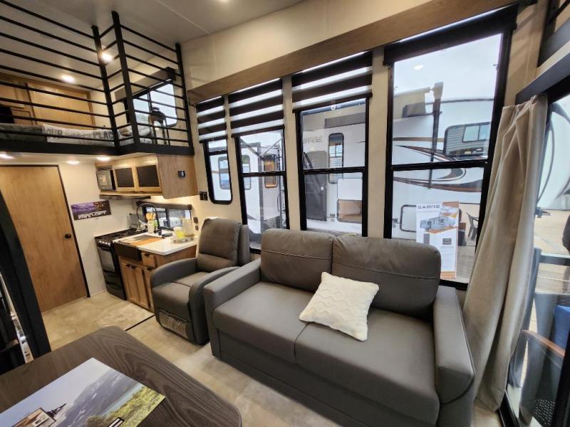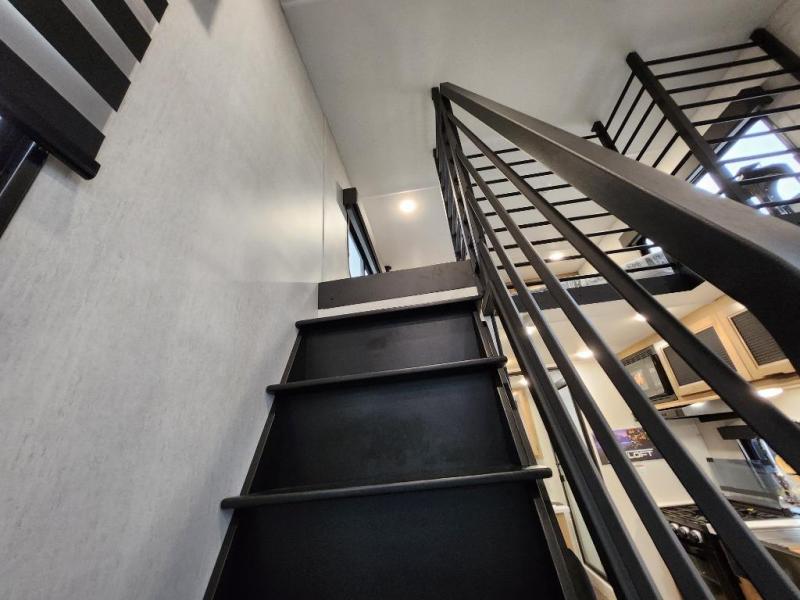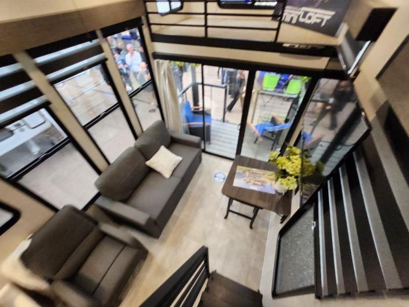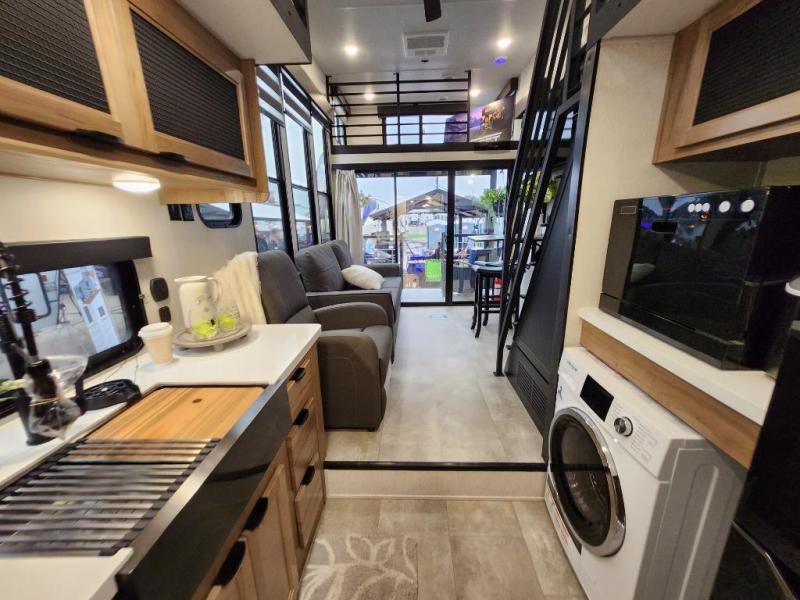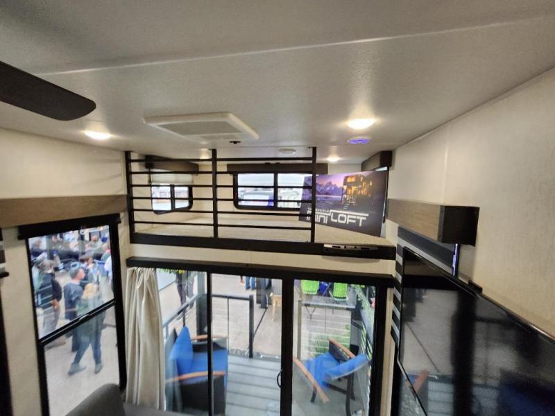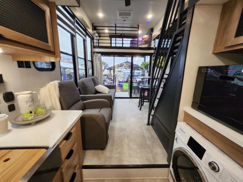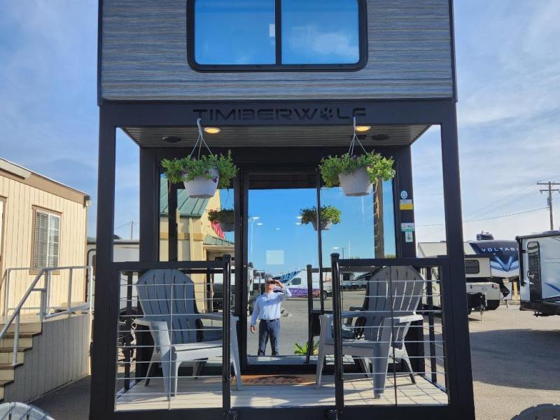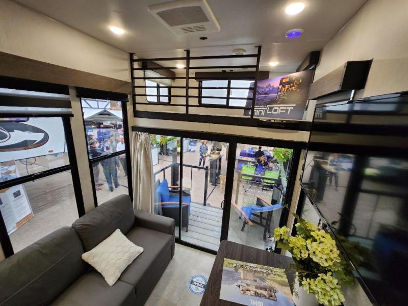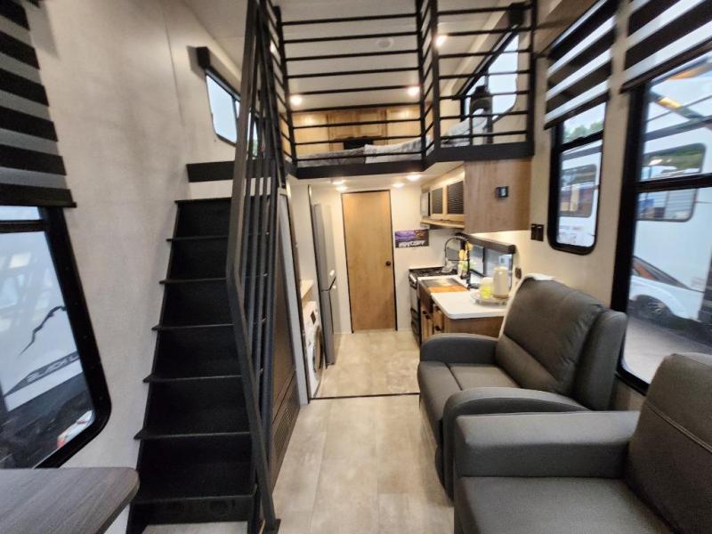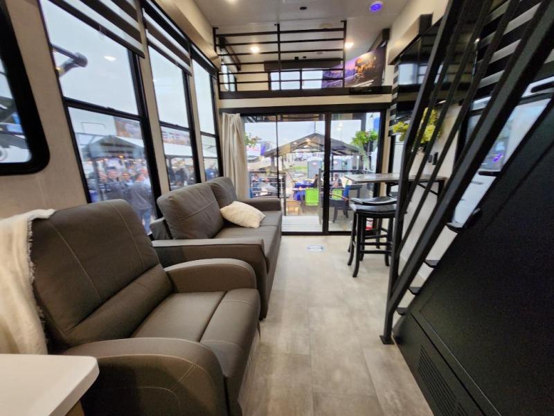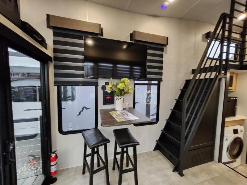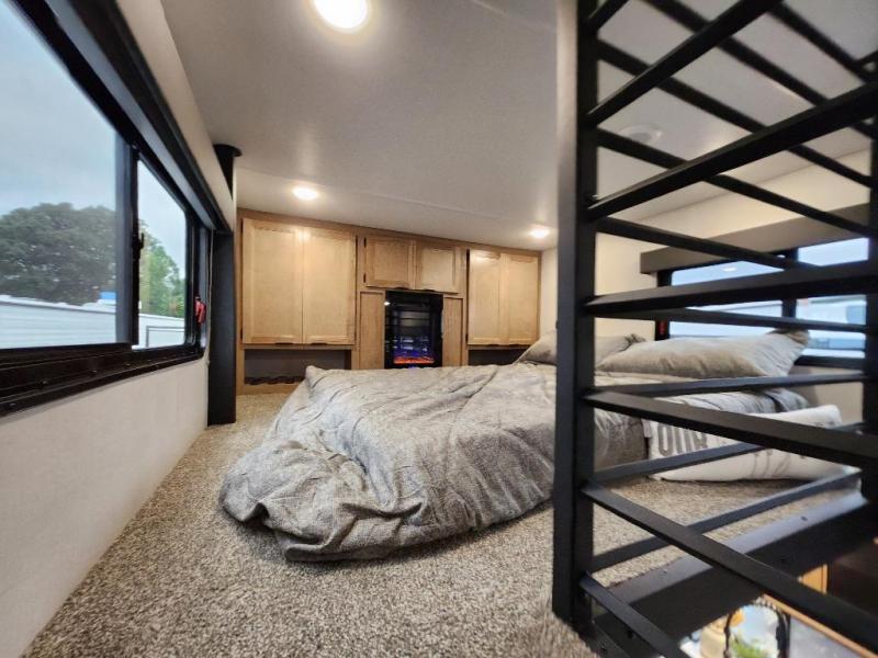 You will fall in love with this mini-loft Timberwolf that will feel more like a tiny home. There are steps leading up to the loft with a queen bed, cabinets, and even a fireplace! The kitchen includes a cooktop and a microwave oven to prepare meals, plus an 11 cu. ft. 12V residential refrigerator with Travel Lock. You'll enjoy relaxing on the 58" sofa, dining at the high top table, or reading a book on the lounge chair. There is also a rear deck with patio doors where you can spend your evenings together, and there is even a second loft above the deck for added sleeping or storage space!