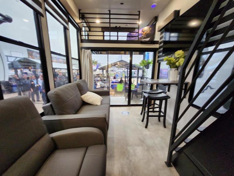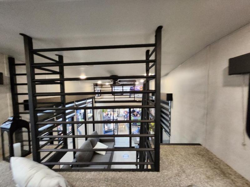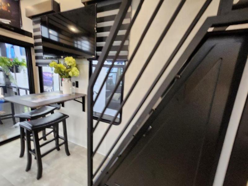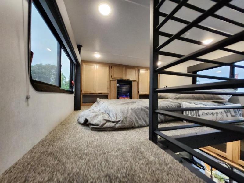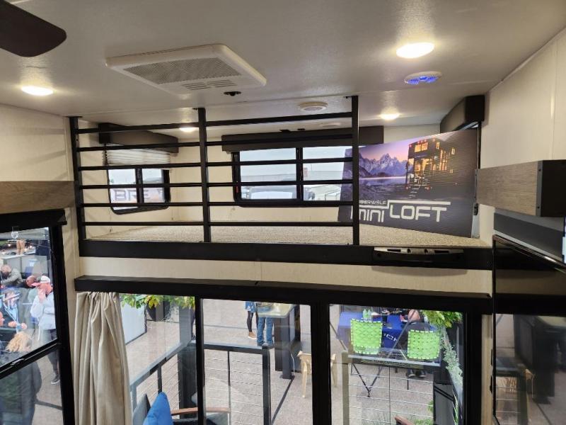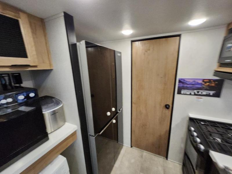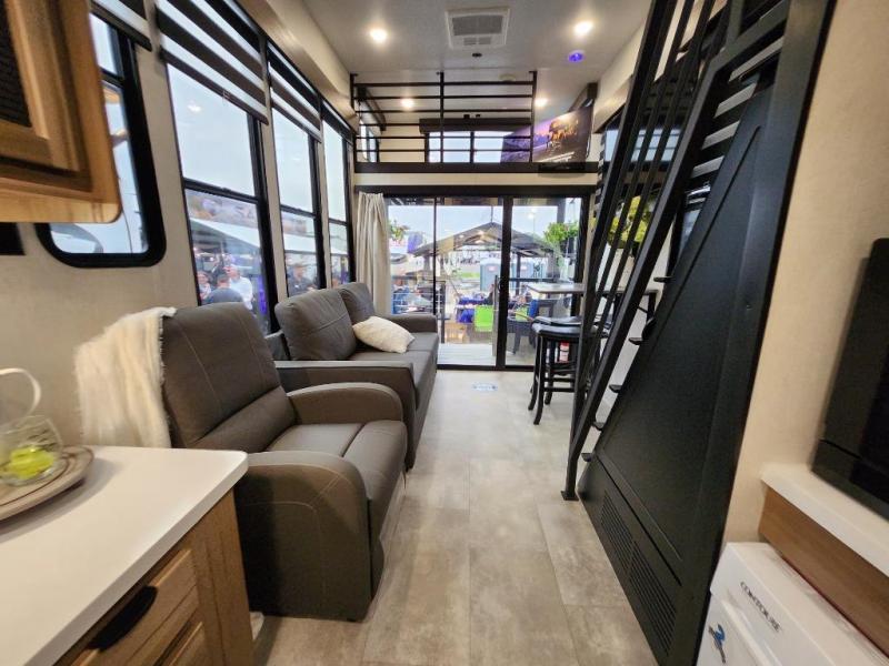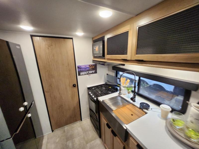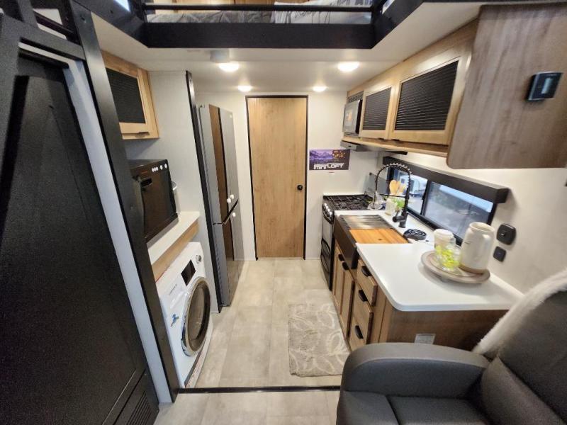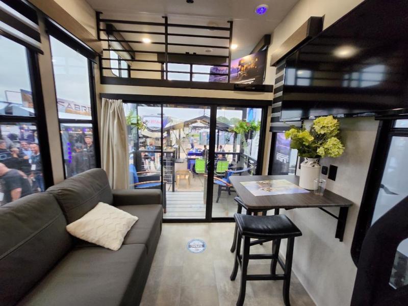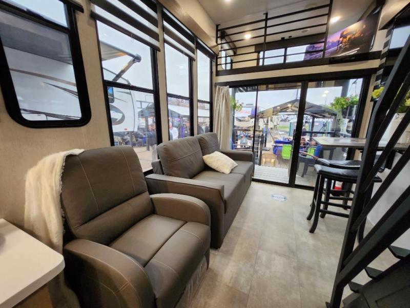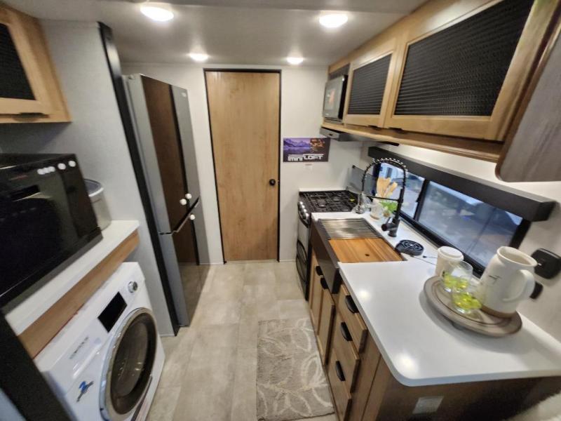 You will fall in love with this mini-loft Timberwolf that will feel more like a tiny home. There are steps leading up to the loft with a queen bed, cabinets, and even a fireplace! The kitchen includes a cooktop and a microwave oven to prepare meals, plus an 11 cu. ft. 12V residential refrigerator with Travel Lock. You'll enjoy relaxing on the 58" sofa, dining at the high top table, or reading a book on the lounge chair. There is also a rear deck with patio doors where you can spend your evenings together, and there is even a second loft above the deck for added sleeping or storage space!