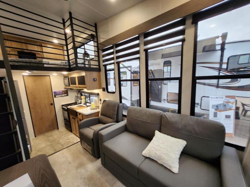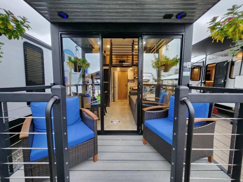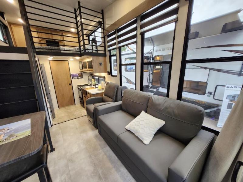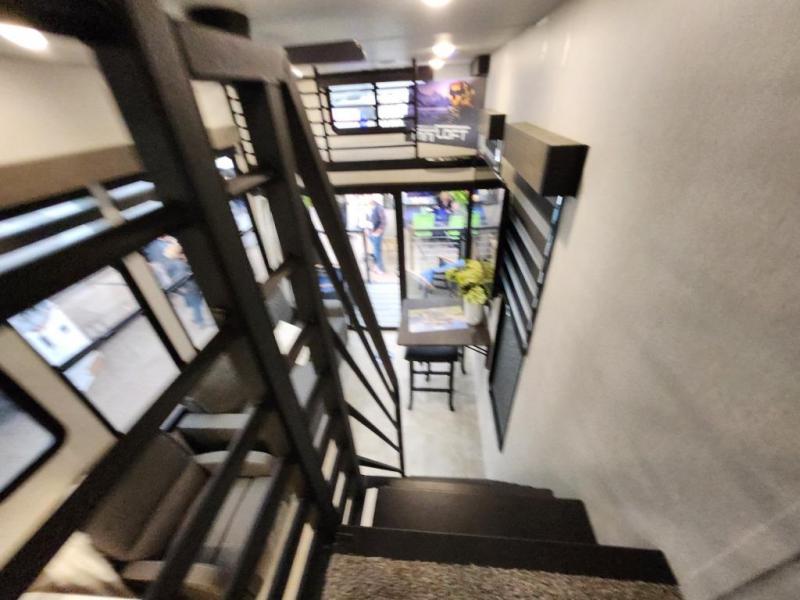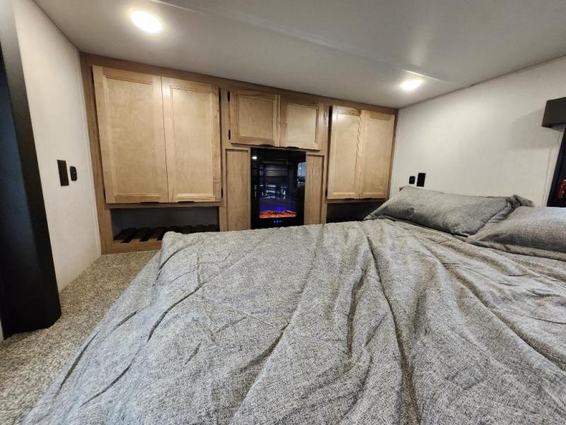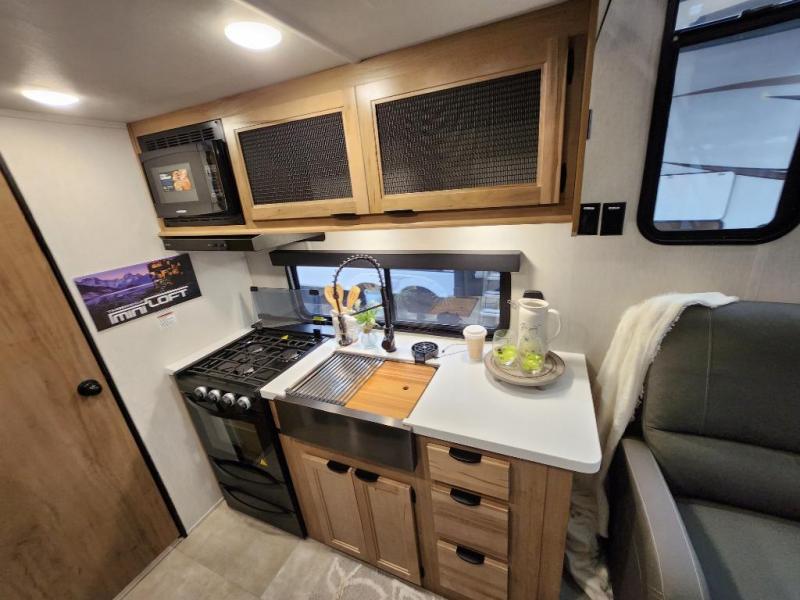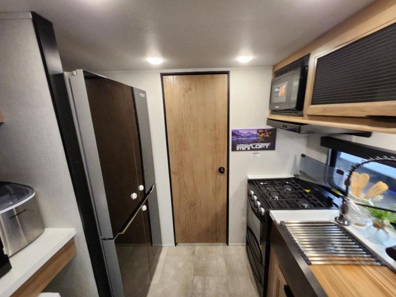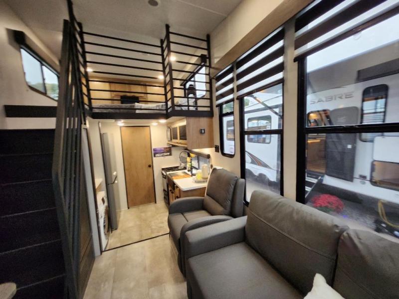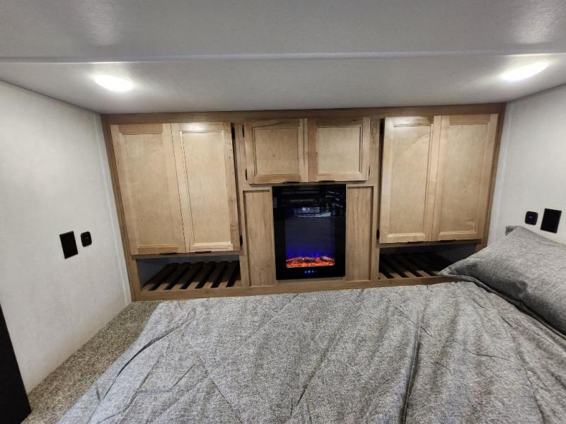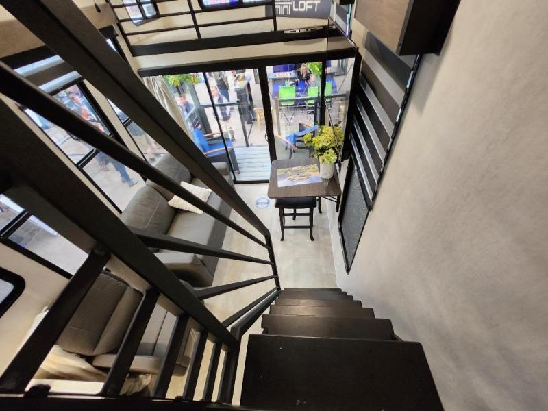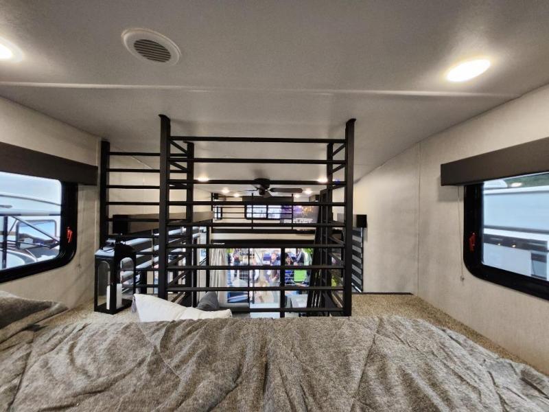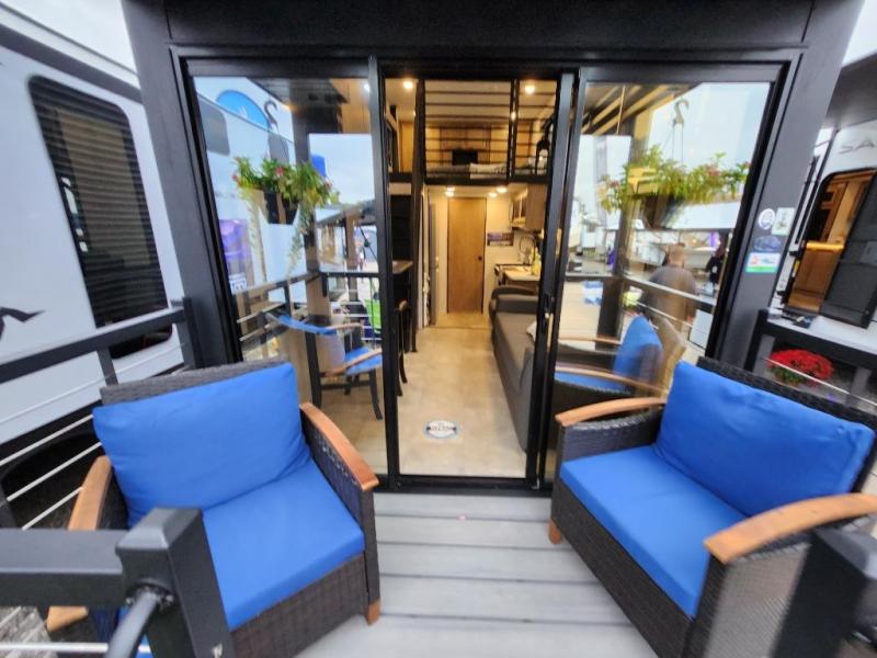 You will fall in love with this mini-loft Timberwolf that will feel more like a tiny home. There are steps leading up to the loft with a queen bed, cabinets, and even a fireplace! The kitchen includes a cooktop and a microwave oven to prepare meals, plus an 11 cu. ft. 12V residential refrigerator with Travel Lock. You'll enjoy relaxing on the 58" sofa, dining at the high top table, or reading a book on the lounge chair. There is also a rear deck with patio doors where you can spend your evenings together, and there is even a second loft above the deck for added sleeping or storage space!