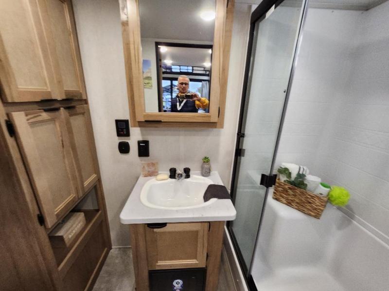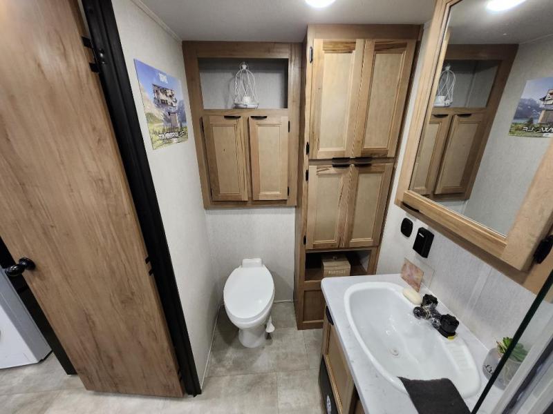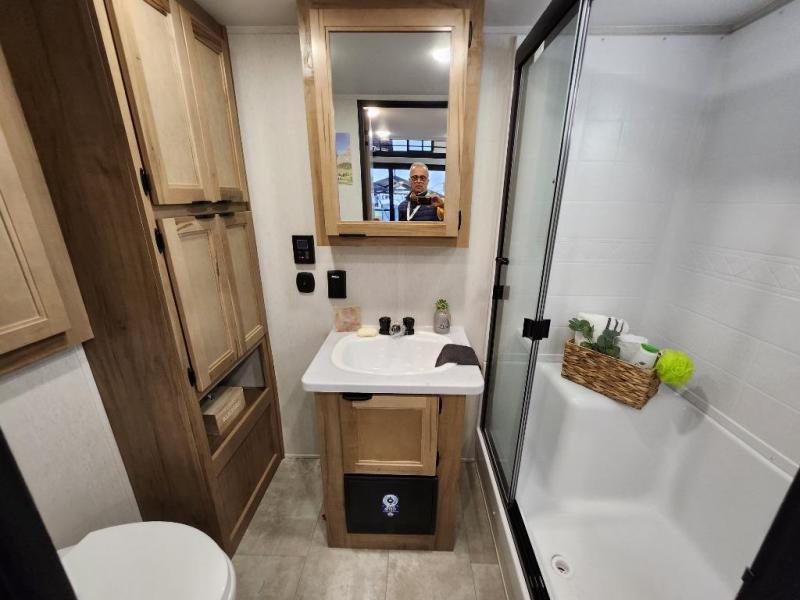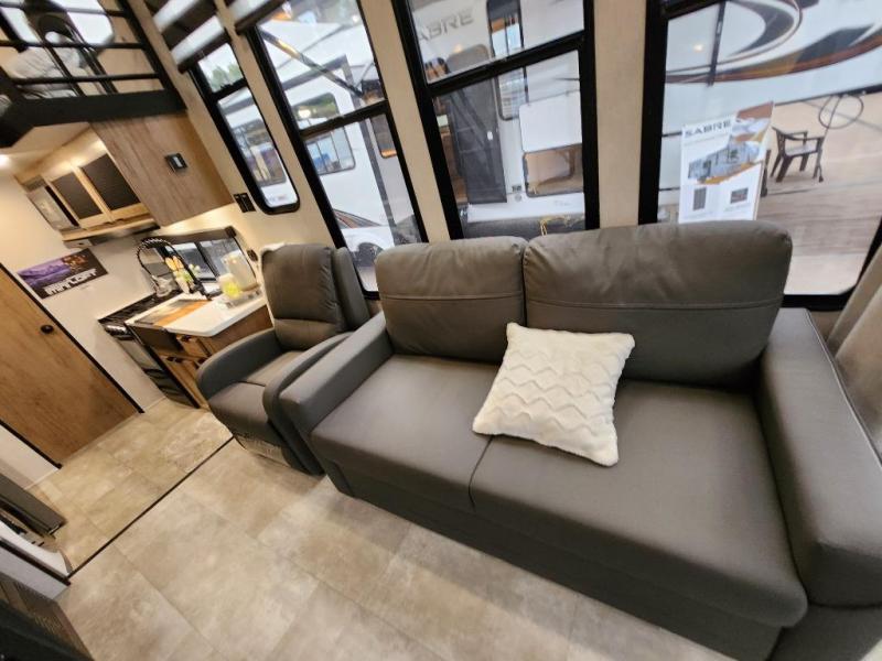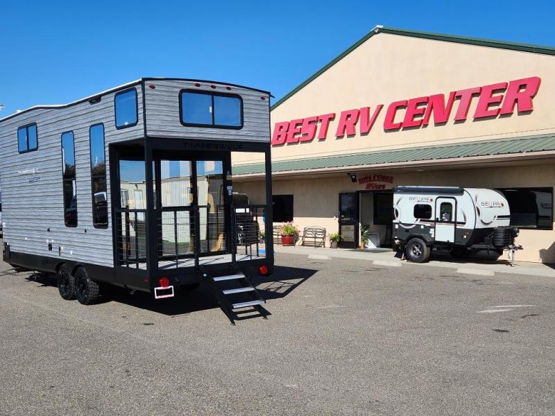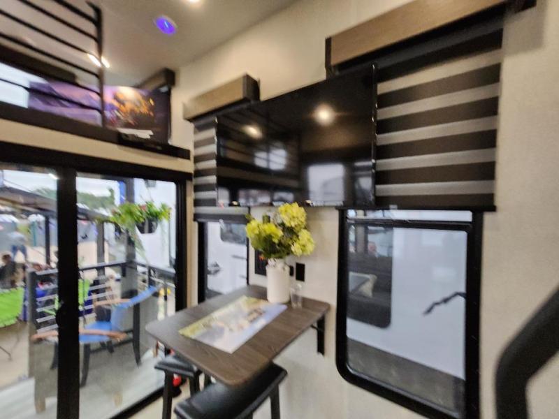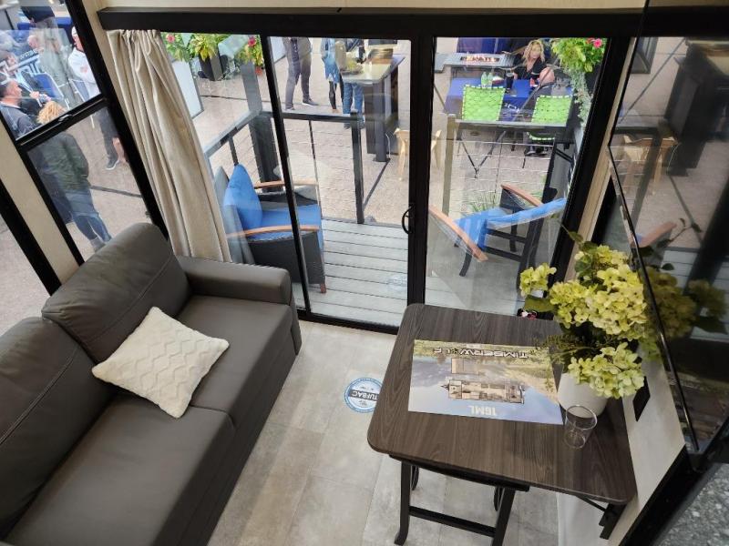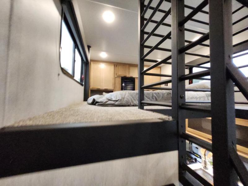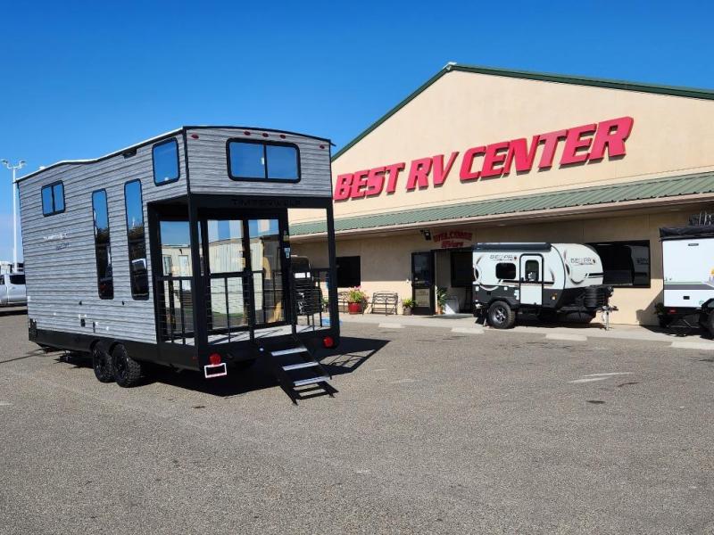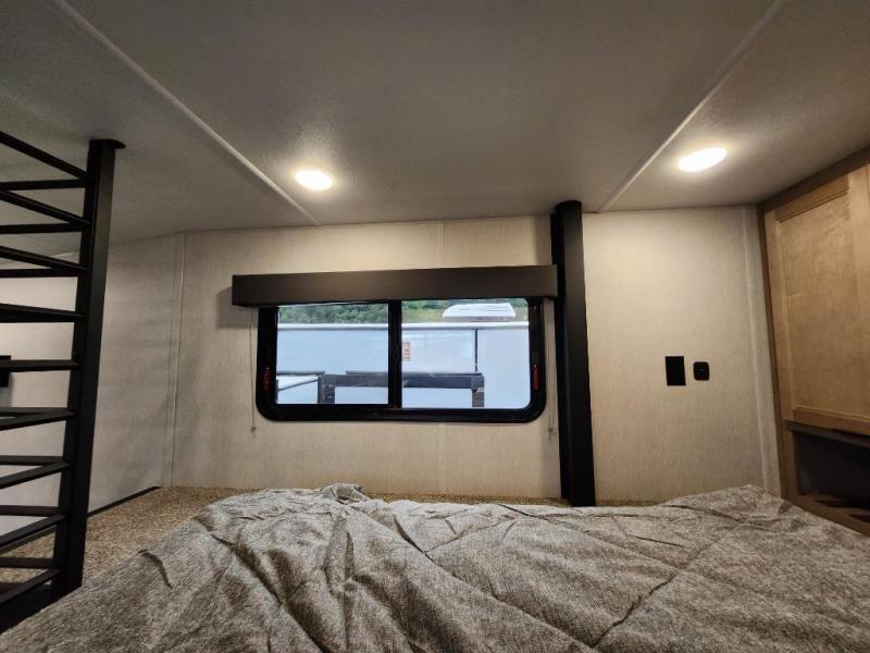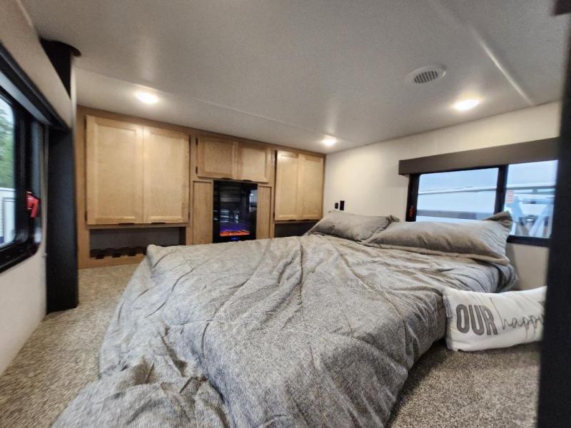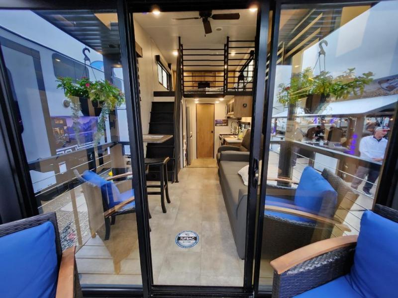 You will fall in love with this mini-loft Timberwolf that will feel more like a tiny home. There are steps leading up to the loft with a queen bed, cabinets, and even a fireplace! The kitchen includes a cooktop and a microwave oven to prepare meals, plus an 11 cu. ft. 12V residential refrigerator with Travel Lock. You'll enjoy relaxing on the 58" sofa, dining at the high top table, or reading a book on the lounge chair. There is also a rear deck with patio doors where you can spend your evenings together, and there is even a second loft above the deck for added sleeping or storage space!