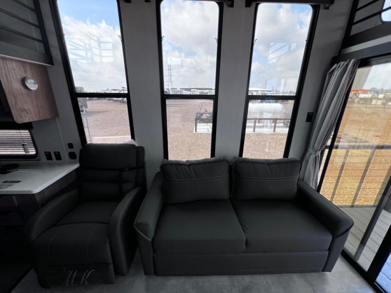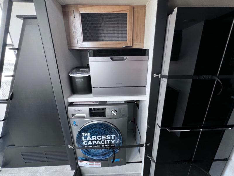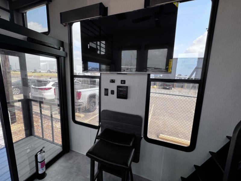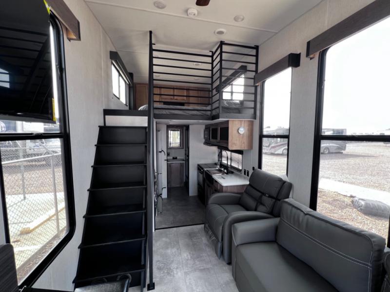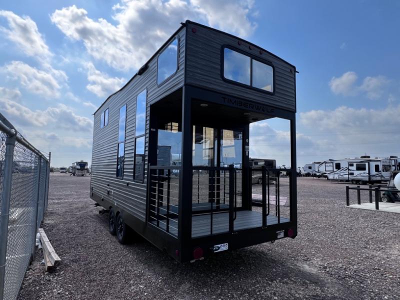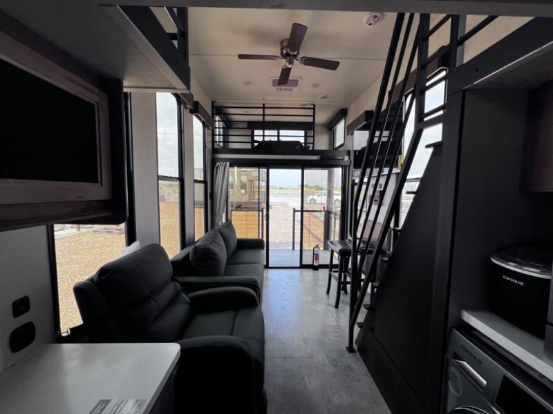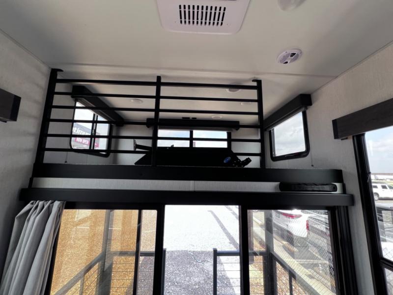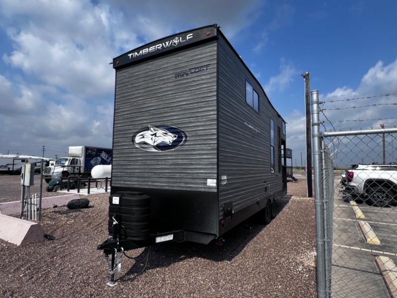 You will fall in love with this mini-loft Timberwolf that will feel more like a tiny home. There are steps leading up to the loft with a queen bed, cabinets, and even a fireplace! The kitchen includes a cooktop and a microwave oven to prepare meals, plus a refrigerator to keep perishables fresh. You'll enjoy relaxing on the 58" sofa, dining at the high top table, or reading a book on the lounge chair. There is also a rear deck with patio doors where you can spend your evenings together, and there is even a second loft above the deck for added sleeping or storage space!