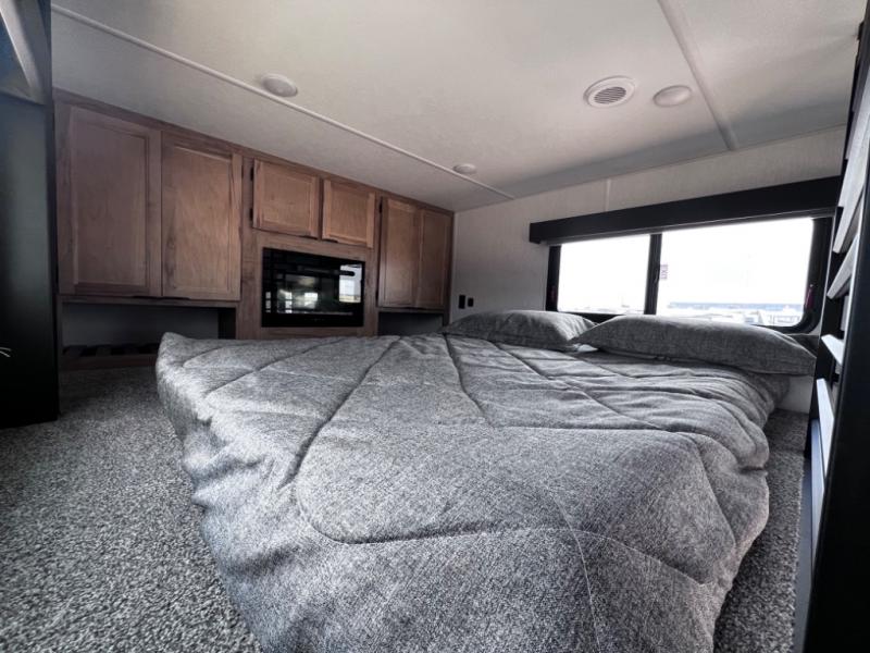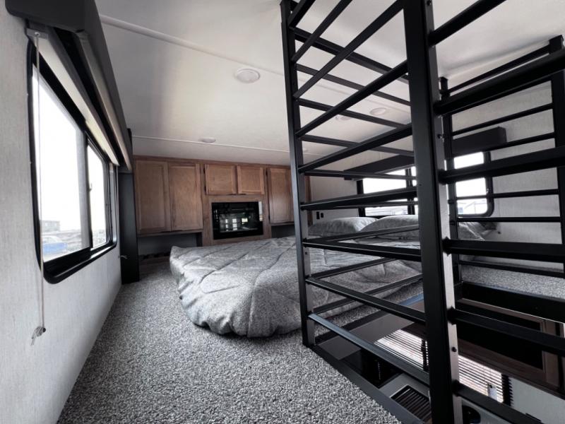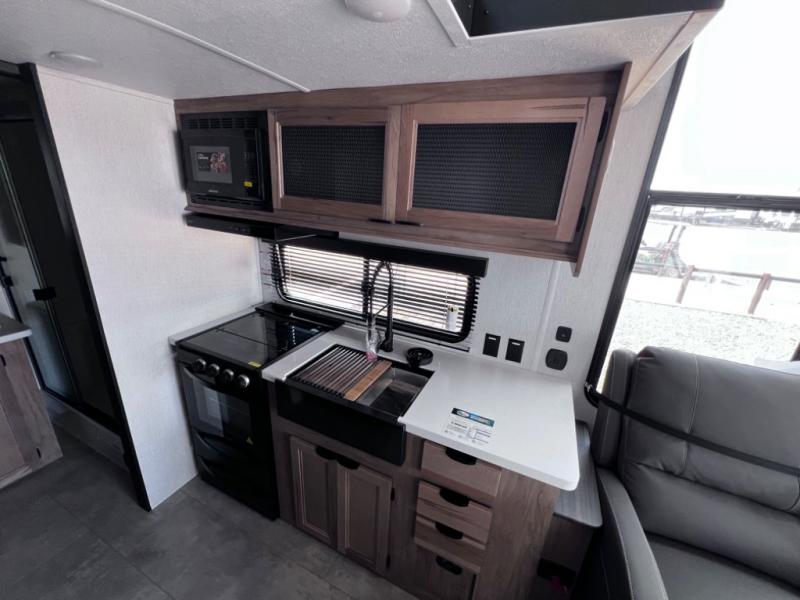 Enjoy comforts of home wherever you decide to roam in a Timberwolf destination trailer by Forest River. The seamless roofing membrane with heat reflectivity and power gear frame technology provide a durable foundation to your RV. You will also appreciate the exclusive solar thermo controlled reflective tinted safety glass windows, tire pressure monitors, and an on-demand tankless water heater to make extended stays easier than ever. Inside, the night shades will provide your crew with privacy, while the LED lights illuminate your space. There are also light filtering sheer shading premium zebra blinds, along with a premium bedding ensemble and comforter, USB charging stations, a supersized central A/C unit, and many more comforts!