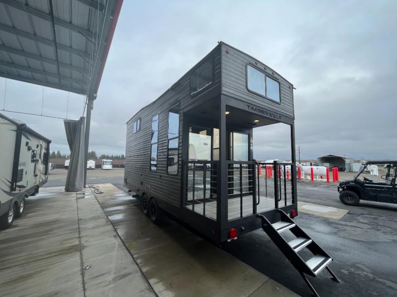 You will fall in love with this mini-loft Timberwolf that will feel more like a tiny home. There are steps leading up to the loft with a queen bed, cabinets, and even a fireplace! The kitchen includes a cooktop and a microwave oven to prepare meals, plus a refrigerator to keep perishables fresh. You'll enjoy relaxing on the 58" sofa, dining at the high top table, or reading a book on the lounge chair. There is also a rear deck with patio doors where you can spend your evenings together, and there is even a second loft above the deck for added sleeping or storage space!