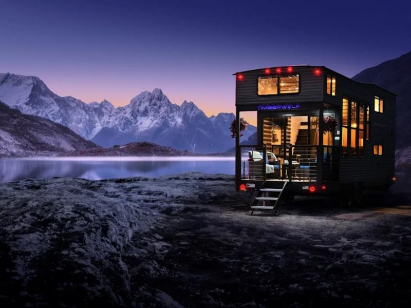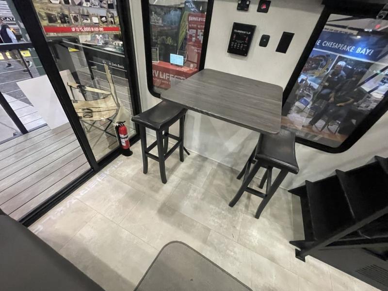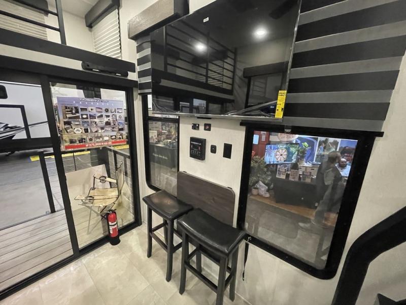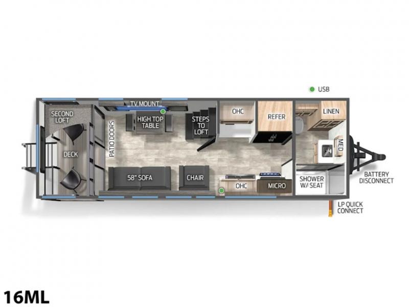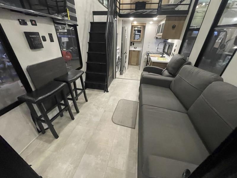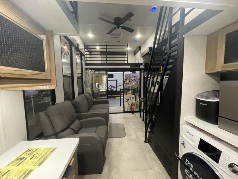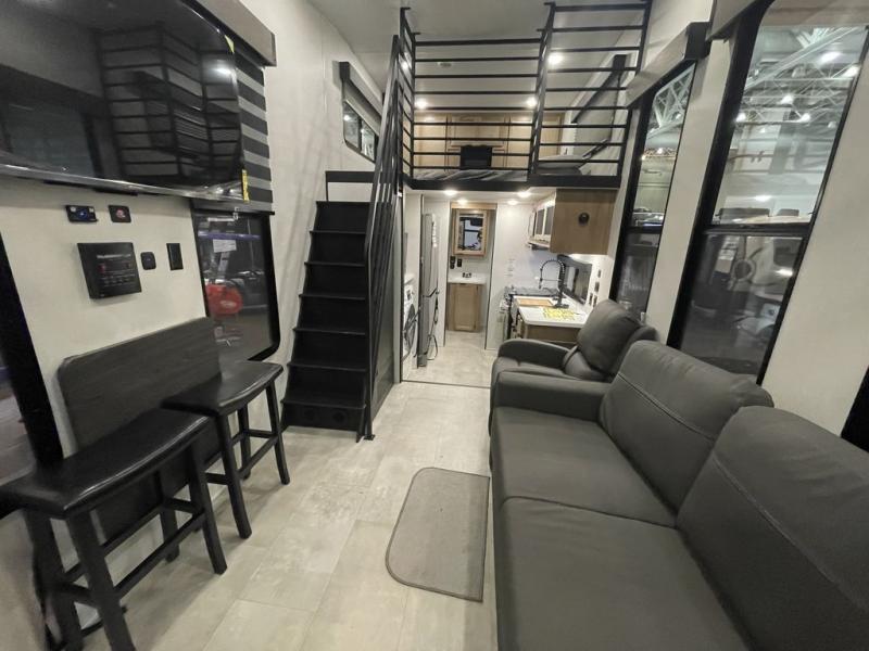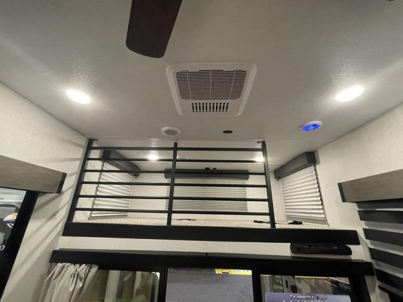 You will fall in love with this mini-loft Timberwolf that will feel more like a tiny home. There are steps leading up to the loft with a queen bed, cabinets, and even a fireplace! The kitchen includes a cooktop and a microwave oven to prepare meals, plus a refrigerator to keep perishables fresh. You'll enjoy relaxing on the 58" sofa, dining at the high top table, or reading a book on the lounge chair. There is also a rear deck with patio doors where you can spend your evenings together, and there is even a second loft above the deck for added sleeping or storage space!