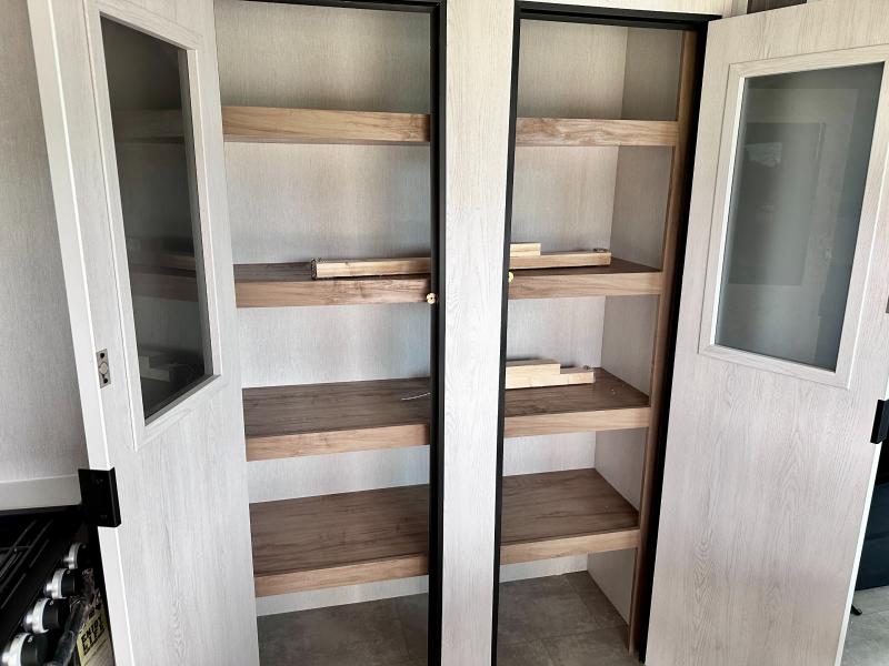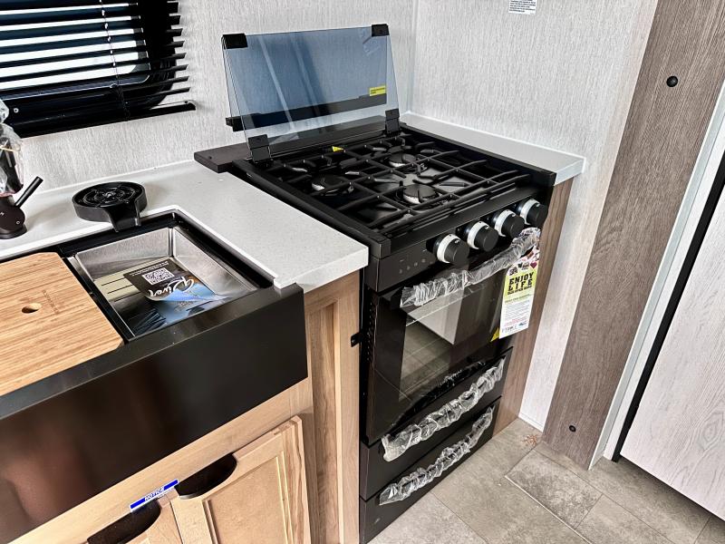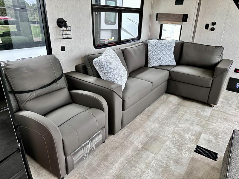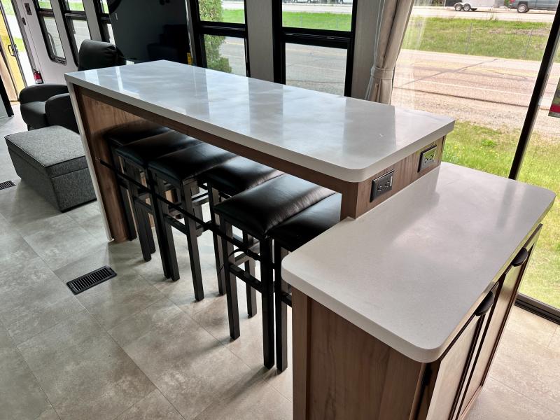 Time spent in this destination trailer will be time well spent! You will appreciate triple entry doors for maximum convenience, plus a spacious full bath that is close by the front private bedroom! Your crew can relax in the middle living area on the L-shaped sofa, or play a game at the free-standing table with chairs. The rear kitchen will be any chef's dream with its island with three stools and all the appliances to create meals each day. This model also features triple slides so you can enjoy more space to relax!