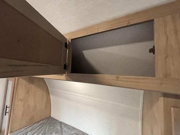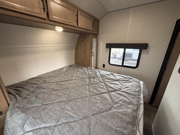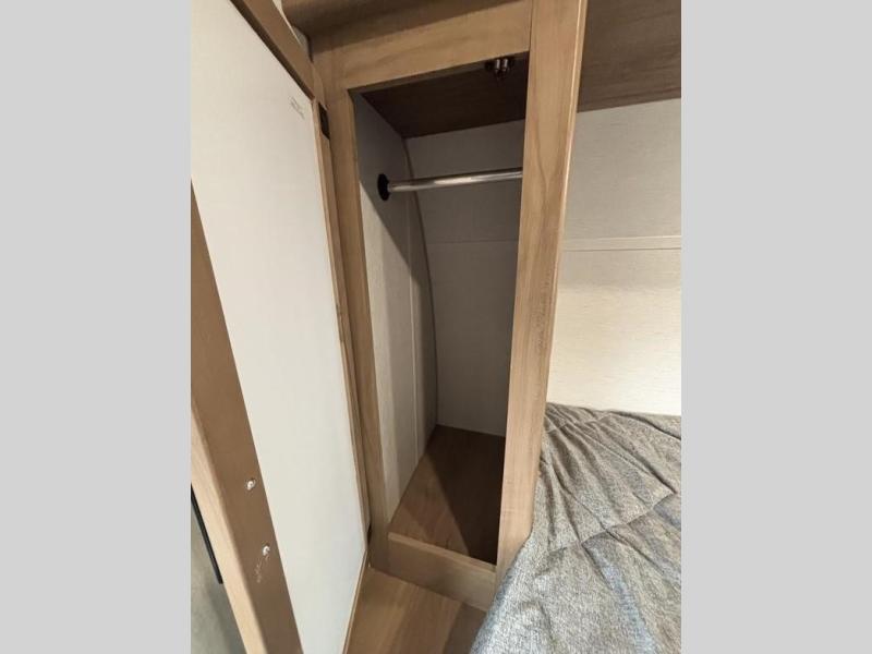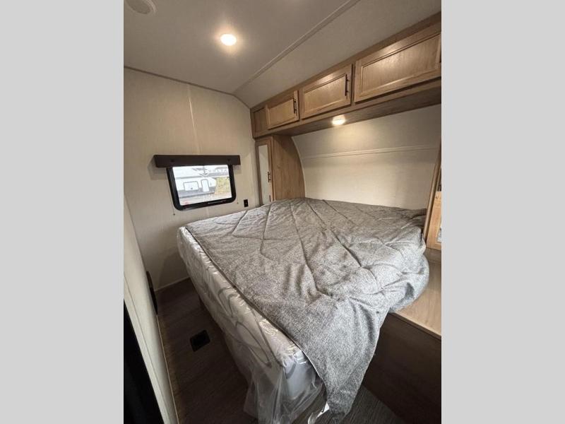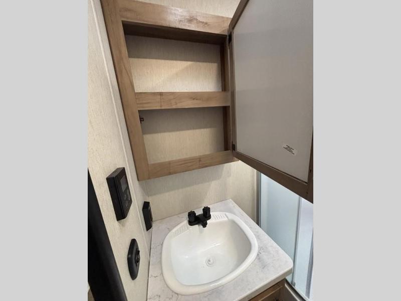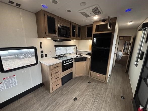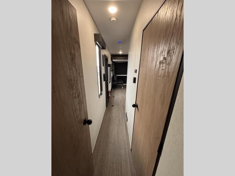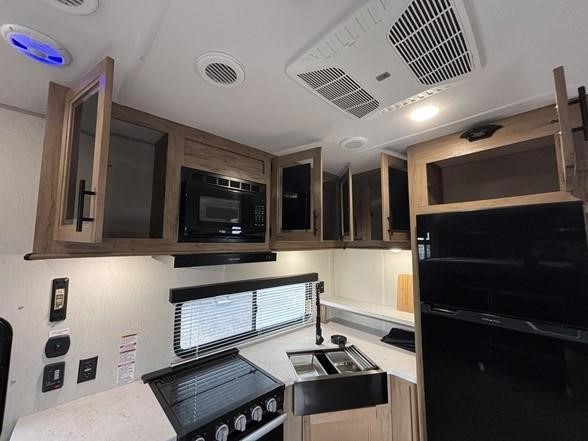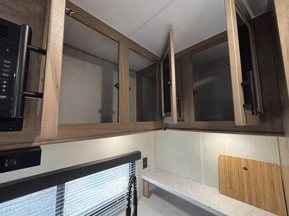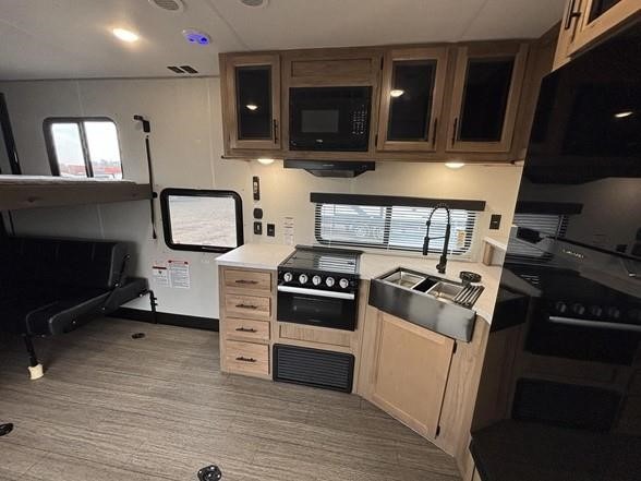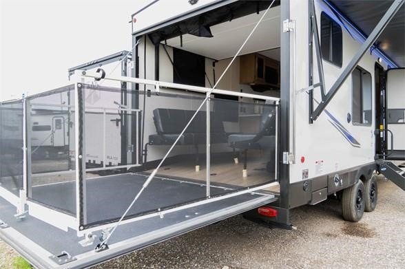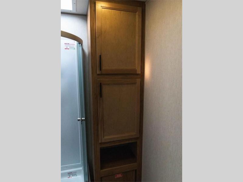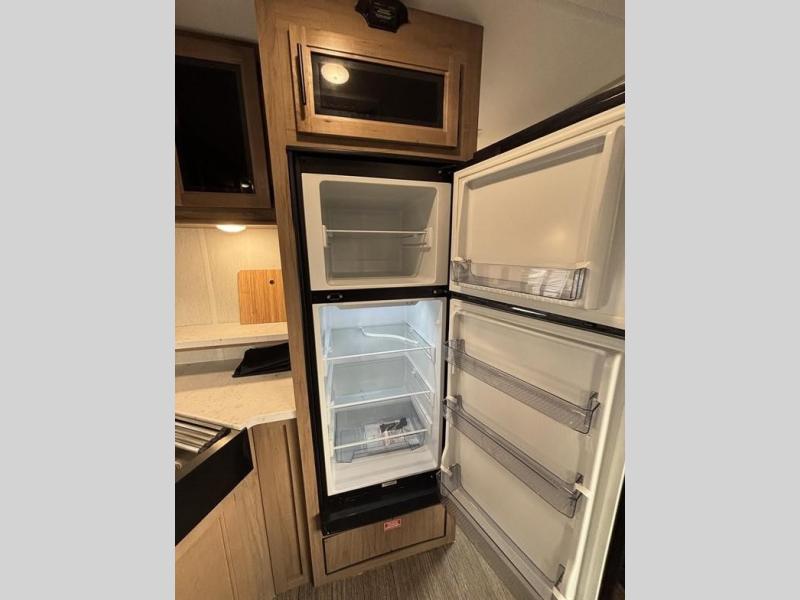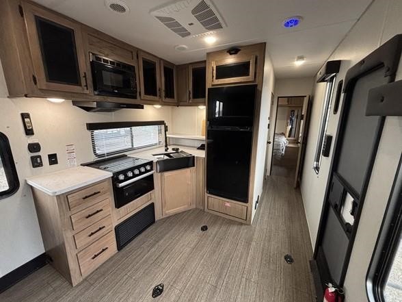 You'll love camping in this toy hauler with 14' 1" total garage space when you use the space in the kitchen. There are two roll-over sofas with a quick set queen bed system above where you can relax during the day and let guests stay overnight. A three burner range with an oven and a 1000 watt microwave will let you prepare lunch after a trail ride, and the full bath with a radius shower will be waiting for you to clean up. Head up to the front to enjoy the private bedroom with a king bed, dual wardrobes, and overhead storage for all your gear.