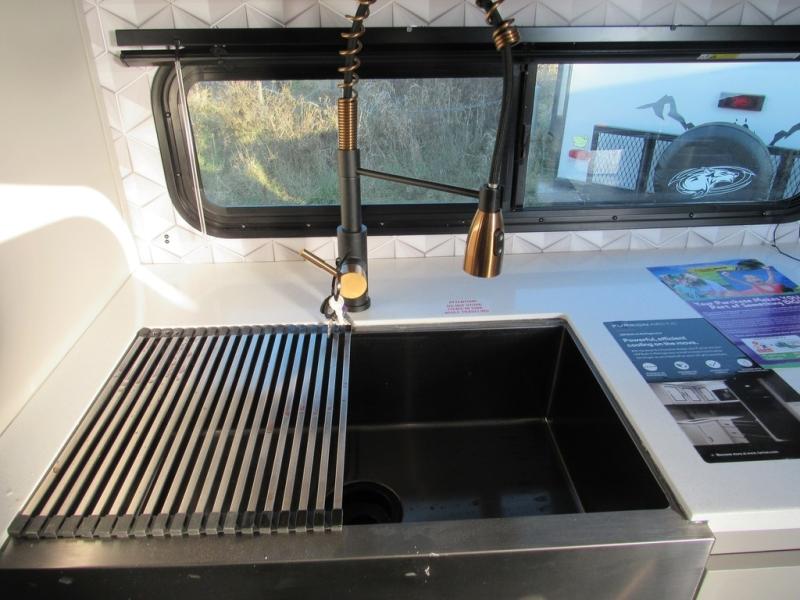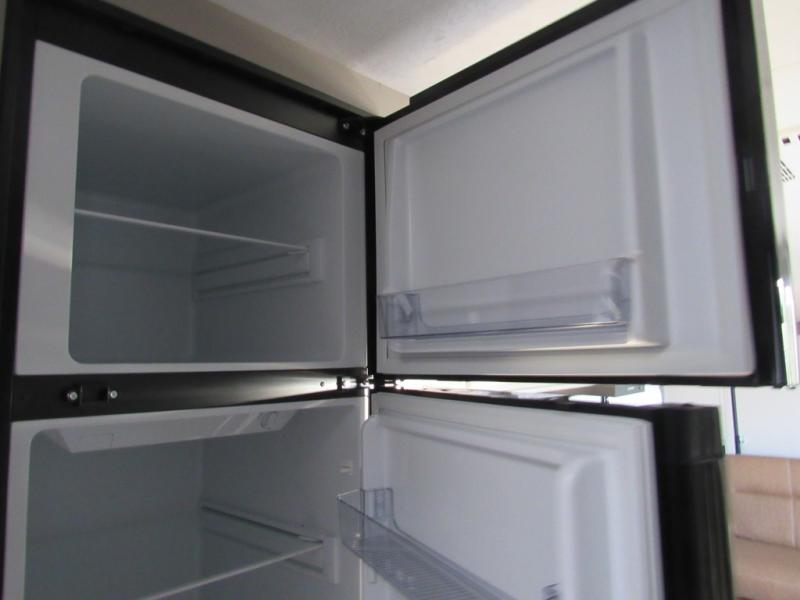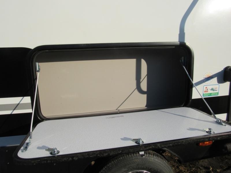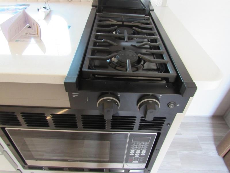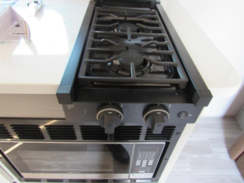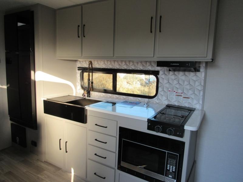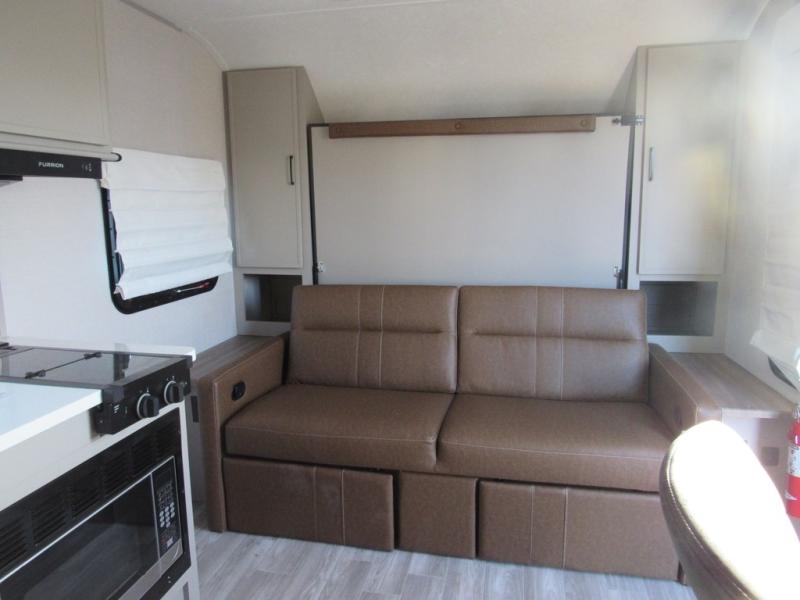 You will love camping every other weekend in this spacious travel trailer for three to four. There is a full rear bath with a spacious shower and medicine cabinet for your toiletries. You can relax on the jackknife sofa during the day and at night transform it into a Murphy bed. Easily prepare your meals in the kitchen on the three burner cooktop or in the oven. There is also an upgraded 10.7 cu. ft. residential refrigerator, plus a convection microwave oven for meals on the go. The bar top with two stools is the perfect place to enjoy your meals as you have a flip-open window to let in some fresh air. This model also includes an outside kitchen with an induction cooktop, a 14' power awning, plus an outside spray port for convenience!