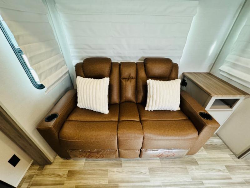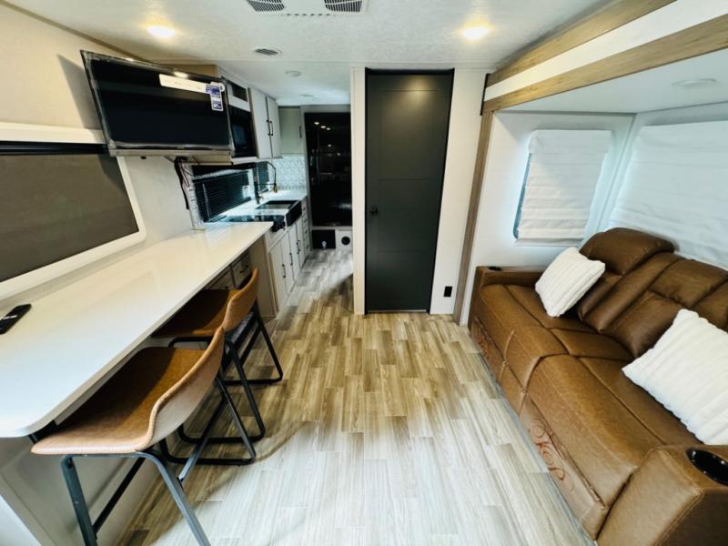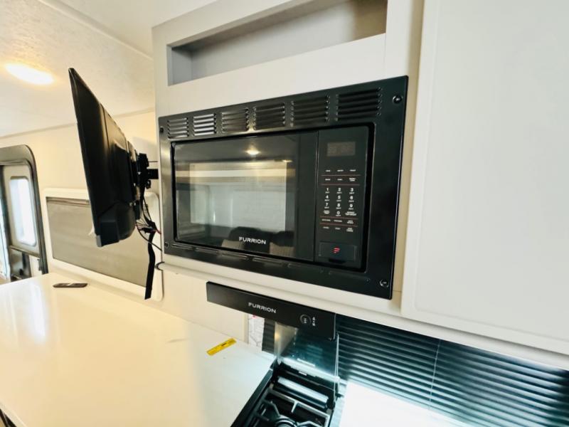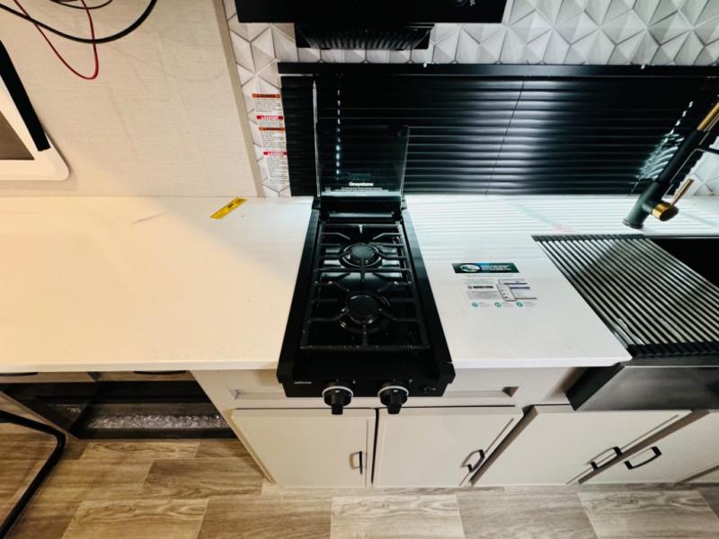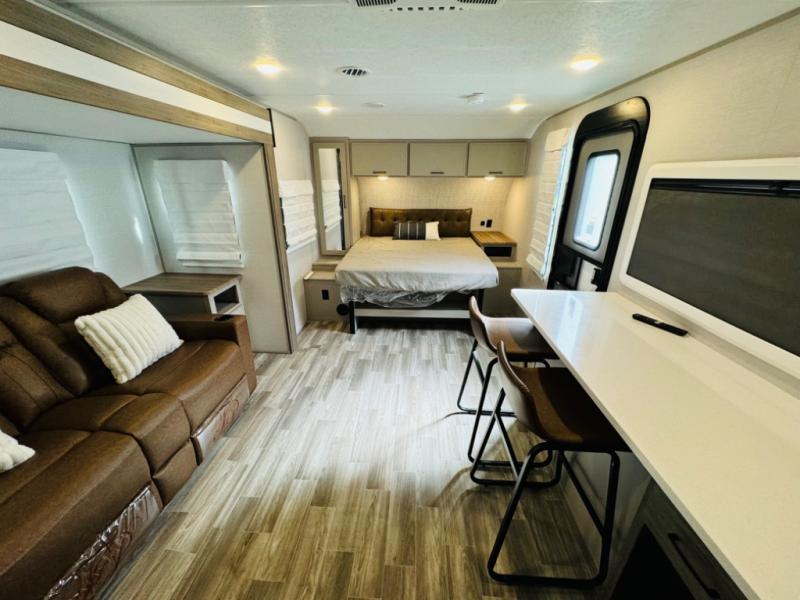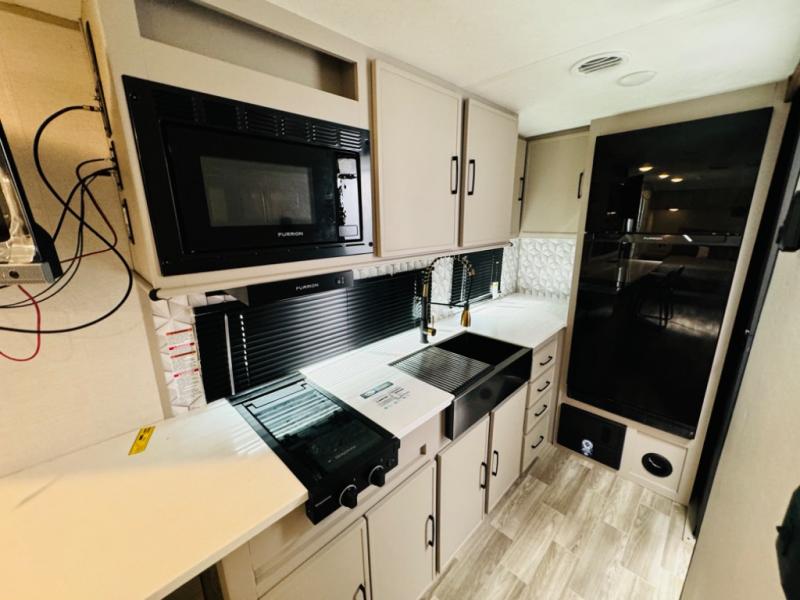 Escape to your favorite campground with your favorite person in this travel trailer! Whether you're cooking on the outside kitchen or indoors in the rear corner kitchen, you will have all the appliances needed for yummy meals each day. There is even an air fryer for added convenience. Enjoy your meals at the bar top with two bar stools looking out through the flip-open window. The living area has a theater seating slide to provide comfortable seating space during the day, and a wardrobe next to it to store your items. You will get a good night's rest each night on the front RV queen bed, and the rear corner bathroom has a 36" x 24" shower to freshen up in the mornings. This model also includes tons of storage space for all your belongings with an exterior large pass-through storage area!