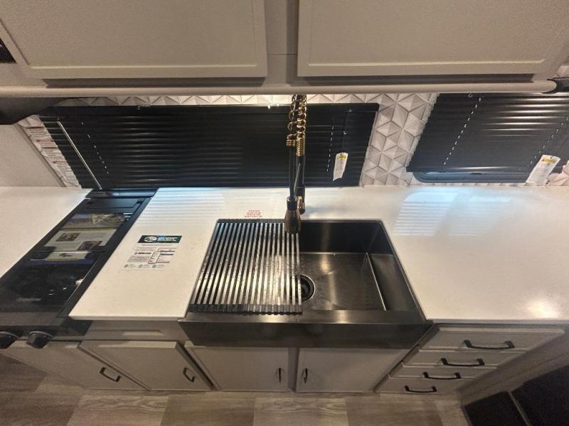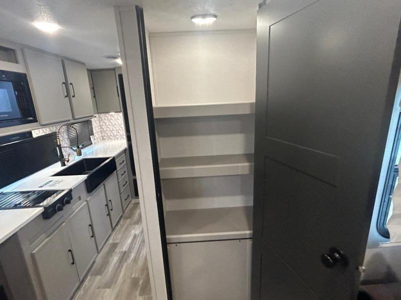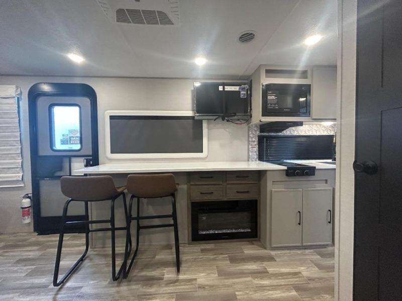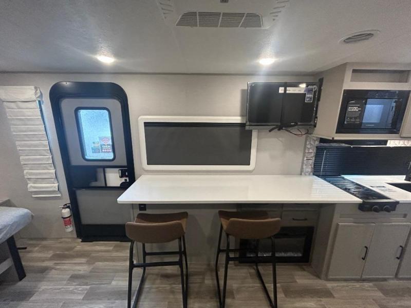Escape to your favorite campground with your favorite person in this travel trailer! Whether you're cooking on the outside kitchen or indoors in the rear corner kitchen, you will have all the appliances needed for yummy meals each day. There is even an air fryer for added convenience. Enjoy your meals at the bar top with two bar stools looking out through the flip-open window. The living area has a theater seating slide to provide comfortable seating space during the day, and a wardrobe next to it to store your items. You will get a good night's rest each night on the front RV queen bed, and the rear corner bathroom has a 36" x 24" shower to freshen up in the mornings. This model also includes tons of storage space for all your belongings with an exterior large pass-through storage area!