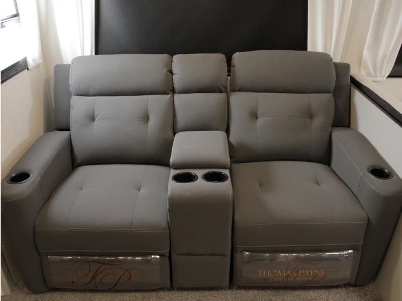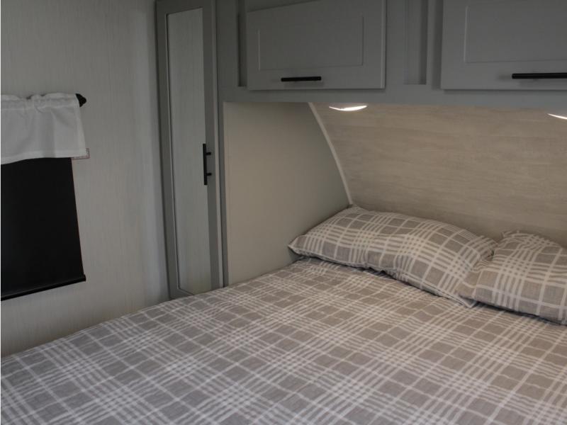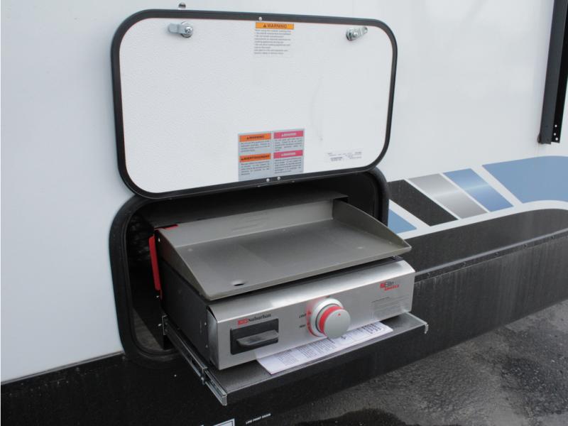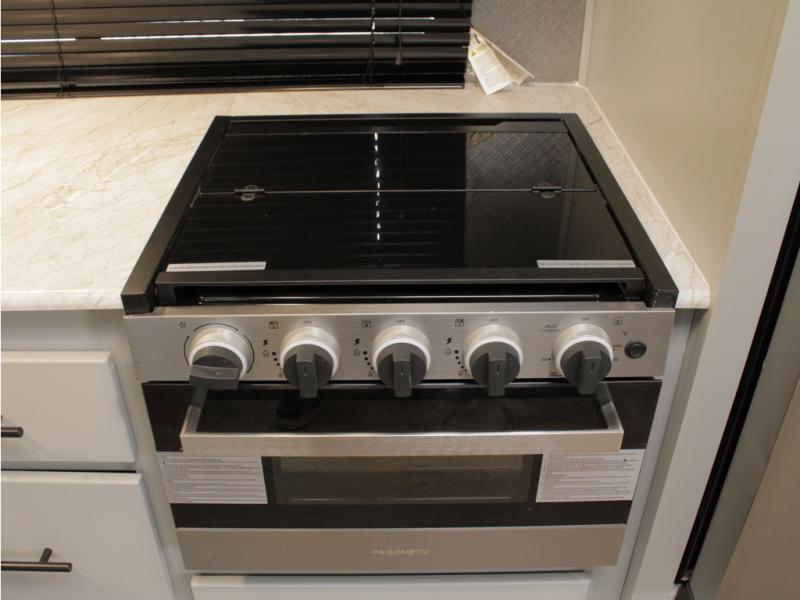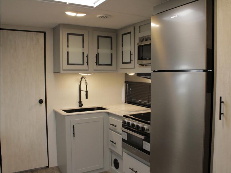 You will love camping every other weekend in this spacious travel trailer for three to four. There is a full rear bath with a spacious shower and two linen closets for towels and toiletries. Your crew can get comfortable on the theater seating across from the entertainment center, and it even swings open to reveal hidden storage with shelves. Easily prepare your meals in the kitchen on the three burner cooktop, or in the oven. There is also an upgraded 10.7 cu. ft. residential refrigerator, plus a microwave and air fryer for meals on the go. When you're ready to call it a night, the front private bedroom is sure to provide comfort with its queen bed, dual wardrobes, and underbed storage. This model also includes an outside kitchen with an induction cooktop, a 20' power awning, plus Sure-Step entry steps for convenience!