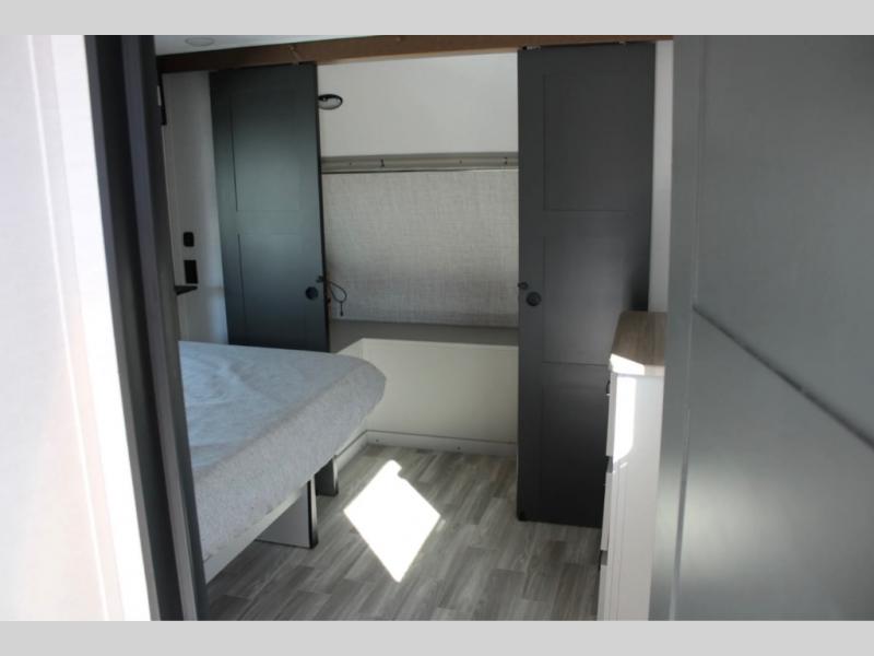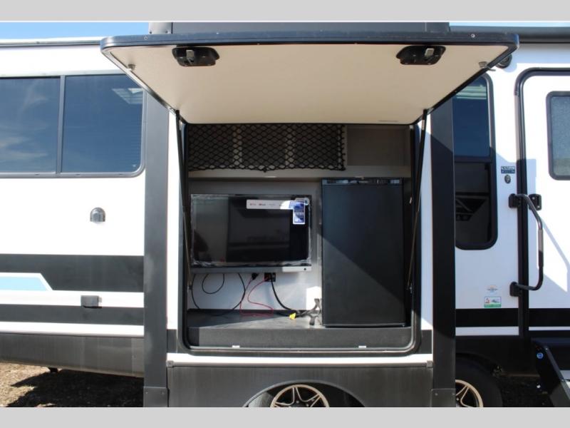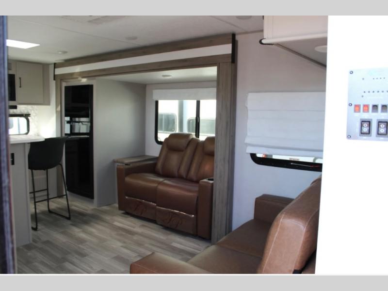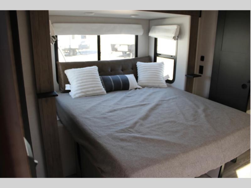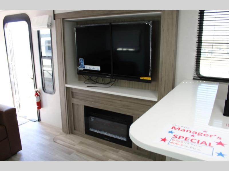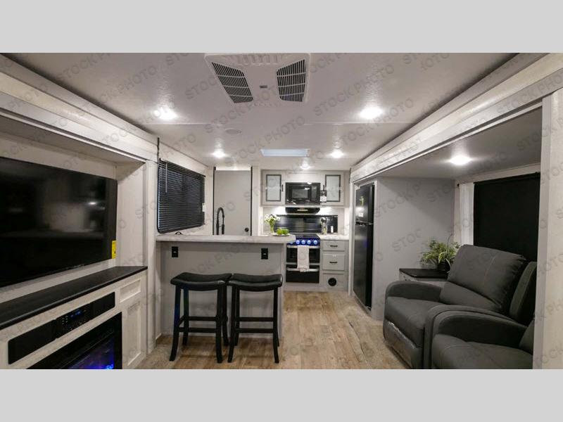 There is no going back to your tent-camping days after touring this travel trailer. The rear kitchen is any chef's dream with its walk-in pantry, residential refrigerator, plus a bar with stools where the kids can enjoy coloring. You will find comfortable seating space on the theater seating and tri-fold sofa, and the fireplace and 50" TV with storage will feel just like home. The full bath will allow everyone space to clean up each day, and the front private bedroom will be your own oasis away from it all. Here, you will enjoy a slide out queen bed, a dresser where you can add a TV if you choose, plus a front walk-in closet so you can bring along all your favorite outfits!