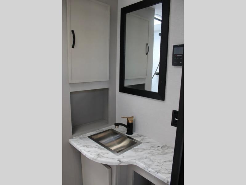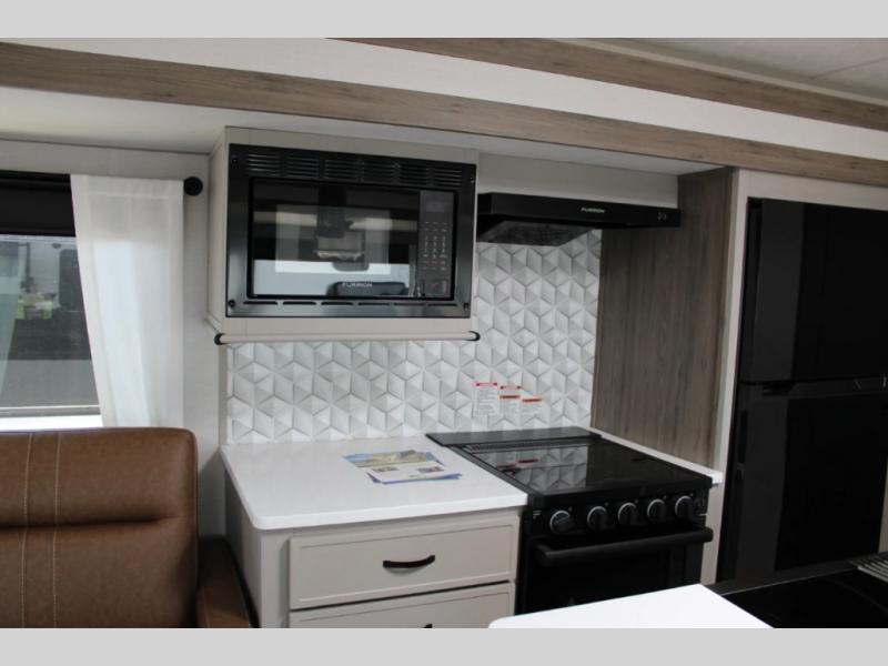 Each Vibe travel trailer by Forest River includes Hyper Lyte construction and a durable laminated "Aluma Frame" for years of use. You will also find an outside shower, a 200-watt roof mounted solar panel, and heated tank pads that will help extend your camping season. The Reserve Package has many at-home features you are sure to enjoy, like the decorative window treatments, solid surface countertops, new black chef's appliance package with an air fryer, and more! These models also include cable and satellite prep and a digital TV antenna with a booster so you can stay connected to the outside world if you choose. Make the easy choice and choose a Vibe travel trailer today!