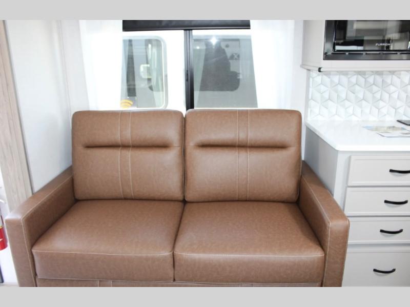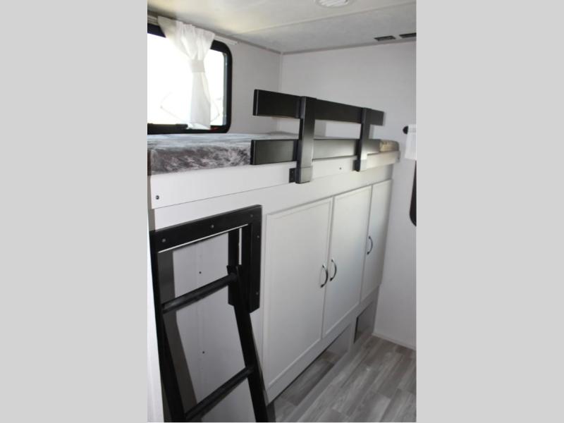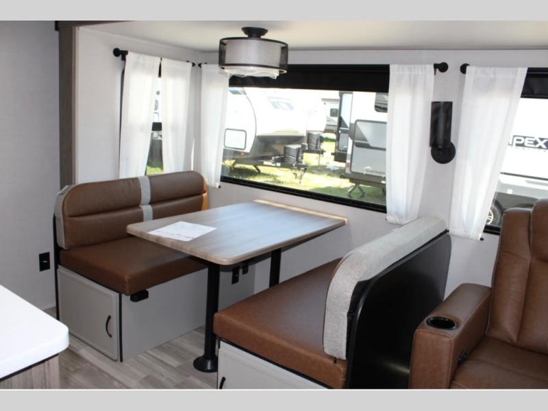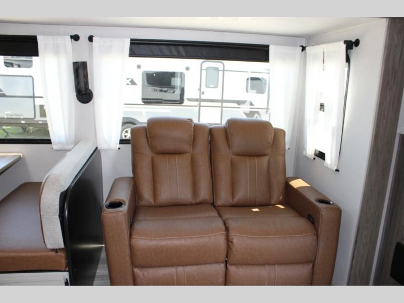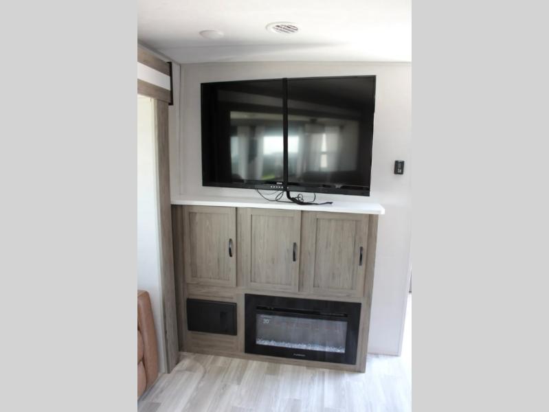 Whether you enjoy spending time outdoors or indoors, there is something for everyone in this travel trailer. The large pass-through storage can store your fishing poles, and the 20' electric awning with LED lights will create an outdoor living space. There is even an exterior baggage door with two exterior refrigerators, a TV, a spray port, and storage for snacks! You will love all the interior space thanks to the dual opposing slides in the main living area, which will give the chef space to work around the kitchen island. Your crew can visit on the tri-fold sofa, theater seating and booth dinette while the fireplace is going, but you'll probably find the kids spending most of their time in the private bunkhouse! They will have two bunks, Vibe cubes, a slide out for more space, plus a wardrobe to store all their clothes. What more could you want in a travel trailer?!