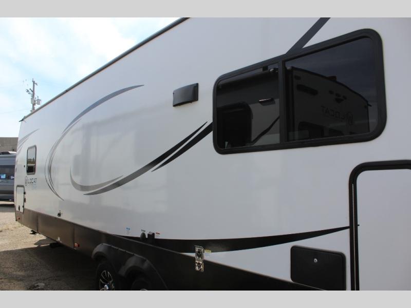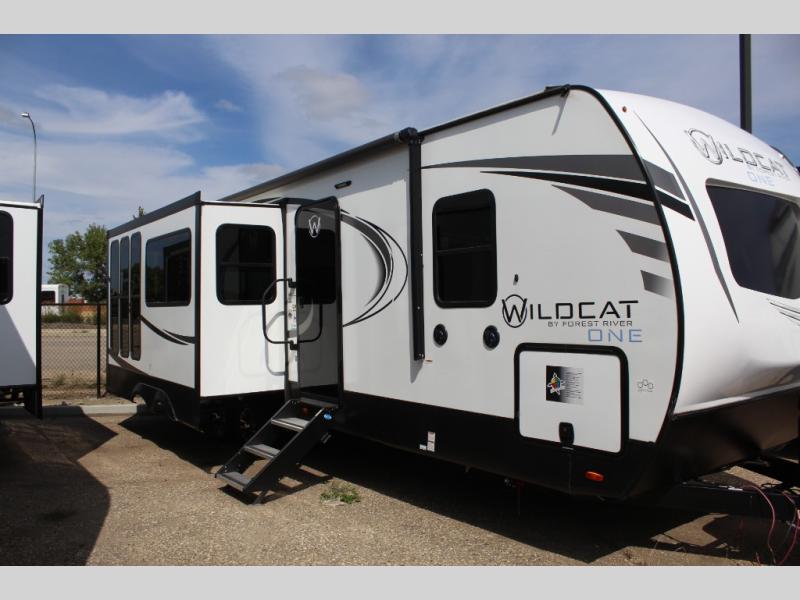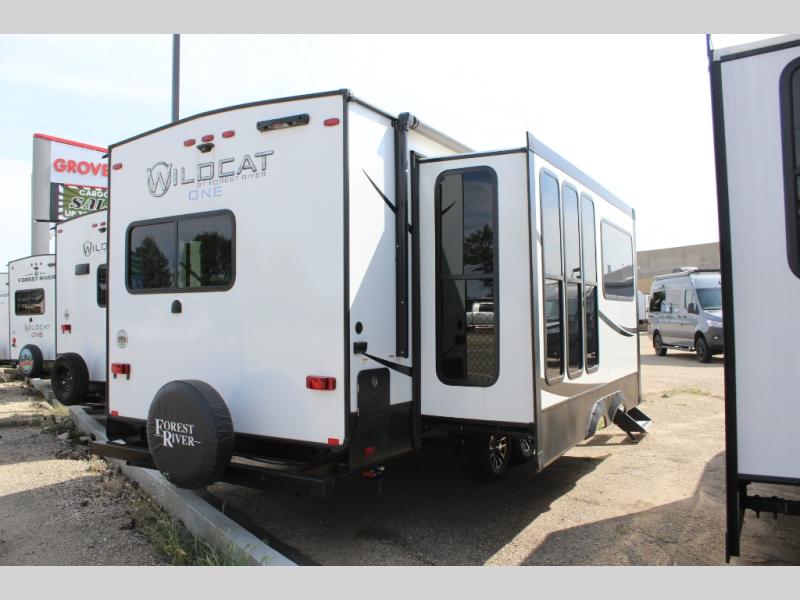 With any Wildcat ONE travel trailer by Forest River in tow, you will find fun and adventure wherever you go! Each model is constructed with a one-piece PVC roof membrane, black framed tinted safety glass windows, and aluminum framed 2" sidewalls for added strength. The high definition graphics outside are sure to turn heads as you travel to the campground, and the stainless appearance appliances inside will have you feeling at home. Take a look at the mandatory Peak Package that comes with fold-down entry steps on the main entrance, solid surface countertops, an exterior "On-The-Go" ladder prep, and more stand-out features. The Dynamic Technology Package is also mandatory and includes an exterior TV connection, a 200-watt expandable roof mount solar panel with a 30 Amp charge controller, and backup camera prep to name a few tech amenities. Available options include 50 Amp service and second A/C prep, garden room windows, free-standing table and chairs, and more!