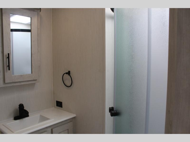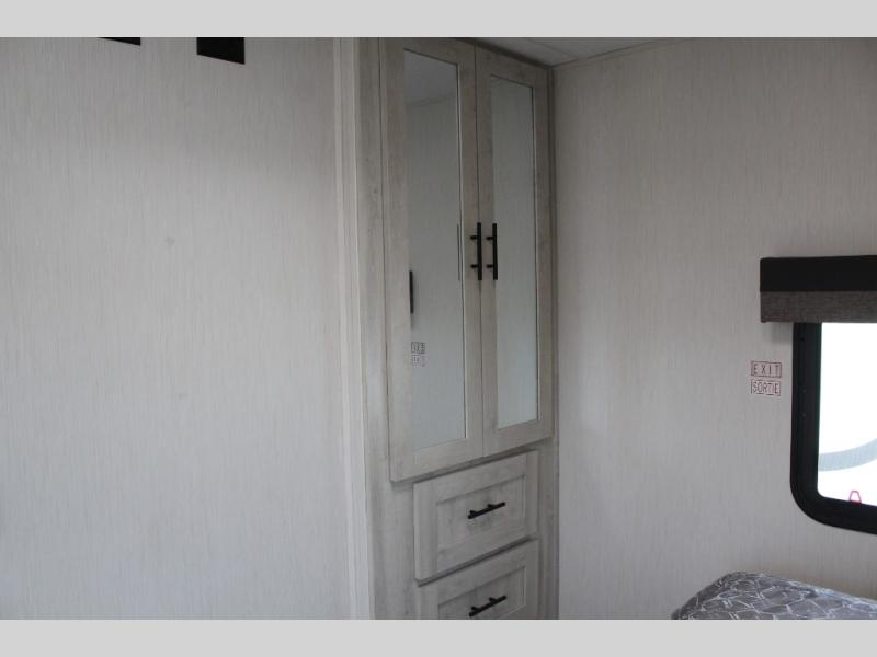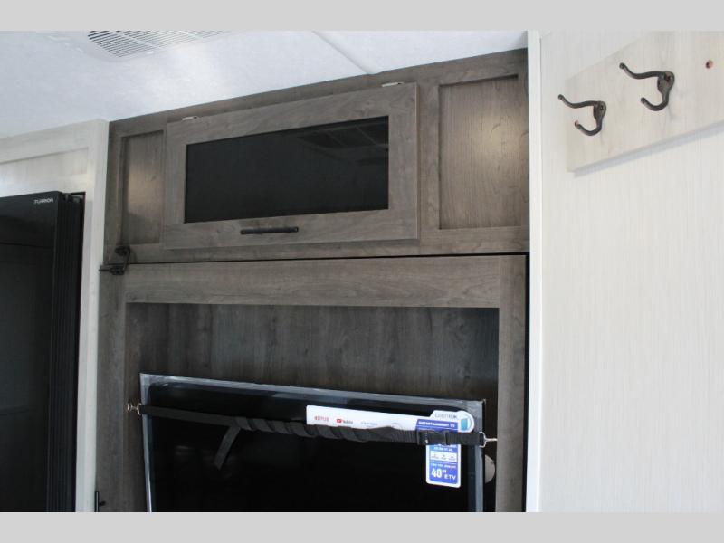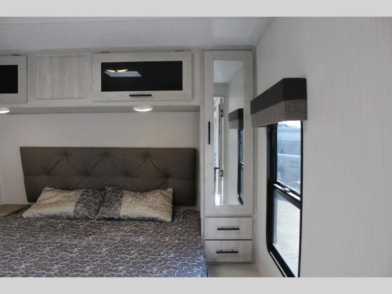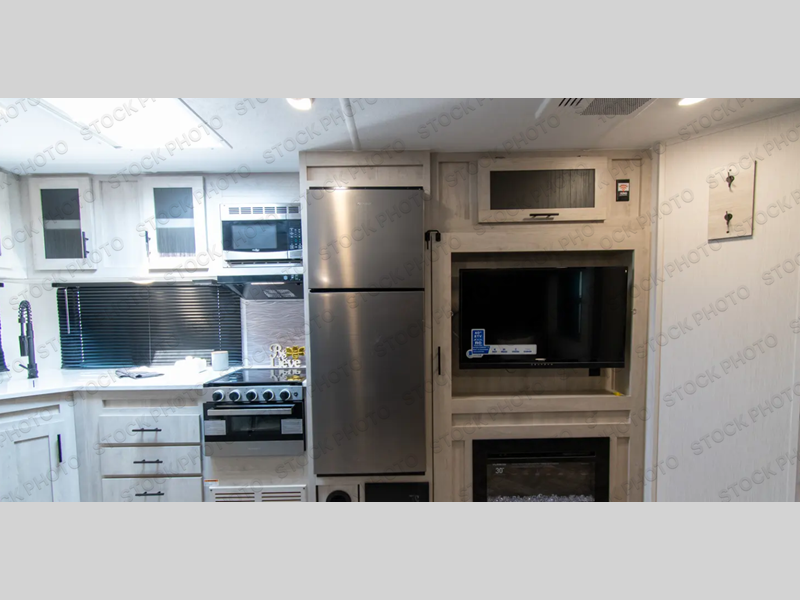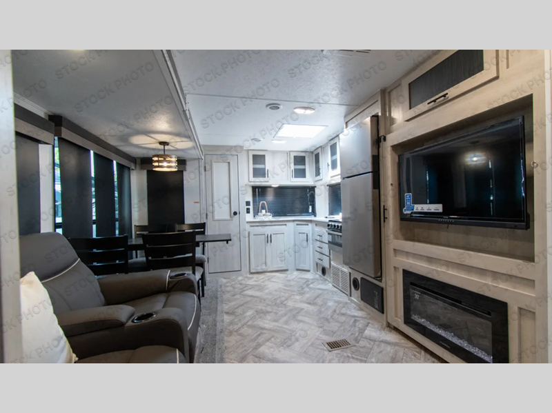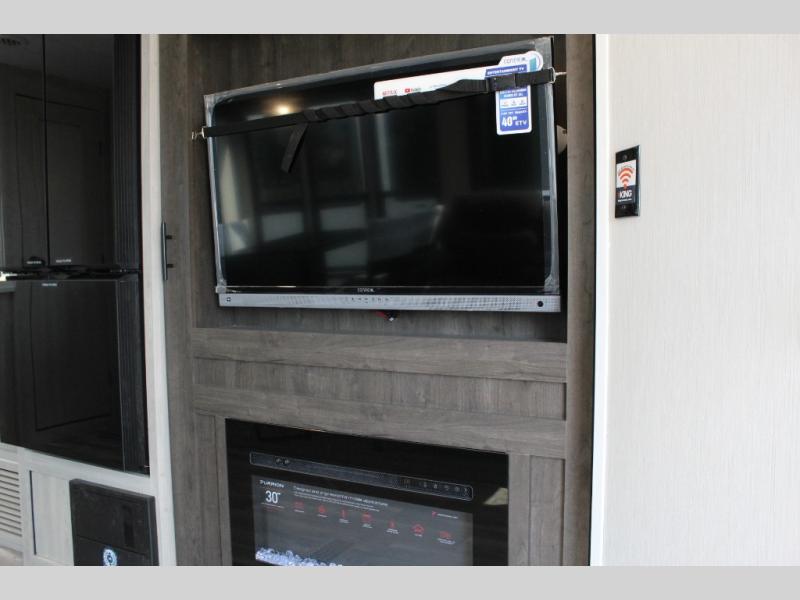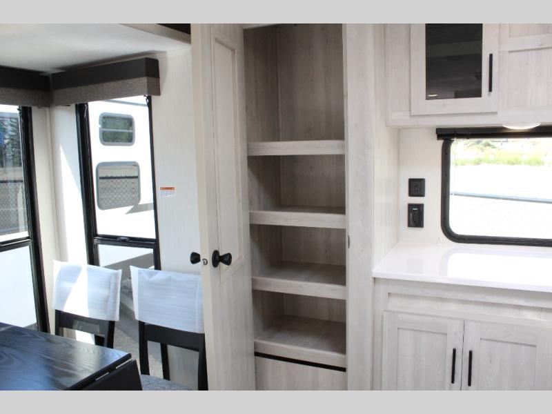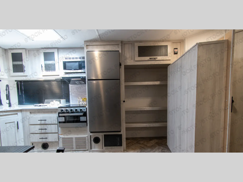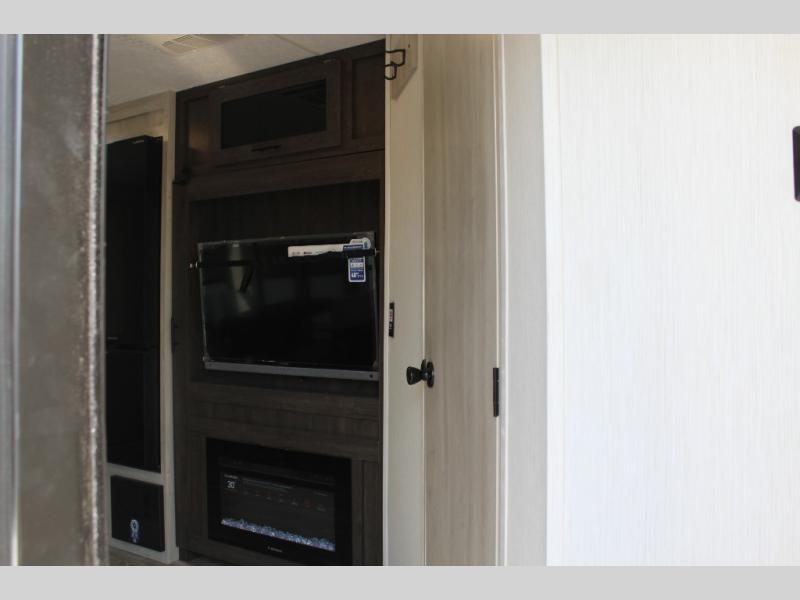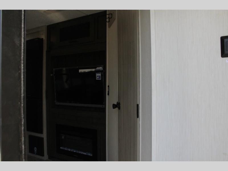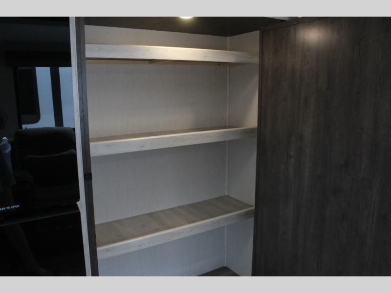 You'll be blown away by the amount of storage space found in this travel trailer, along with all the comfort! Once you arrive at the campground, you can put out the power awning with an LED nightlight, then head inside to make lunch in the rear kitchen. There is plenty of counter space, a large pantry, plus a 12V refrigerator and a three burner cooktop. The tri-fold hide-a-bed sofa sleeper and booth dinette is found within the large slide out, and you'll appreciate storage below the dinette for board games, first-aid kits, and more. This model includes an LED HDTV and fireplace with hidden storage behind so you can be sure there's a spot for everything to go. The front private bedroom with a Maxx king bed will provide a great nights rest, and three bedroom wardrobes will keep your items organized. There is even an exterior Maxx pass-thru storage for fishing poles, yard games, camp chairs and more!