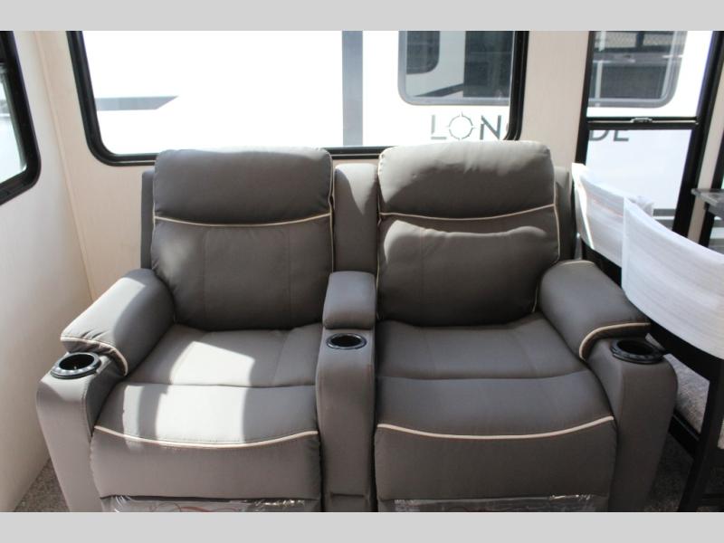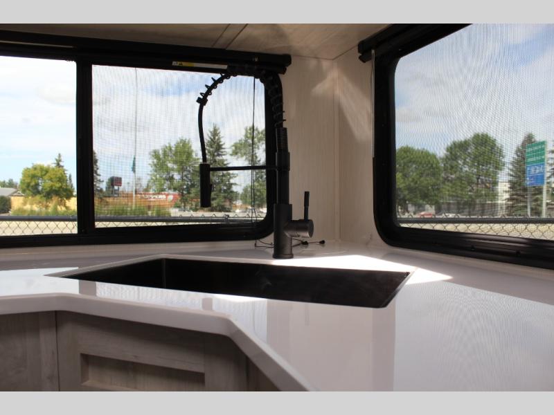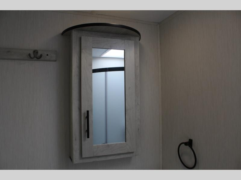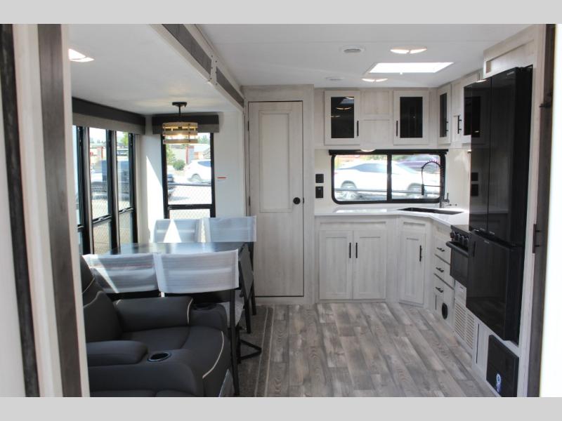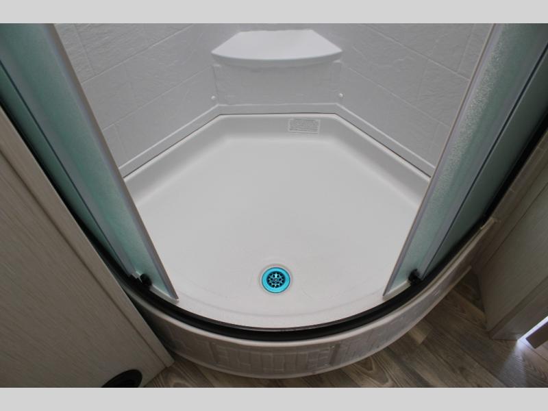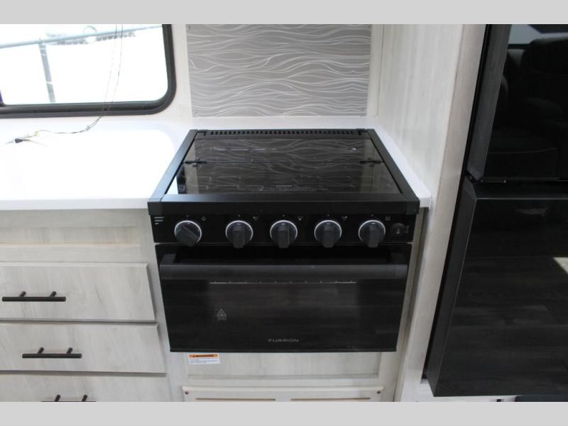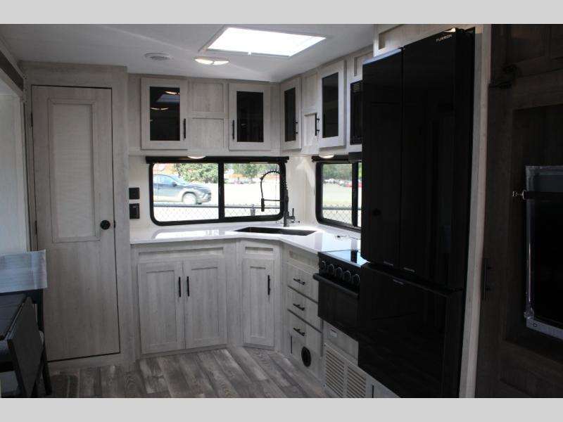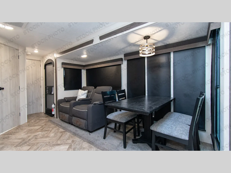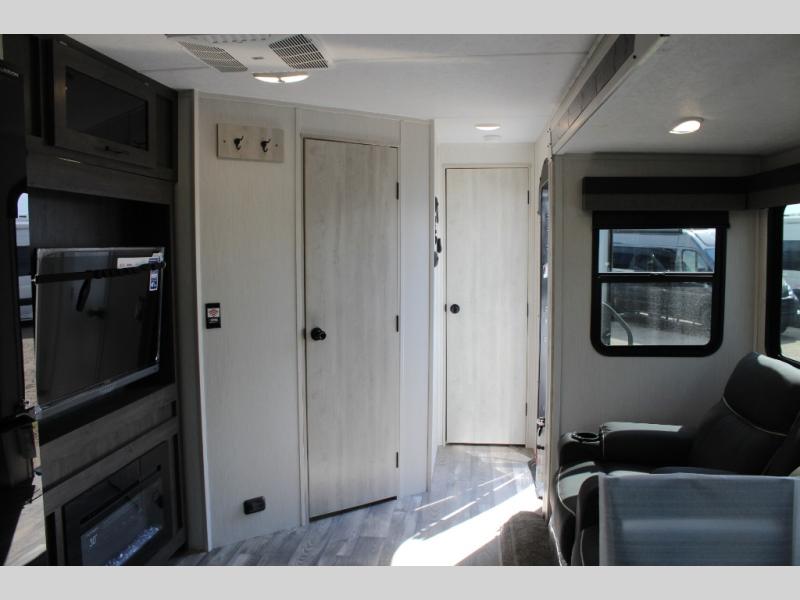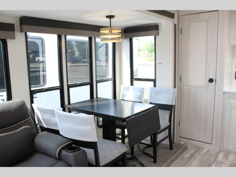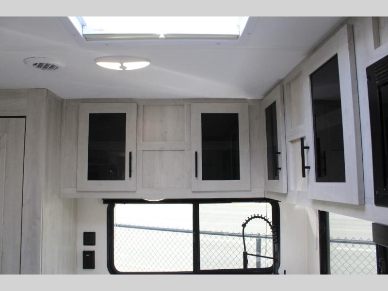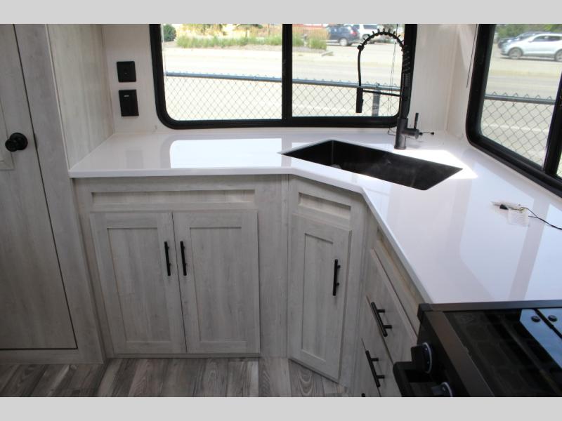 You'll be blown away by the amount of storage space found in this travel trailer, along with all the comfort! Once you arrive at the campground, you can put out the power awning with an LED nightlight, then head inside to make lunch in the rear kitchen. There is plenty of counter space, a large pantry, plus a 12V refrigerator and a three burner cooktop. The tri-fold hide-a-bed sofa sleeper and booth dinette is found within the large slide out, and you'll appreciate storage below the dinette for board games, first-aid kits, and more. This model includes an LED HDTV and fireplace with hidden storage behind so you can be sure there's a spot for everything to go. The front private bedroom with a Maxx king bed will provide a great nights rest, and three bedroom wardrobes will keep your items organized. There is even an exterior Maxx pass-thru storage for fishing poles, yard games, camp chairs and more!
