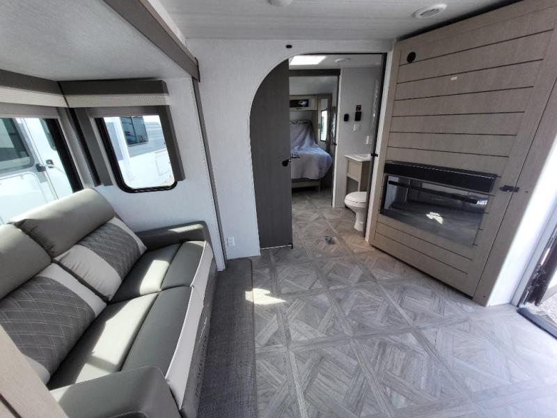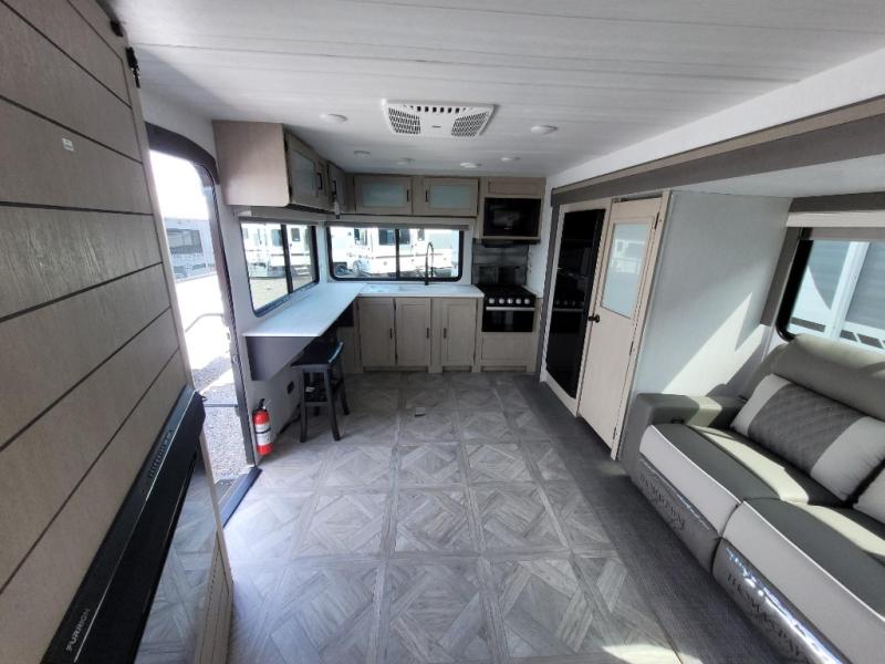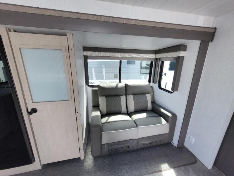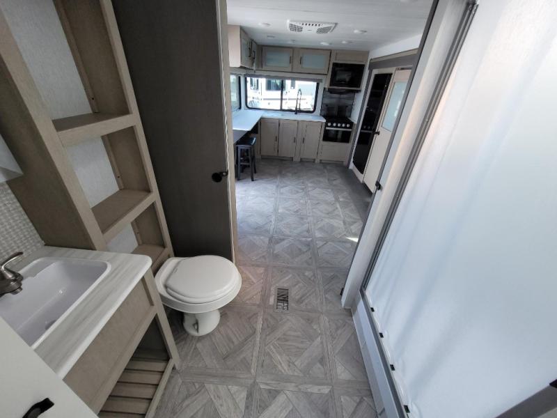 You're going to love cooking in the rear kitchen of this travel trailer! It has everything you need to prepare delicious home cooked meals including a large pantry and oversized fridge, plus there are two bar stools to sit on while you enjoy them. The theater seating is conveniently across from the swiveling entertainment center which has hidden shelves behind it for your games and movies. As you walk-through the bathroom, you will notice a walk-in shower to the left and a toilet and sink to the right. It leads directly into the front private bedroom which has a Versa-Tilt custom king bed to lay your head on at night and wardrobes/nightstands on either side for your items!