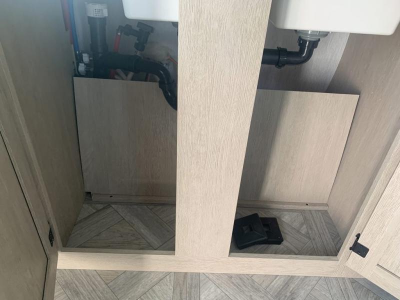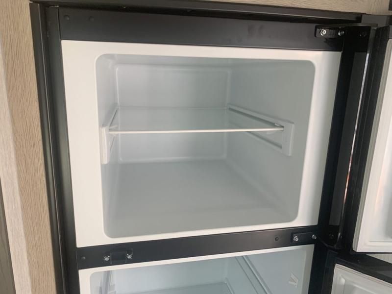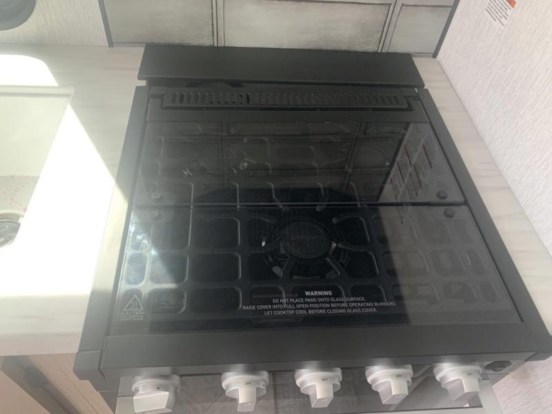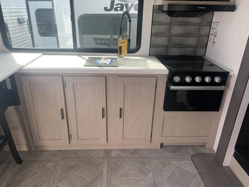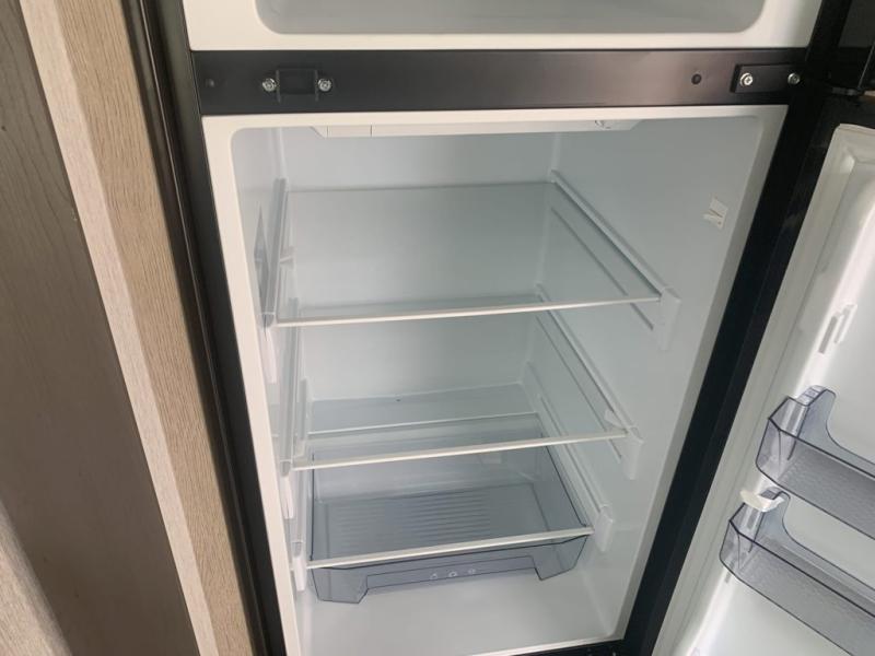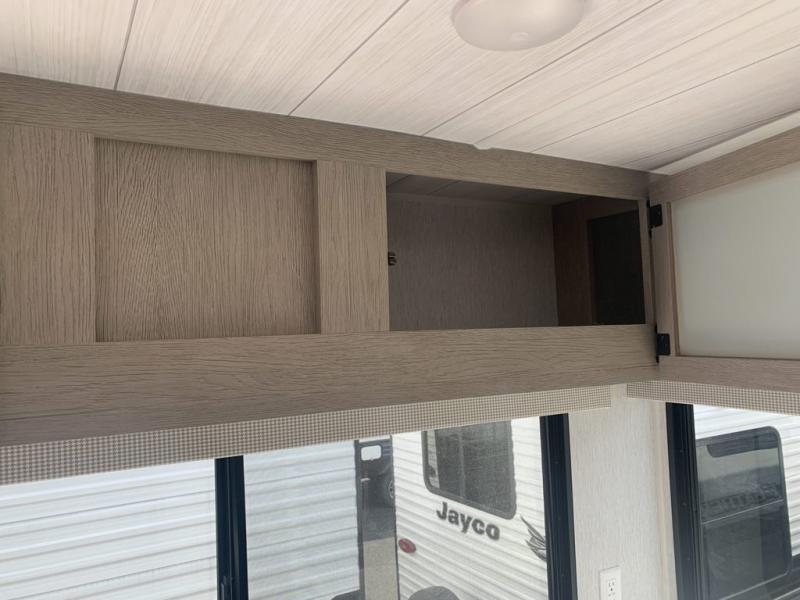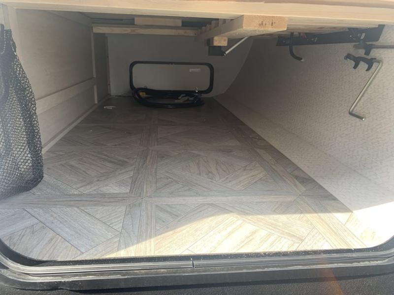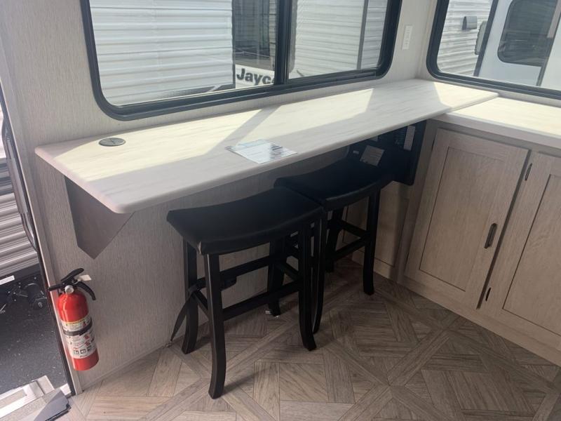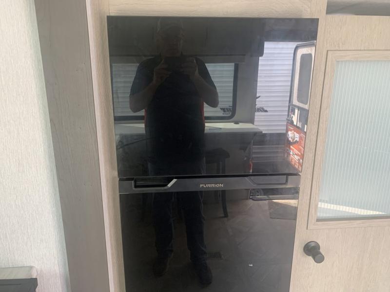 You're going to love cooking in the rear kitchen of this travel trailer! It has everything you need to prepare delicious home cooked meals including a large pantry and oversized fridge, plus there are two bar stools to sit on while you enjoy them. The theater seating is conveniently across from the swiveling entertainment center which has hidden shelves behind it for your games and movies. As you walk-through the bathroom, you will notice a walk-in shower to the left and a toilet and sink to the right. It leads directly into the front private bedroom which has a Versa-Tilt custom king bed to lay your head on at night and wardrobes/nightstands on either side for your items!