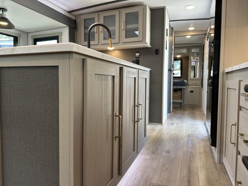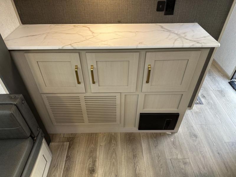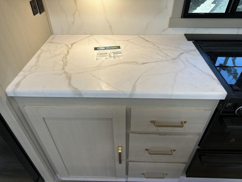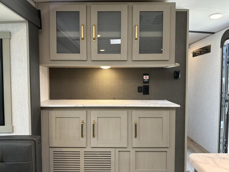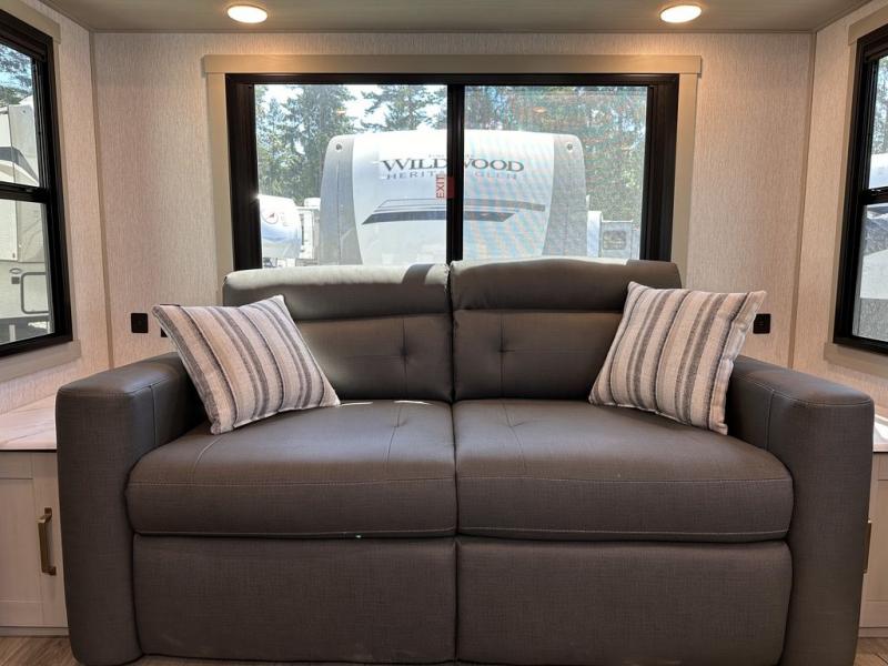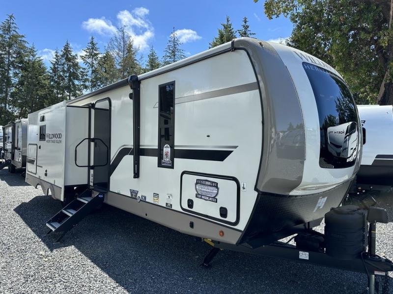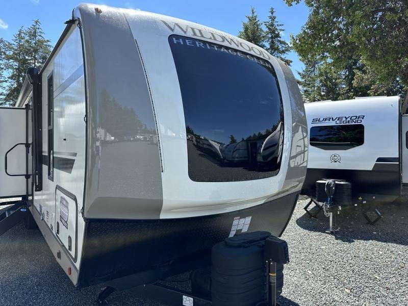 With any Wildwood Heritage Glen travel trailer by Forest River, the quality construction, attention to detail and design along with a bright and welcoming interior allows you to relax in comfort with conveniences while exploring outdoors. Each model includes a WeatherShield one piece fiberglass roof, Goodyear radial tires, and an enclosed underbelly with 12V tank heaters on all holding tanks for added protection. You will appreciate the on-demand tankless water heater, along with the 15K BTU Quite Cool A/C and 50 Amp service with a brace for a second A/C. There is an outside shower with hot and cold water, solar prep, a power stabilizer and tongue jack, plus many more exterior conveniences. Head inside to enjoy Nordic marble countertops throughout, yacht trim ceiling finishes, and full length barreled ceilings for additional head room.