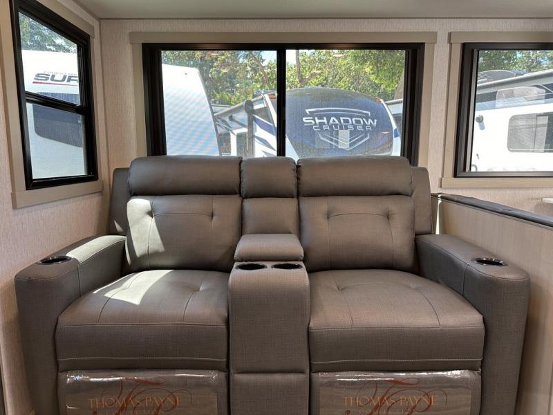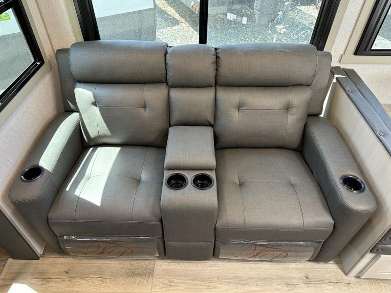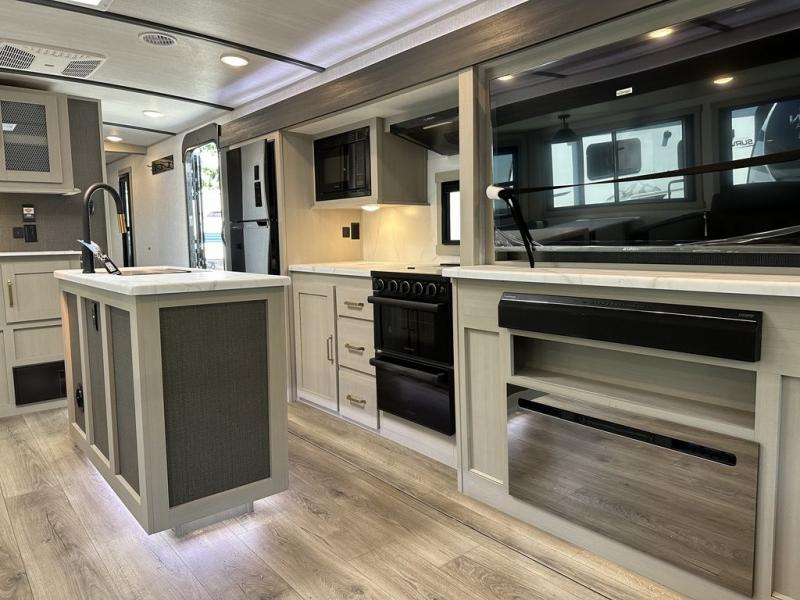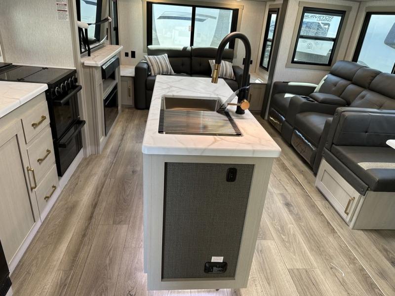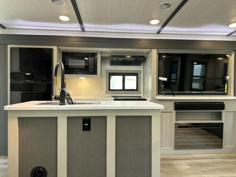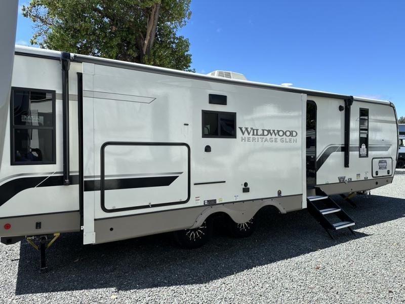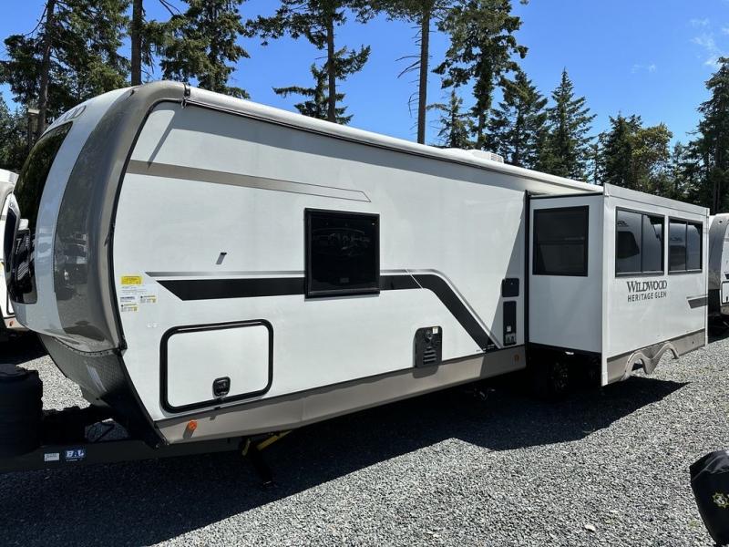 It's time to head to your destination with this Wildwood Heritage Glen travel trailer, whether it be a state park, RV resort, or your own land. Once you arrive, you can easily open up the dual opposing slides for more interior space and start planning your day. You might like to cook a meal, wash dishes using the kitchen island, and dine at the booth dinette, or you can choose the free-standing table option instead. Your guests may choose to relax in the theatre seats or the tri-fold sofa while watching TV, and the outside kitchen/bar will surely be a useful area when wanting to be outside. Don't worry about storage because the extra large pass-through compartment is available for your camping chairs, tables, fishing rods, and such.