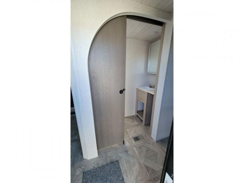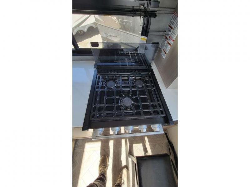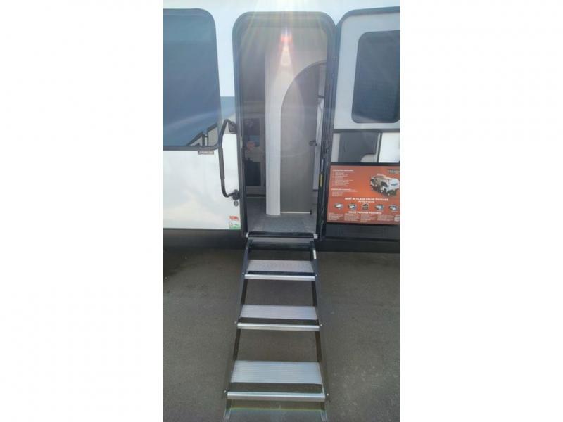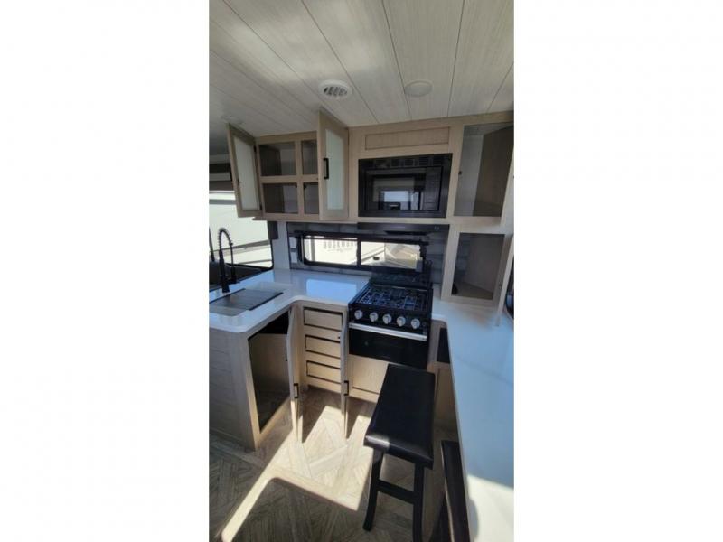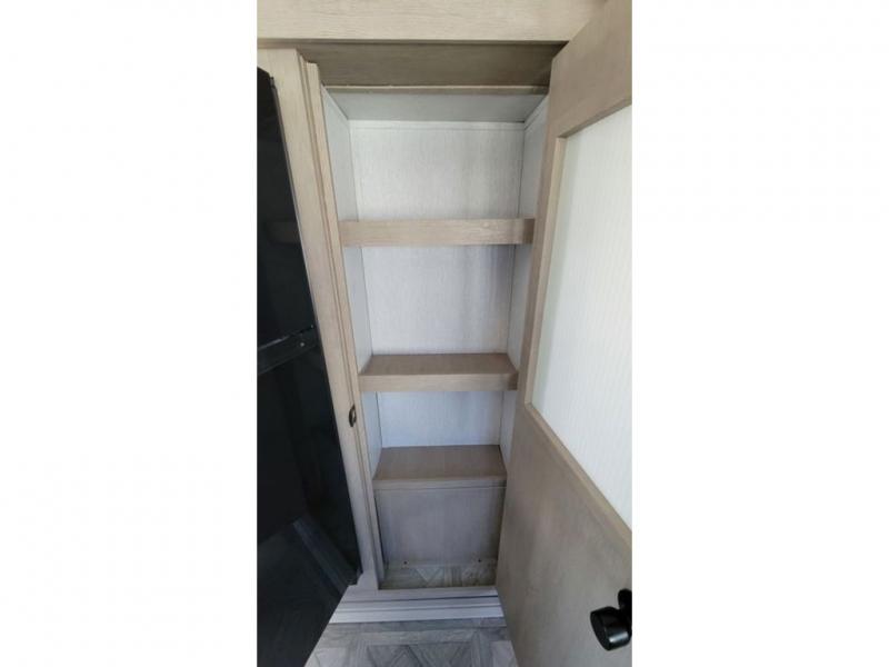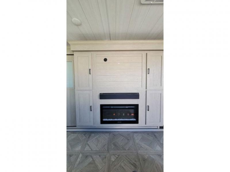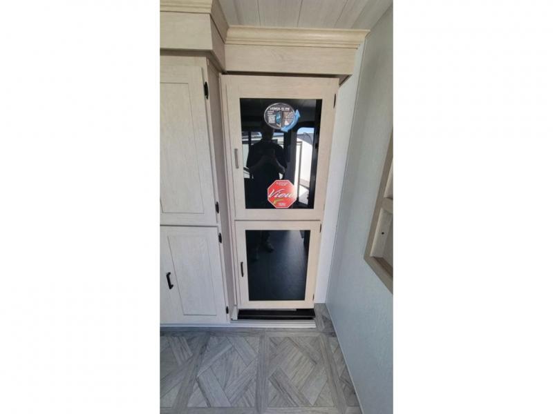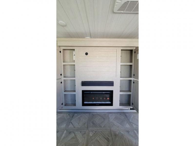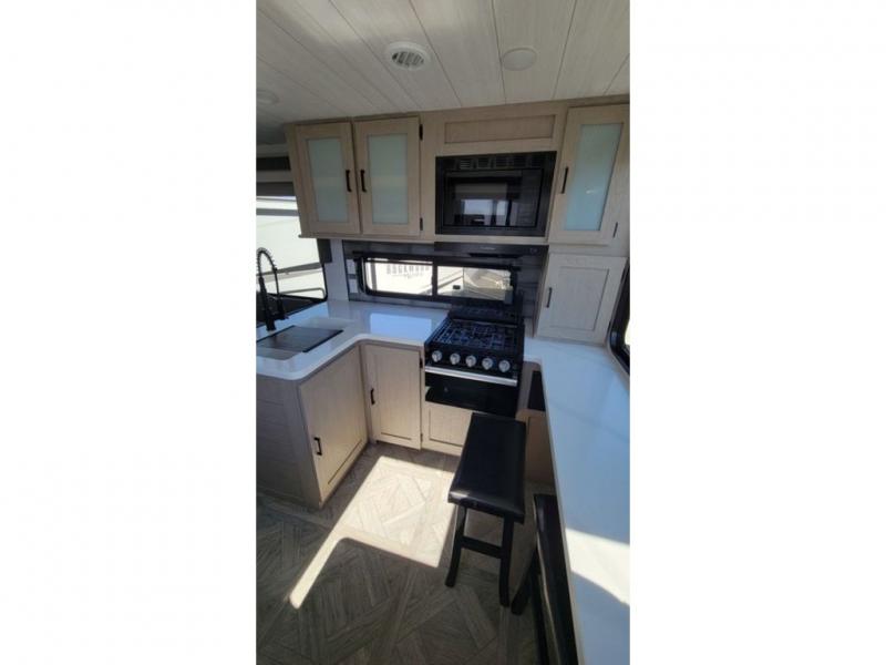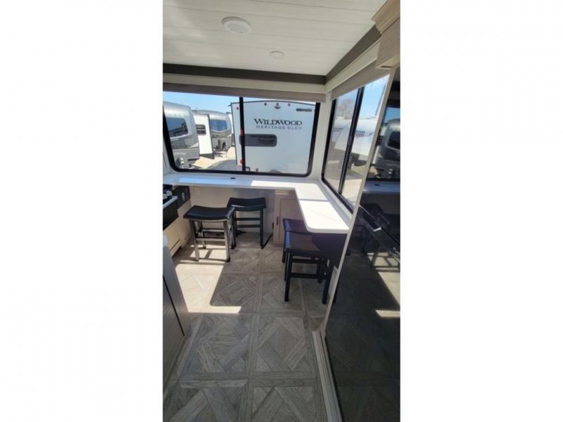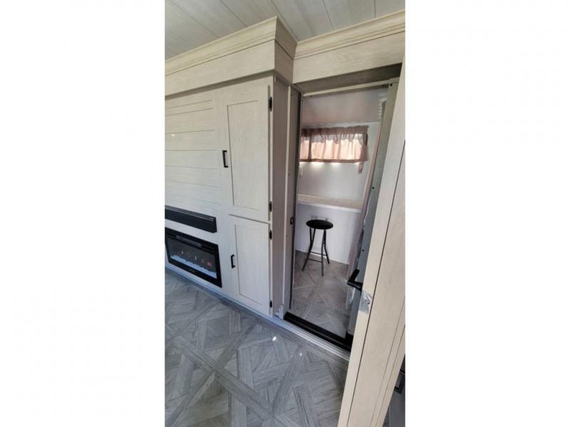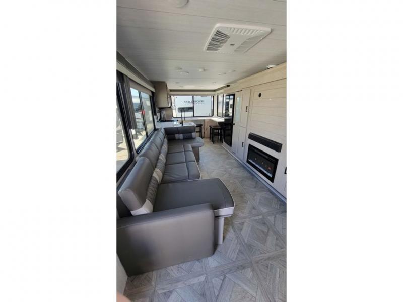 Your family of four or will enjoy this Wildwood View bunk model featuring 105 square feet of window space for unbelievable views of your surroundings. The Versa Slide features a refrigerator, pantry, and entertainment center with a door leading to a bunk space including a 30" x 70" flip-up bunk with a mattress pad below, storage cubbies for your things, and a desk with bar stool for any office work that you may need to do while you travel. All is neatly tucked away within the slide behind an entertainment wall with fireplace opposite the sectional sofa which is great for relaxing and entertaining family and friends indoors. The rear kitchen area offers 18 linear feet of countertop space with four bar stools, plus a three burner range and double sink. Your refrigerator and pantry will hold all of your perishables and dry goods, and those are nearby within the Versa slide. Up front, a private bedroom with Versa-Tilt custom king bed which provides 14-1/2" of additional walking around space, plus you will find a wardrobe that has been prepped for a washer and dryer if you choose to add, as well as dual nightstands beneath wardrobes on either side of the bed. A large pass-through storage compartment offers plenty of storage for your outdoor gear, and if you enjoy outdoor cooking, you might want to add the outside kitchen option as well.
