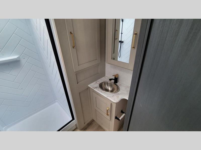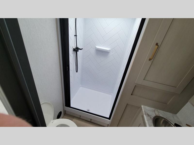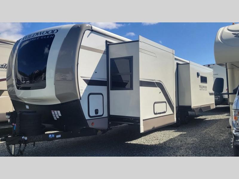 With any Wildwood Heritage Glen travel trailer by Forest River, the quality construction, attention to detail and design along with a bright and welcoming interior allows you to relax in comfort with conveniences while exploring outdoors. Each model includes a WeatherShield one piece fiberglass roof, Goodyear radial tires, and an enclosed underbelly with 12V tank heaters on all holding tanks for added protection. You will appreciate the on-demand tankless water heater, along with the 15K BTU Quite Cool A/C and 50 Amp service with a brace for a second A/C. There is an outside shower with hot and cold water, solar prep, a power stabilizer and tongue jack, plus many more exterior conveniences. Head inside to enjoy Nordic marble countertops throughout, yacht trim ceiling finishes, and full length barreled ceilings for additional head room.