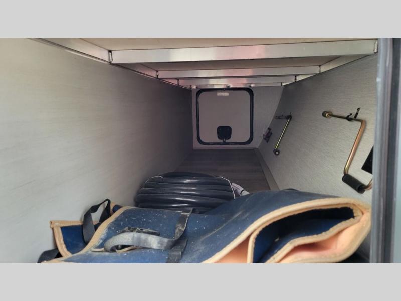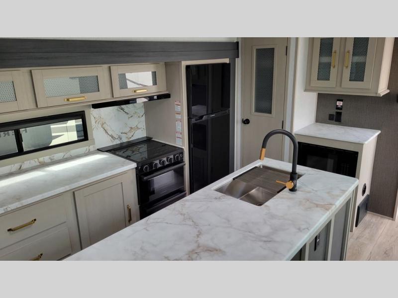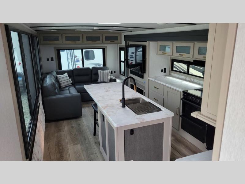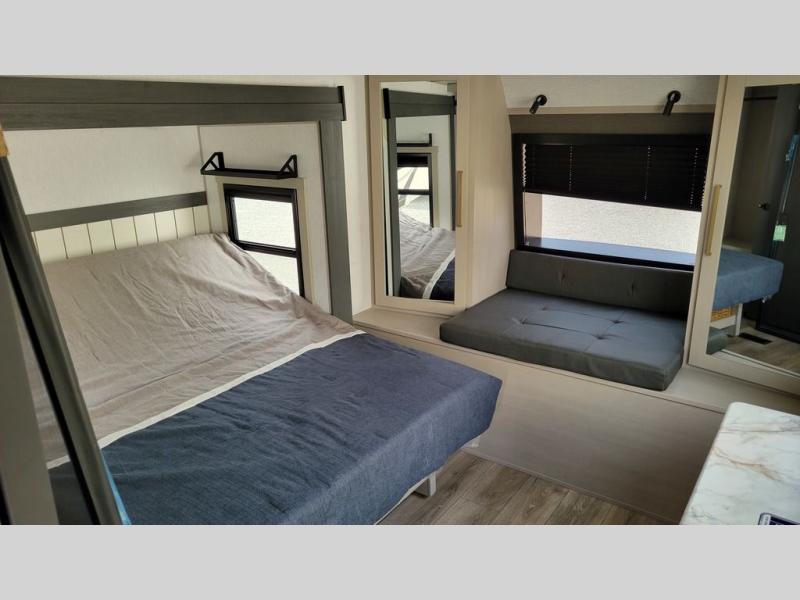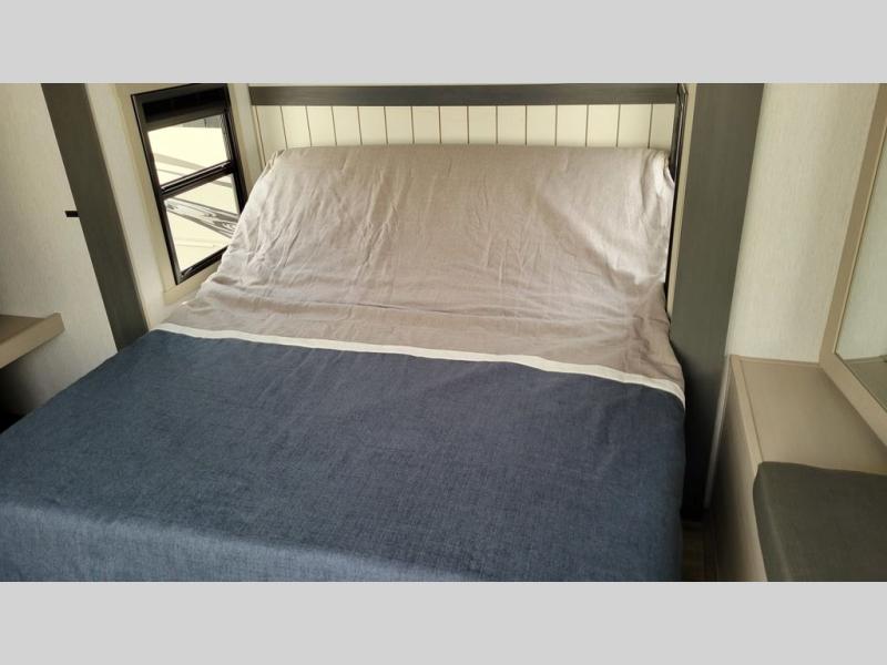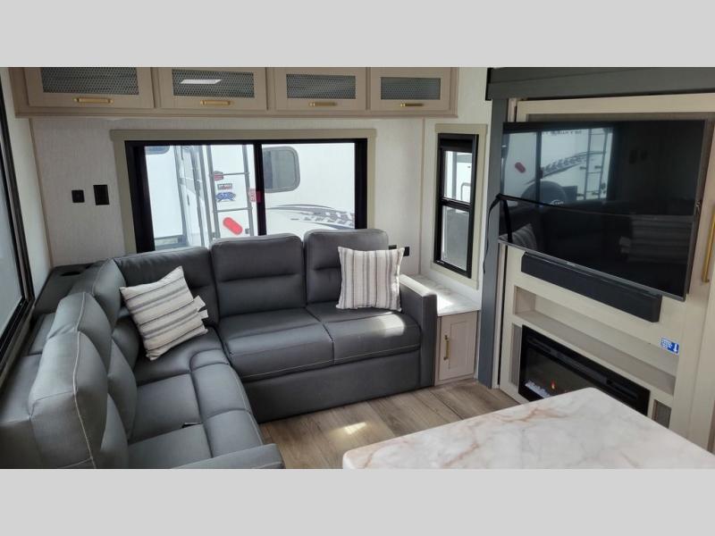 Doubles slides, a front private bedroom, and sleeping space for four to five make this travel trailer the perfect RV for camping trips. You will love the unique swing-open entertainment center with a 50" TV and fireplace and hidden storage with shelves. The L-shaped sofa will be great for lounging and the kitchen island with five stools provides a place to dine at each day. There is also a kitchen pantry, a coffee bar where you can set up your Keurig machine plus plenty of overhead cabinets for added storage. When you're ready for some shut-eye, the front private bedroom will bring comfort with its custom king bed with Versa Tilt, front bench with reading lights, and removable shelves with a hanging rod to keep clothes wrinkle-free. And did we mention this model has sliding glass patio doors for a more residential feel!