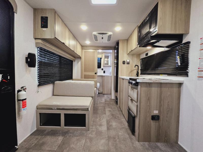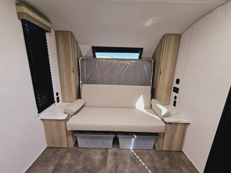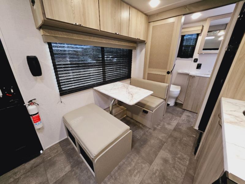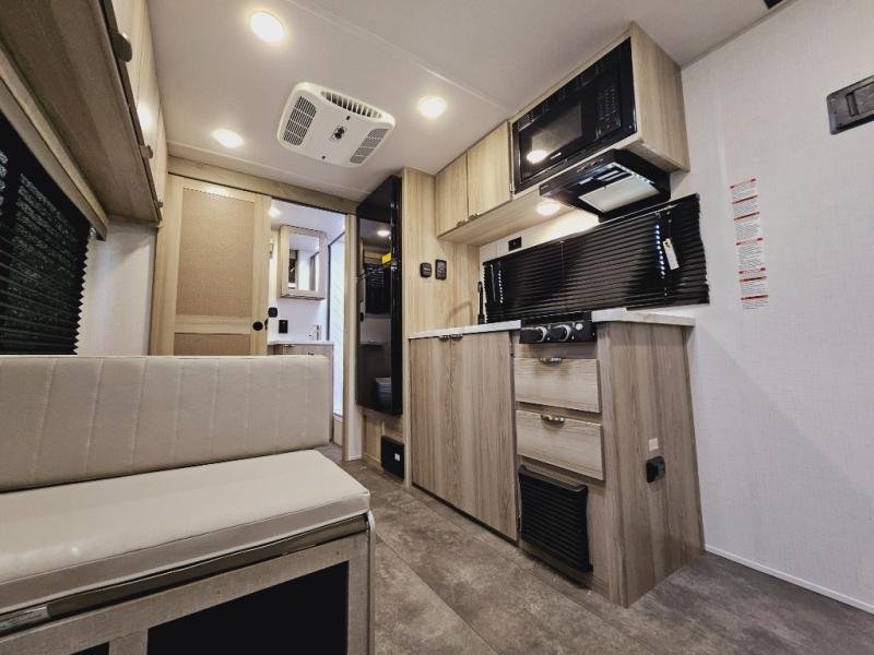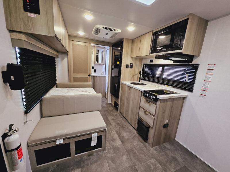 This travel trailer with a full rear bath and versatile sleeping space is your ticket to fun and adventure. While you're putting out the 12' power awning, you can grab a cold drink from the outdoor refrigerator and grab the lawn chairs from the full pass-through storage. There is a two burner cooktop and a microwave oven to prepare your meals in, and a booth dinette to dine at. You'll love the RV queen Murphy bed to sleep on at night, and the sofa with storage to relax on during the day!