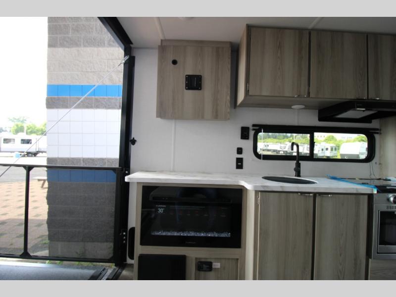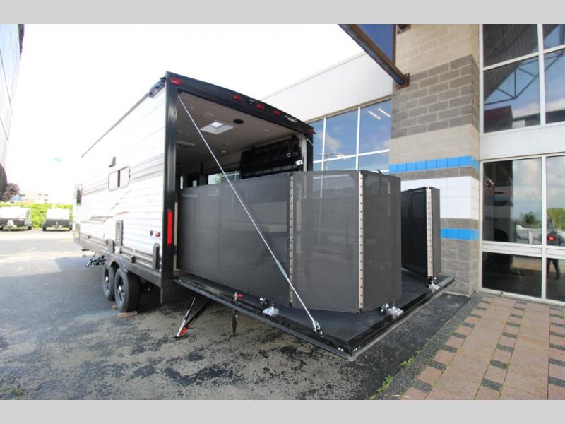 Be ready for anything with this toy hauler in tow! After you've unloaded your toys from the 3,000 lb. ramp door, enjoy the 1,500 lb. capacity patio with a cold drink in hand. There are two sofas inside the garage, plus a fireplace for those chilly nights. The chef of your group will have a full kitchen, complete with a microwave oven and a frost-free refrigerator. The full bath includes a shower skylight that will not only let natural light in, but also provide more standing space. And check out the front bedroom with a queen bed and storage space for your belongings.