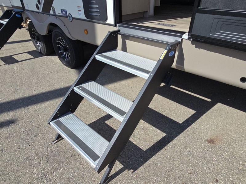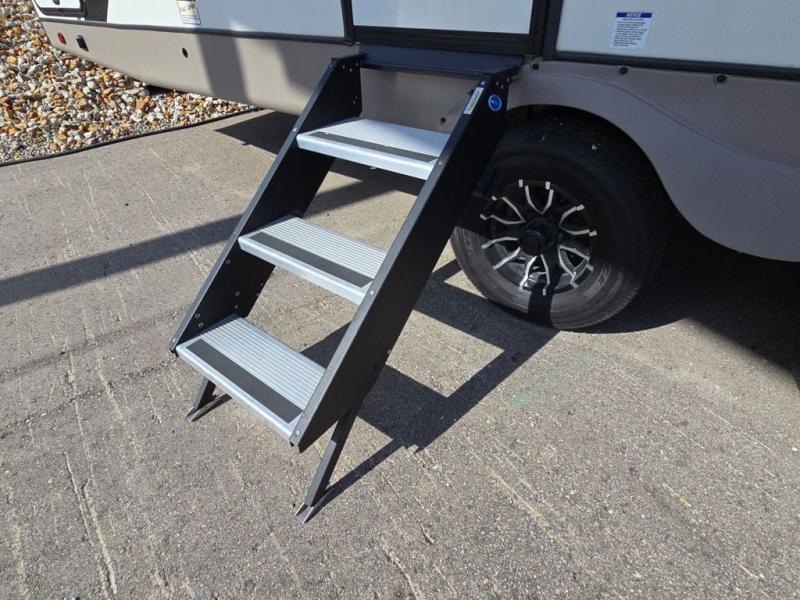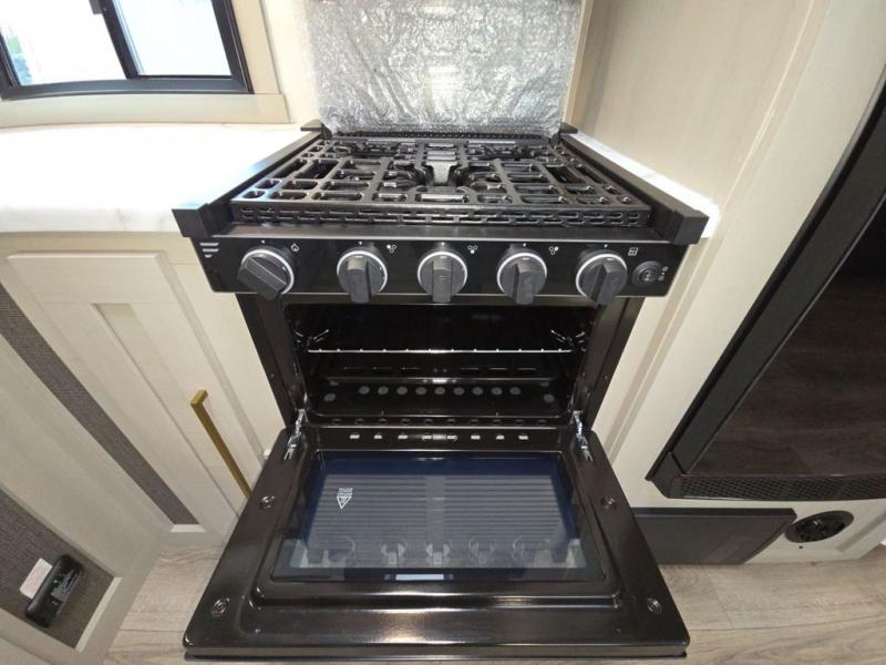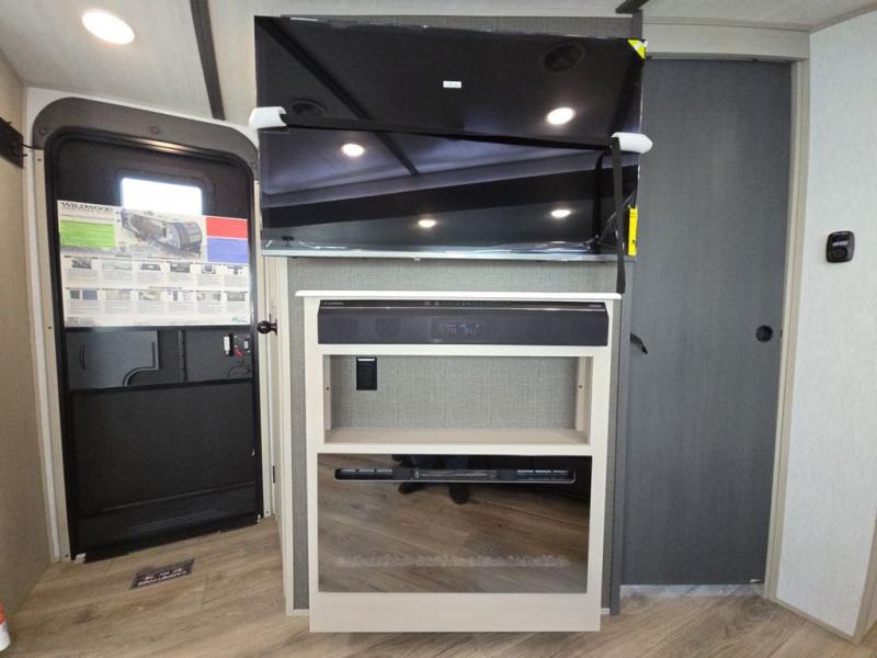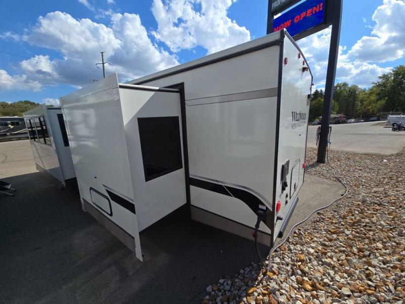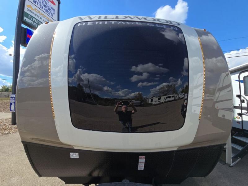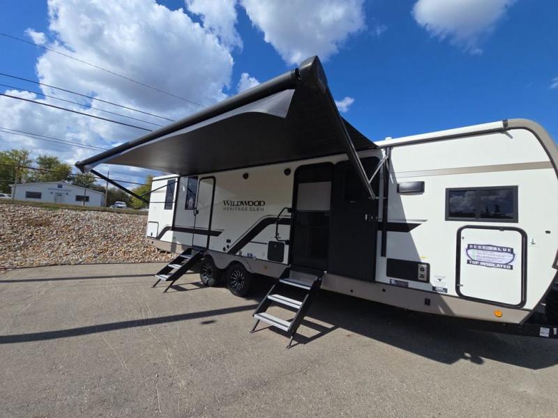 Your family and friends will enjoy each camping trip in this feature-packed Wildwood Heritage Glen travel trailer. Once you arrive at the lake, put out the 19' awning with LED lights before preparing lunch on the outside kitchen. The kids can grab the yard games out of the exterior storage compartments before stretching their legs around the campground. Your crew can get comfortable on the theater seating or the booth dinette, and the 50" LED TV and fireplace will make it feel more like home. The chef of the family will love the extra counter space in the front kitchen as well as a pantry to store dry goods and a 10 cu. ft. 12V refrigerator to keep the gang fed all week. The dual-entry bath will create a rear master suite that you are sure to love. Easily store all your clothes in the large wardrobe or in the dresser, and then fall back on the 66" x 80" custom king bed with Versa Tilt. You even have your own exterior entry door for convenience and washer/dryer prep!