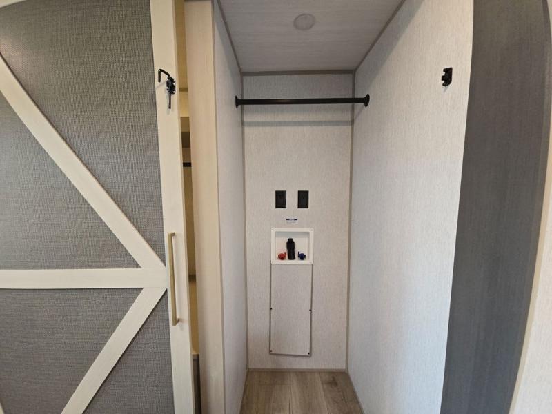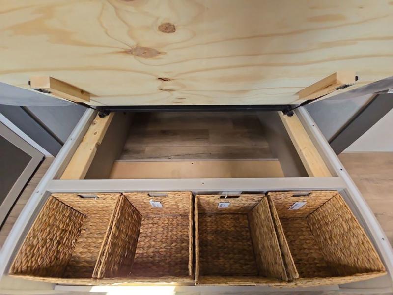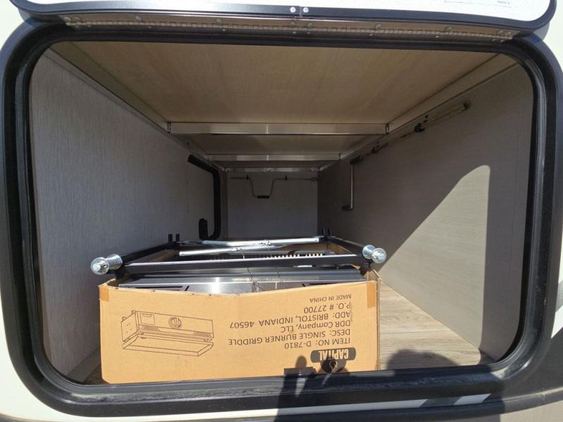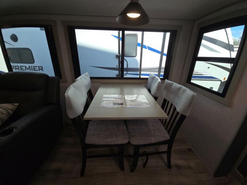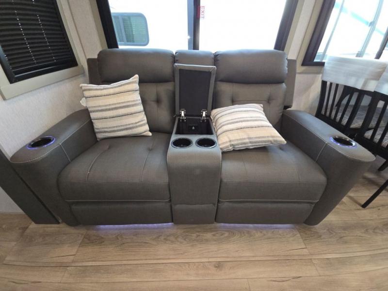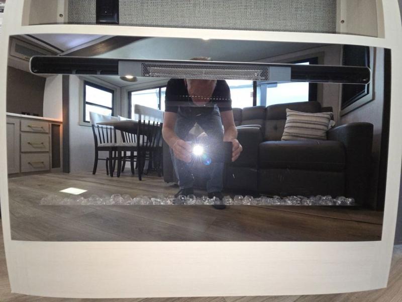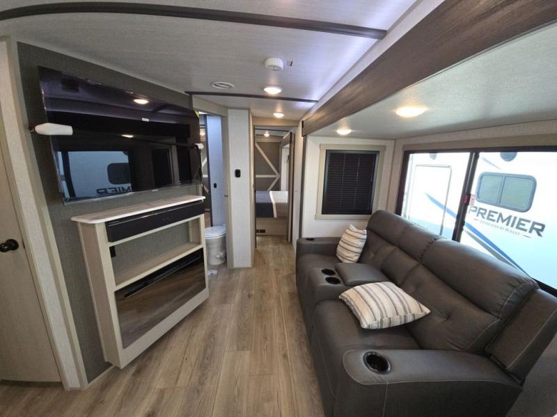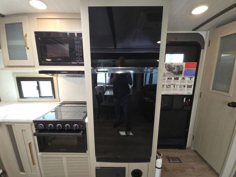 Your family and friends will enjoy each camping trip in this feature-packed Wildwood Heritage Glen travel trailer. Once you arrive at the lake, put out the 19' awning with LED lights before preparing lunch on the outside kitchen. The kids can grab the yard games out of the exterior storage compartments before stretching their legs around the campground. Your crew can get comfortable on the theater seating or the booth dinette, and the 50" LED TV and fireplace will make it feel more like home. The chef of the family will love the extra counter space in the front kitchen as well as a pantry to store dry goods and a 10 cu. ft. 12V refrigerator to keep the gang fed all week. The dual-entry bath will create a rear master suite that you are sure to love. Easily store all your clothes in the large wardrobe or in the dresser, and then fall back on the 66" x 80" custom king bed with Versa Tilt. You even have your own exterior entry door for convenience and washer/dryer prep!
