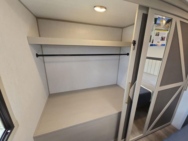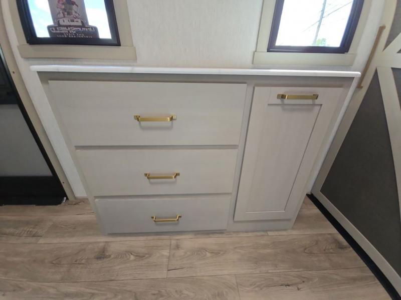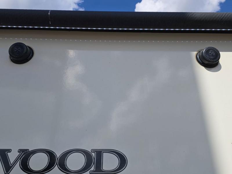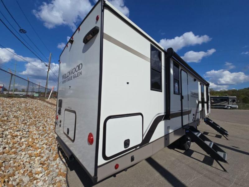 With any Wildwood Heritage Glen travel trailer by Forest River, the quality construction, attention to detail and design along with a bright and welcoming interior allows you to relax in comfort with conveniences while exploring outdoors. Each model includes a WeatherShield one piece fiberglass roof, Goodyear radial tires, and an enclosed underbelly with 12V tank heaters on all holding tanks for added protection. You will appreciate the on-demand tankless water heater, along with the 15K BTU Quite Cool A/C and 50 Amp service with a brace for a second A/C. There is an outside shower with hot and cold water, solar prep, a power stabilizer and tongue jack, plus many more exterior conveniences. Head inside to enjoy Nordic marble countertops throughout, yacht trim ceiling finishes, and full length barreled ceilings for additional head room.
