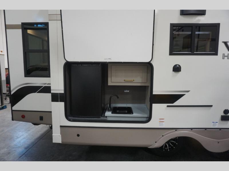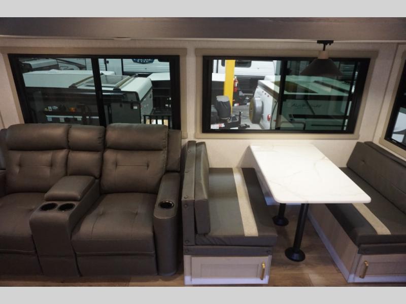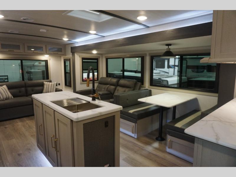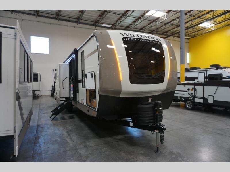 It's time to head to your destination with this Wildwood Heritage Glen travel trailer, whether it be a state park, RV resort, or your own land. Once you arrive, you can easily open up the dual opposing slides for more interior space and start planning your day. You might like to cook a meal, wash dishes using the kitchen island, and dine at the booth dinette, or you can choose the free-standing table option instead. One thing is for sure, you will love looking out the panoramic window. Your guests may choose to relax in the theatre seats or the tri-fold sofa while watching TV, and the outside kitchen/bar will surely be a useful area when wanting to be outside. Don't worry about storage because the extra large pass-through compartment is available for your camping chairs, tables, fishing rods, and such.
