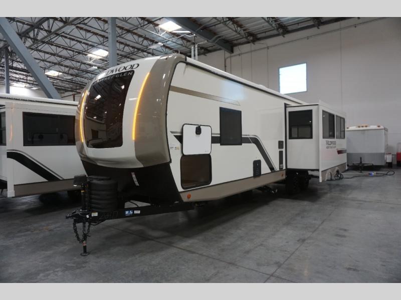 With any Wildwood Heritage Glen travel trailer and fifth wheel by Forest River, the quality construction, attention to detail and design along with a bright and welcoming interior allows you to relax in comfort with conveniences while exploring outdoors. The European Oak colored horizontal plank linoleum flooring is unique, beautiful and durable, and the Saddle colored wood cabinetry with matte black cabinet hardware on the cabinet doors is stylish and beautiful. The heated and enclosed underbelly plus 12V heat pads on all holding tanks allows you to camp anytime of year. More features that provide convenience include the power stabilizer jacks, the extra large pass-through storage, and the central switch center plus the back-up camera prep and roof mounted solar panel prep give you choices. There are many more features included whether you choose a travel trailer or fifth wheel!