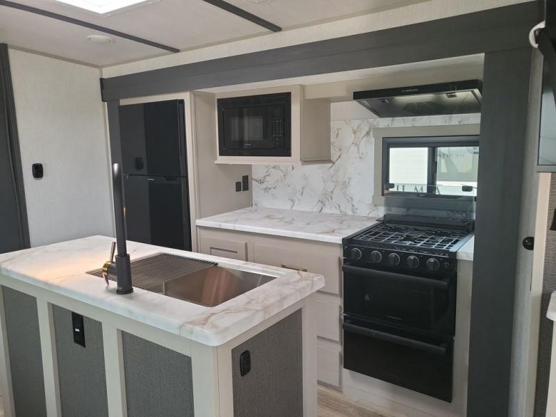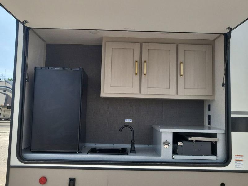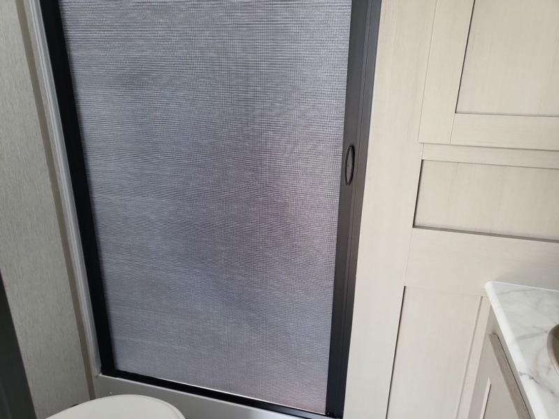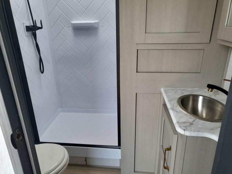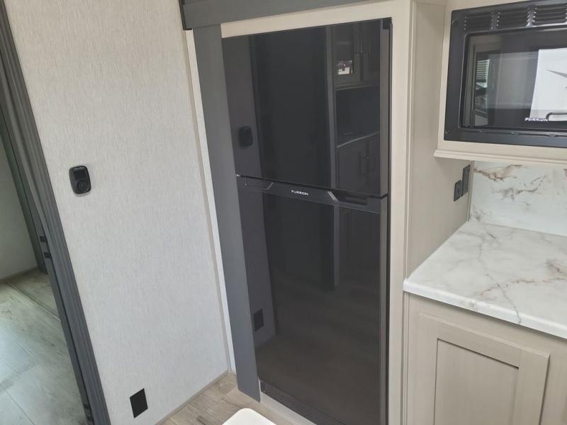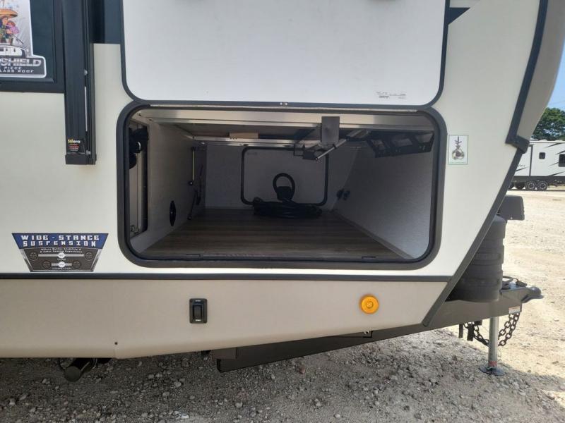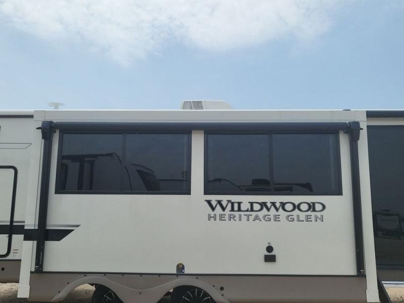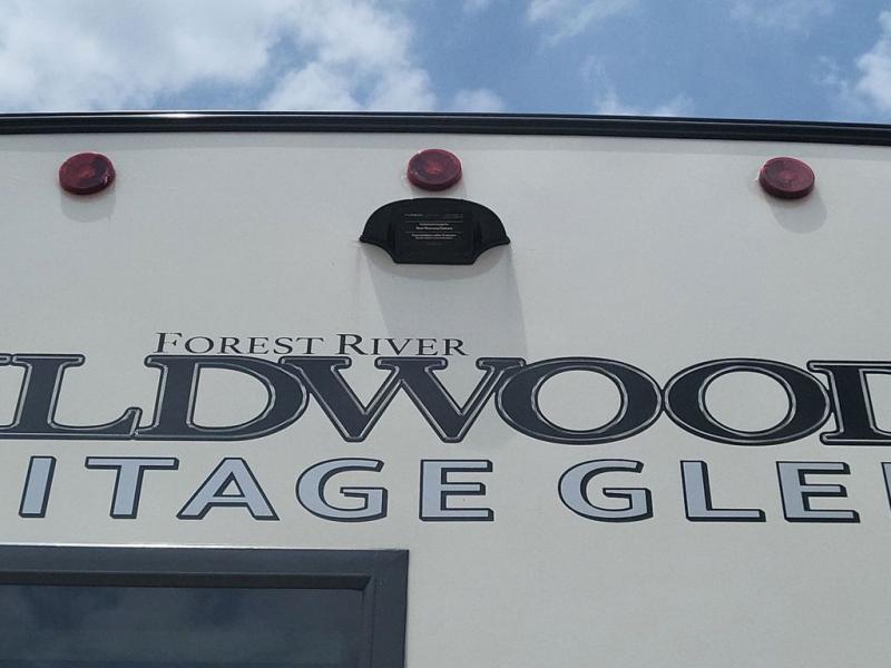 With any Wildwood Heritage Glen travel trailer and fifth wheel by Forest River, the quality construction, attention to detail and design along with a bright and beautiful and durable, and the Saddle colored wood cabinetry with matte black cabinet hardware on the cabinet doors is stylish and beautiful. The heated and enclosed underbelly plus 12V heat pads on all holding tanks allows you to camp anytime of year. More features that provide convenience include the power stabilizer jacks, the extra large pass-through storage, and the central switch center plus the back-up camera prep and roof mounted solar panel prep give you choices. There are many more features included whether you choose a travel trailer or fifth wheel!