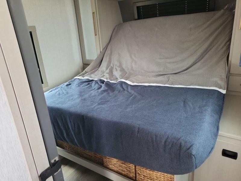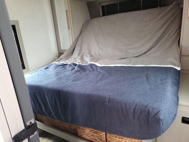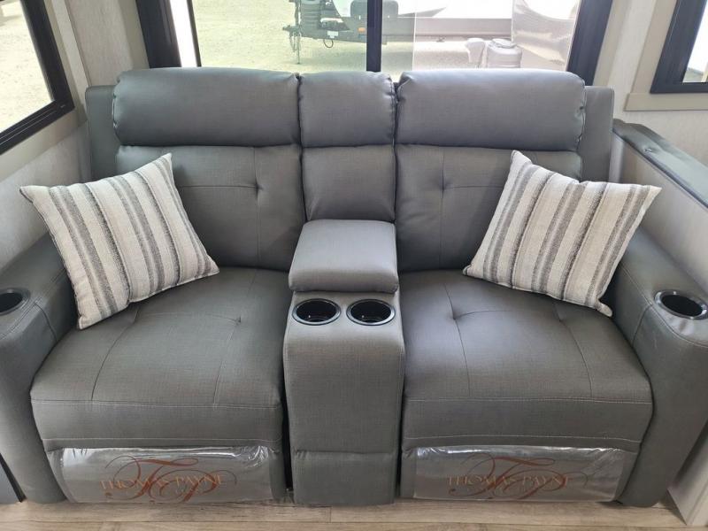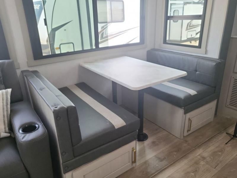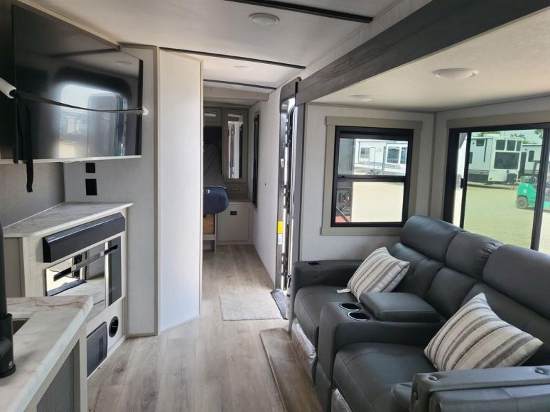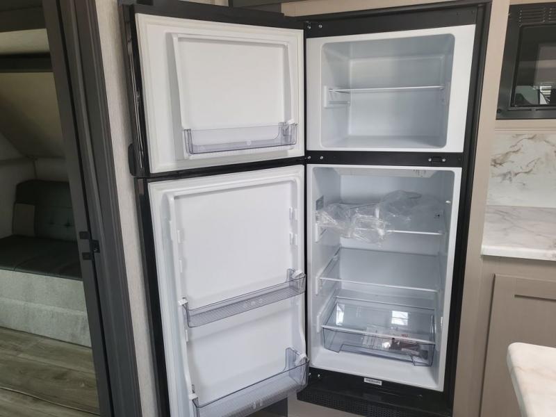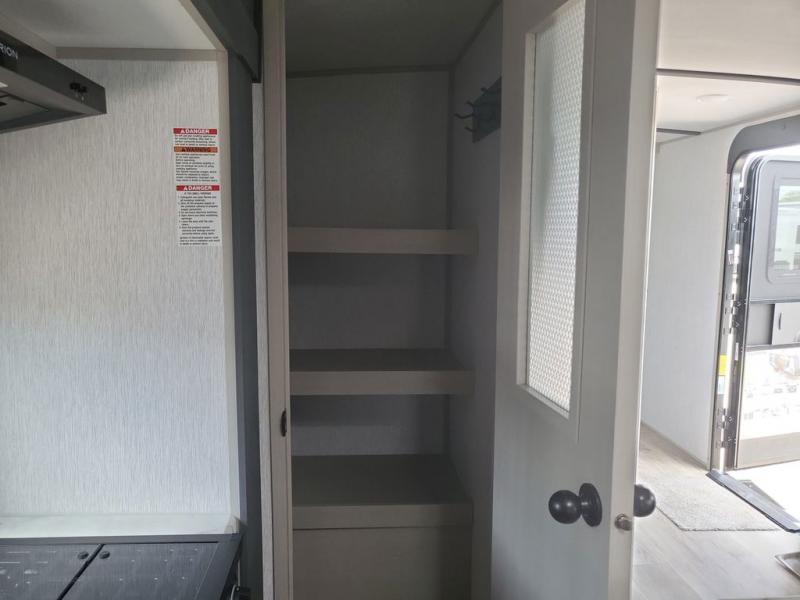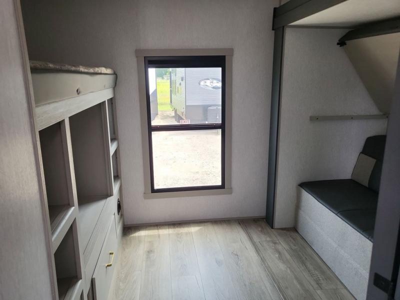 Your kids or friends are ready for a trip in this Wildwood Heritage Glen travel trailer, but are you? As the kiddos or your buddies claim the private bunkhouse for themselves, which includes two bunk beds and a convertible sofa bed, you can escape to your own privacy in the front bedroom with a queen bed and lots of storage. There is even washer/dryer prep for added convenience. The main living area and kitchen might be the next indoor hangout spot thanks to the chef-size walk-in pantry and black 12V refrigerator. The cook even has a choice of making meals on the outside kitchen/bar which also includes an LP quick connect nearby. On rainy days, the theatre seats and booth dinette will offer a place to watch TV and play games, and the panoramic windows will always offer beautiful scenery no matter the weather conditions.
