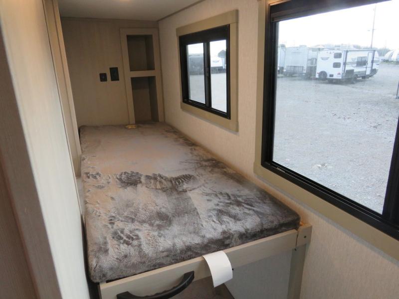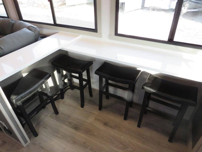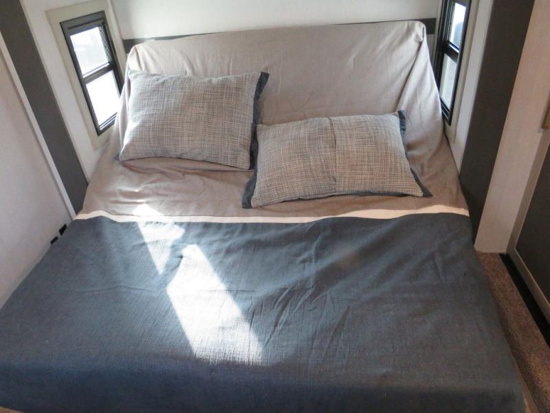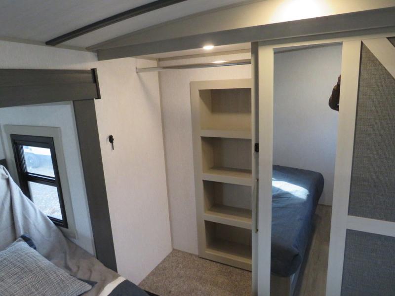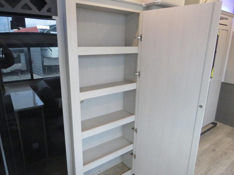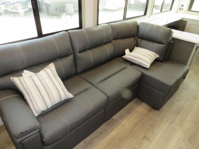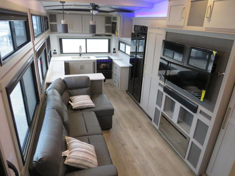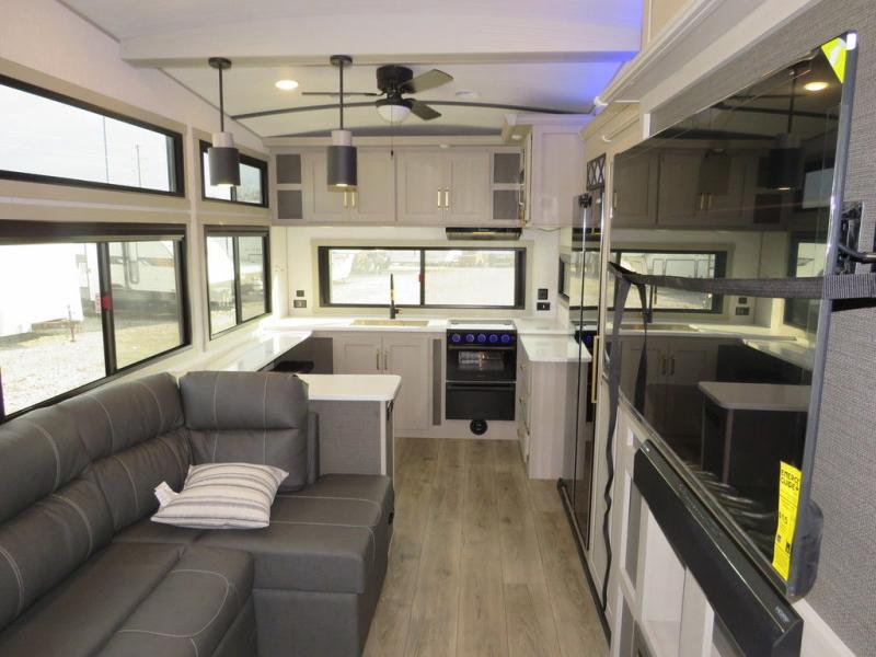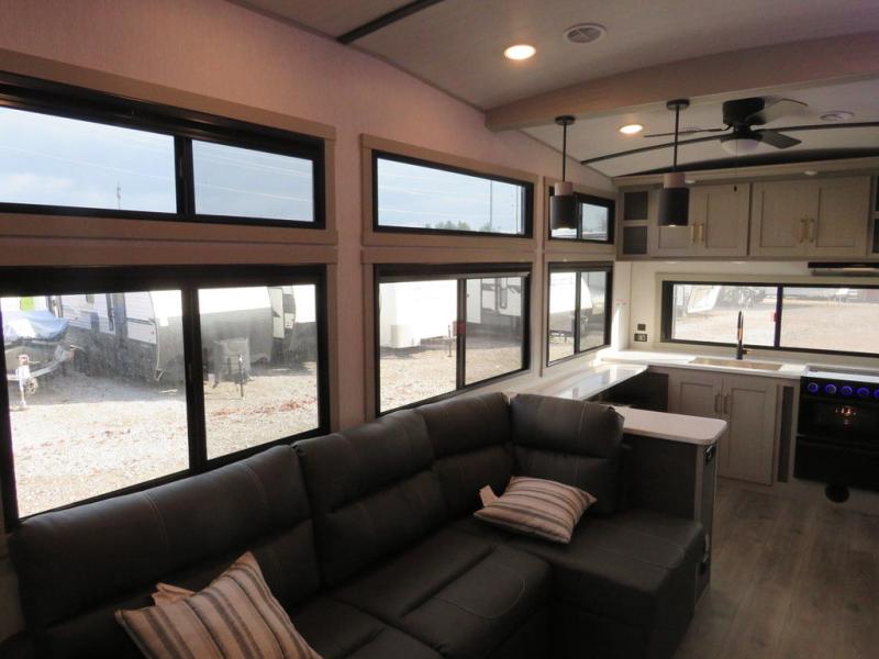 If you've been wanting to upgrade your RV to something with a little more space and a larger sleeping capacity, the time is now! This fifth wheel includes two slide outs, plus a hidden bunk room, complete with two bunks, a dresser, and a pocket door with storage! You will enjoy the front private bedroom all to yourselves with a custom king bed with Versa Tilt, panoramic windows, and a walk-in closet with shelves. Across from the bunk room is the sectional sofa and TV, and you are sure to love the rear kitchen! Here, you'll find wrap-around counter space with four stools, panoramic windows, and a spacious 16 cu. ft. 12V refrigerator. If you're a group that loves spending time outdoors, you'll find plenty of amenities there as well, including an outdoor refrigerator, an LP quick connect, plus a 16' power with LED lights!