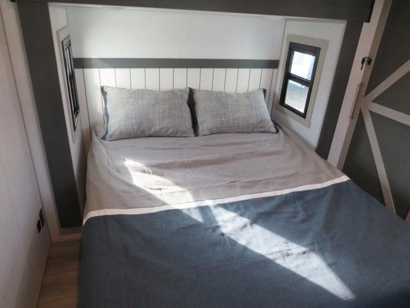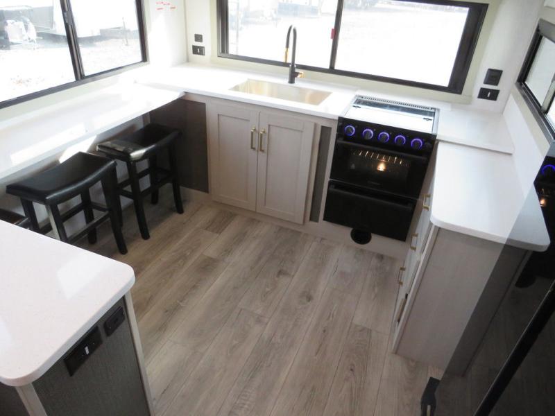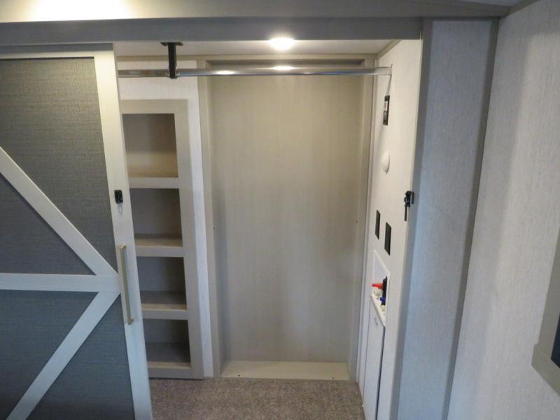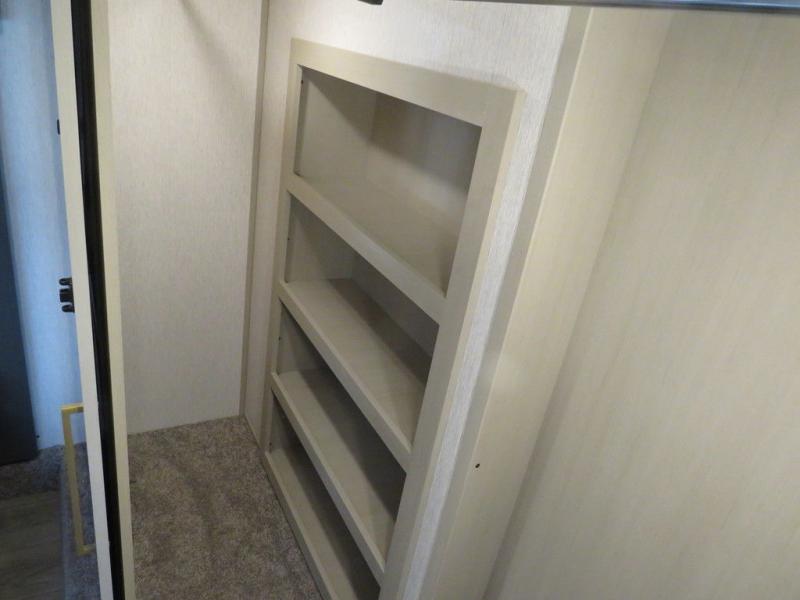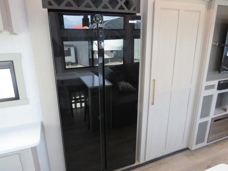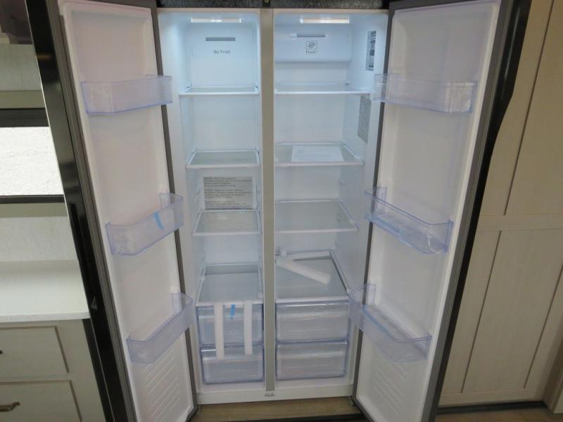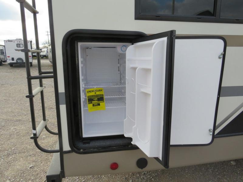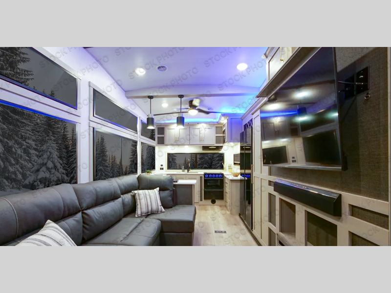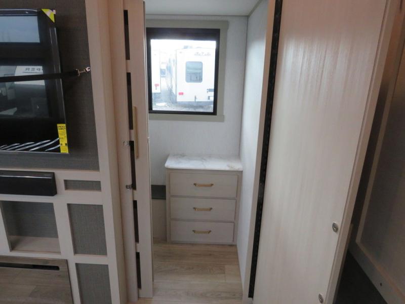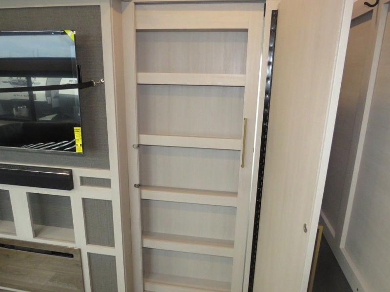 If you've been wanting to upgrade your RV to something with a little more space and a larger sleeping capacity, the time is now! This fifth wheel includes two slide outs, plus a hidden bunk room, complete with two bunks, a dresser, and a pocket door with storage! You will enjoy the front private bedroom all to yourselves with a custom king bed with Versa Tilt, panoramic windows, and a walk-in closet with shelves. Across from the bunk room is the sectional sofa and TV, and you are sure to love the rear kitchen! Here, you'll find wrap-around counter space with four stools, panoramic windows, and a spacious 16 cu. ft. 12V refrigerator. If you're a group that loves spending time outdoors, you'll find plenty of amenities there as well, including an outdoor refrigerator, an LP quick connect, plus a 16' power with LED lights!