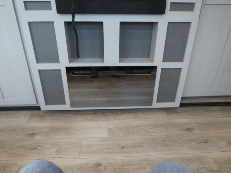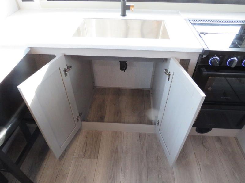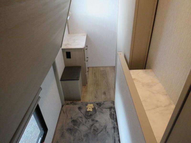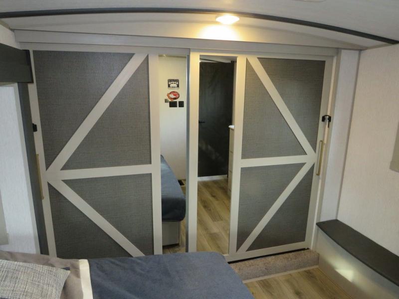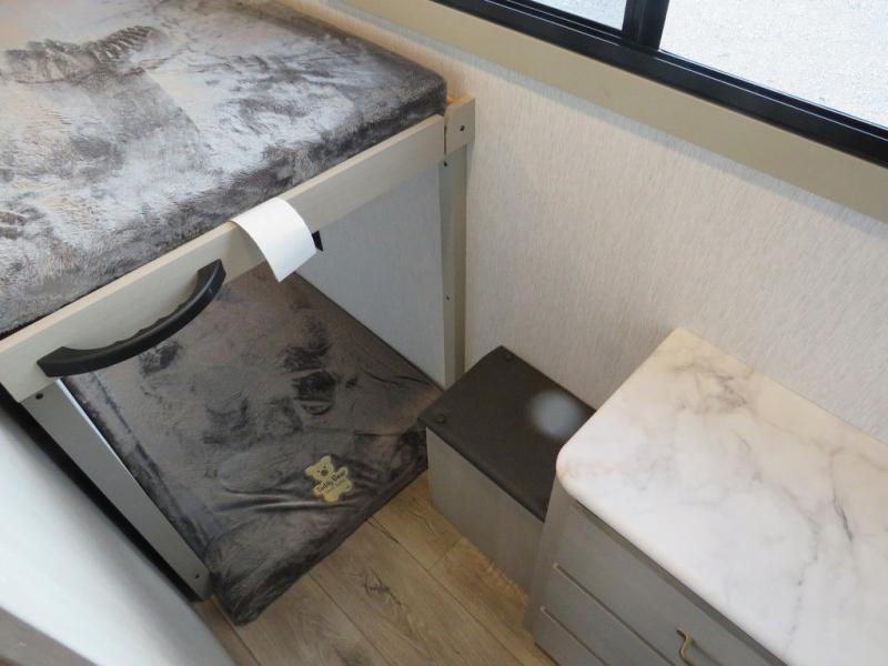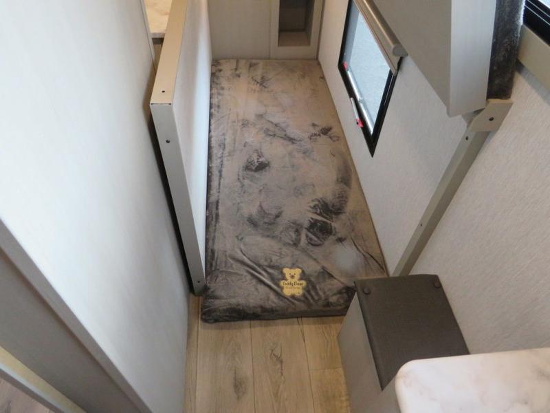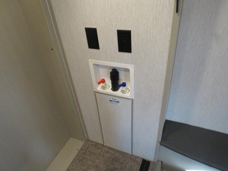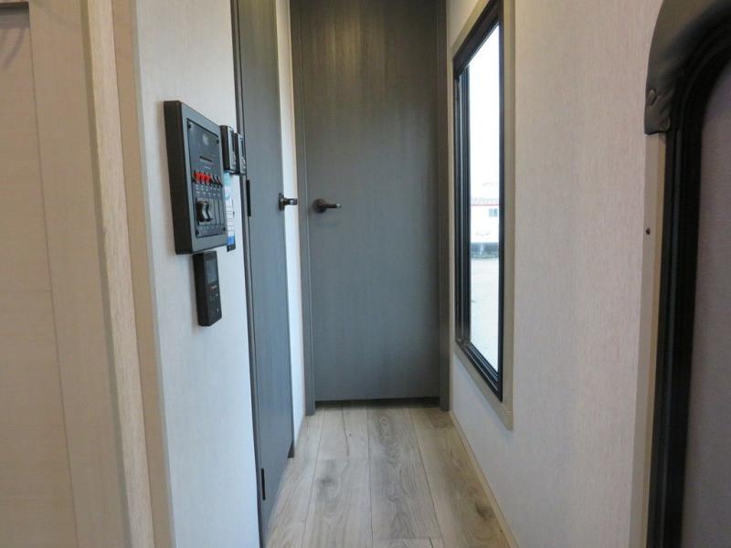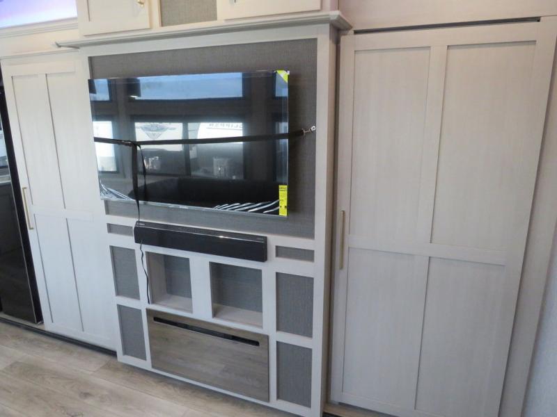 If you've been wanting to upgrade your RV to something with a little more space and a larger sleeping capacity, the time is now! This fifth wheel includes two slide outs, plus a hidden bunk room, complete with two bunks, a dresser, and a pocket door with storage! You will enjoy the front private bedroom all to yourselves with a custom king bed with Versa Tilt, panoramic windows, and a walk-in closet with shelves. Across from the bunk room is the sectional sofa and TV, and you are sure to love the rear kitchen! Here, you'll find wrap-around counter space with four stools, panoramic windows, and a spacious 16 cu. ft. 12V refrigerator. If you're a group that loves spending time outdoors, you'll find plenty of amenities there as well, including an outdoor refrigerator, an LP quick connect, plus a 16' power with LED lights!