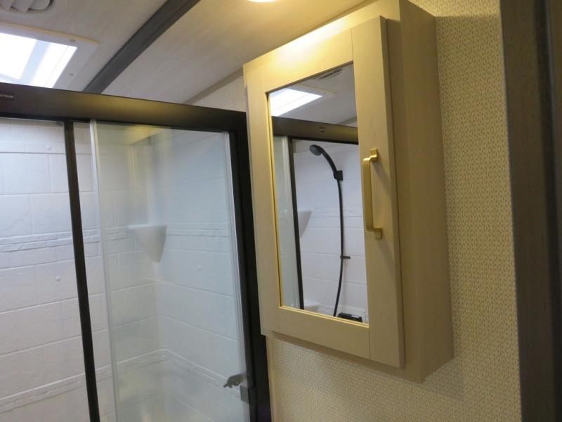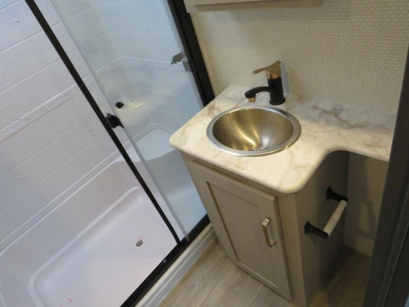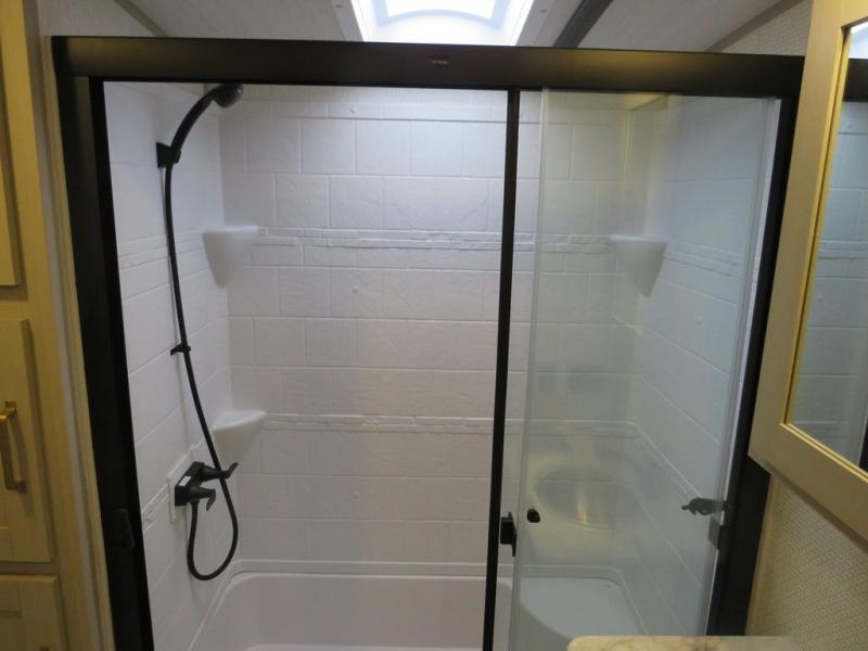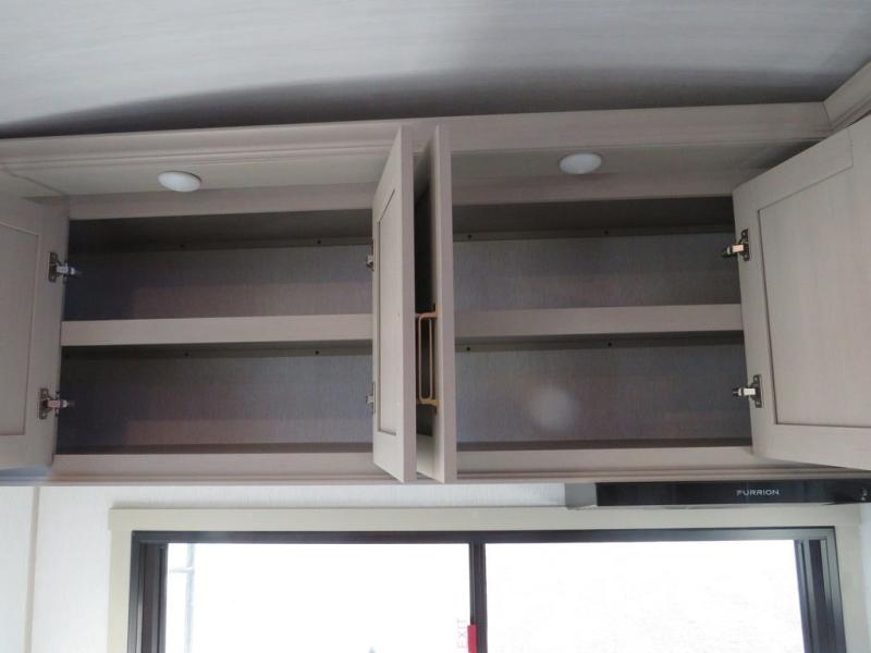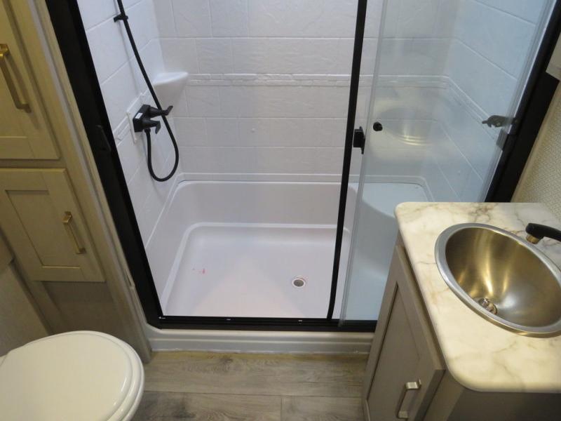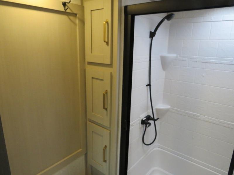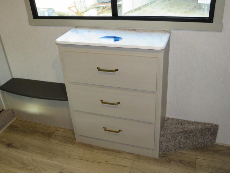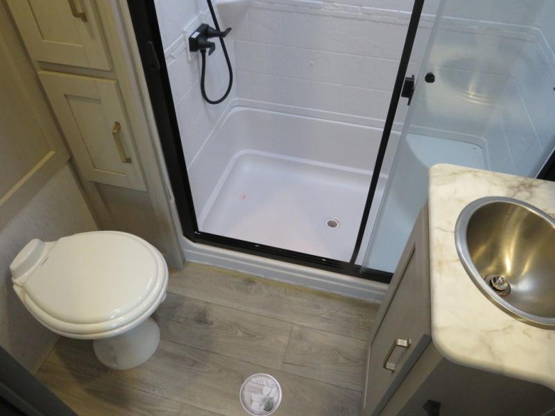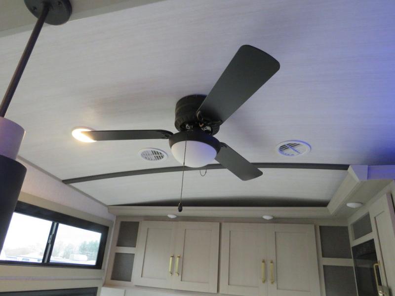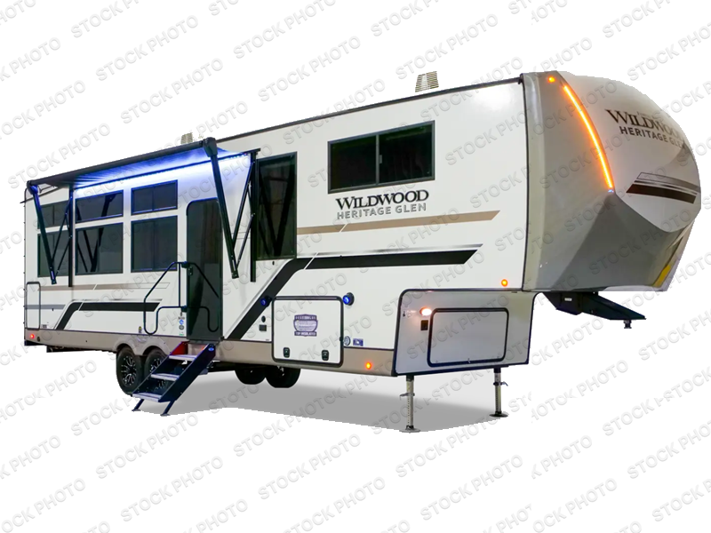 With any Wildwood Heritage Glen fifth wheel by Forest River, the quality construction, attention to detail and design along with a bright and welcoming interior allows you to relax in comfort with conveniences while exploring outdoors. The European Oak colored horizontal plank linoleum flooring is unique, beautiful and durable, and there are gold-accented faucets with stainless steel sinks in the bathrooms for added luxury. The Accessibelly underbelly with 12V tank heaters will help protect your unit from the elements, and the power stabilizer jacks and landing gear will make set-up a breeze. More features that provide convenience include the high-end solid surface countertops, an RV Airflow System that provides at least 25% better airflow, an automotive grade painted front cap with a gel coat, and solar prep for off-grid capabilities.