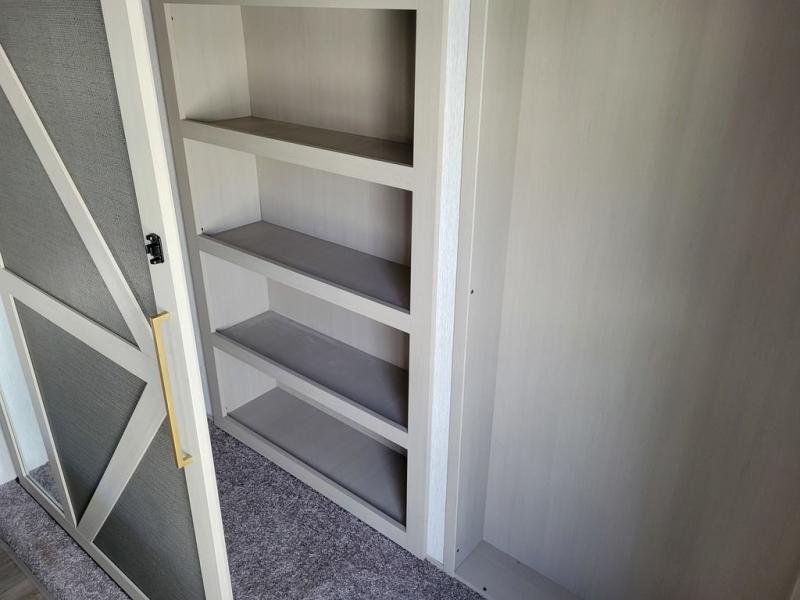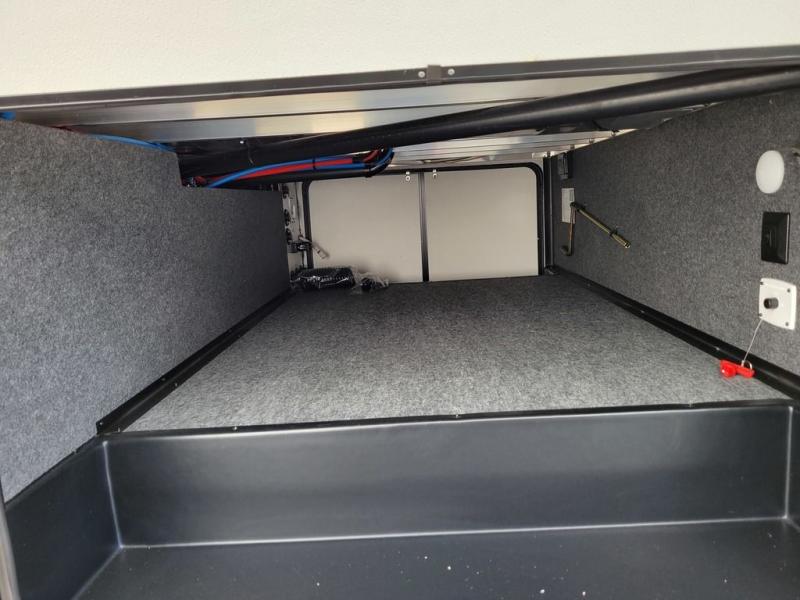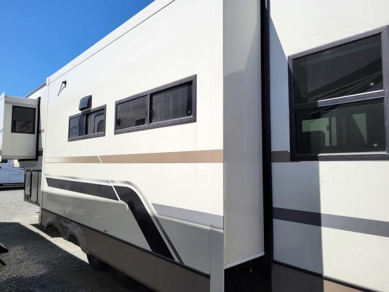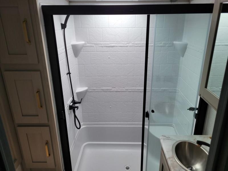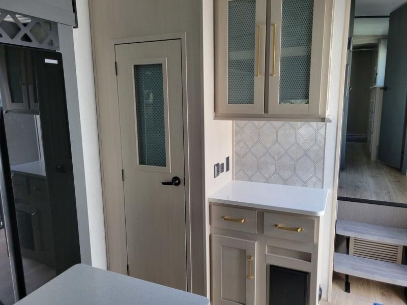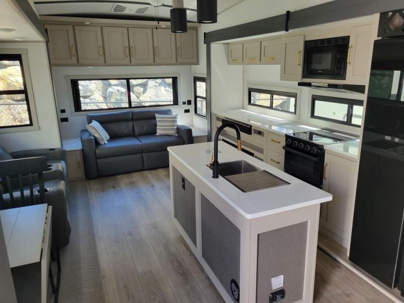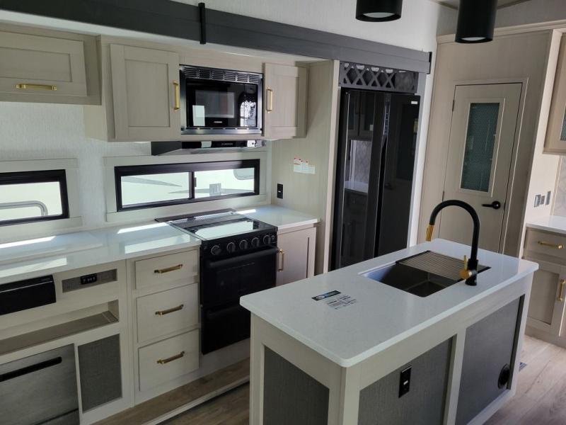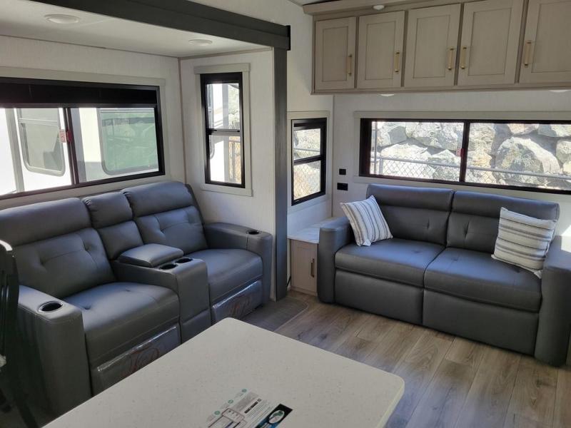 You will love the amount of space you have in this triple slide out fifth wheel, with dual opposing slides in the rear living area/kitchen. Your crew can get cozy on the theater seating across from the pop-up TV and fireplace, play a game at the table and chairs, and sleep on the tri-fold sofa. The chef of your group will love the large kitchen island with an additional countertop extension, plus there is a pantry and 16 cu. ft. 12V refrigerator for food storage. The full bath includes a residential-style walk-in shower with a skylight, a linen closet, and a medicine cabinet to keep everything tidy. And you will sleep like a baby in the front private bedroom with a custom king bed with Versa Tilt, a dresser with a bench, and washer/dryer prep in the walk-in closet!