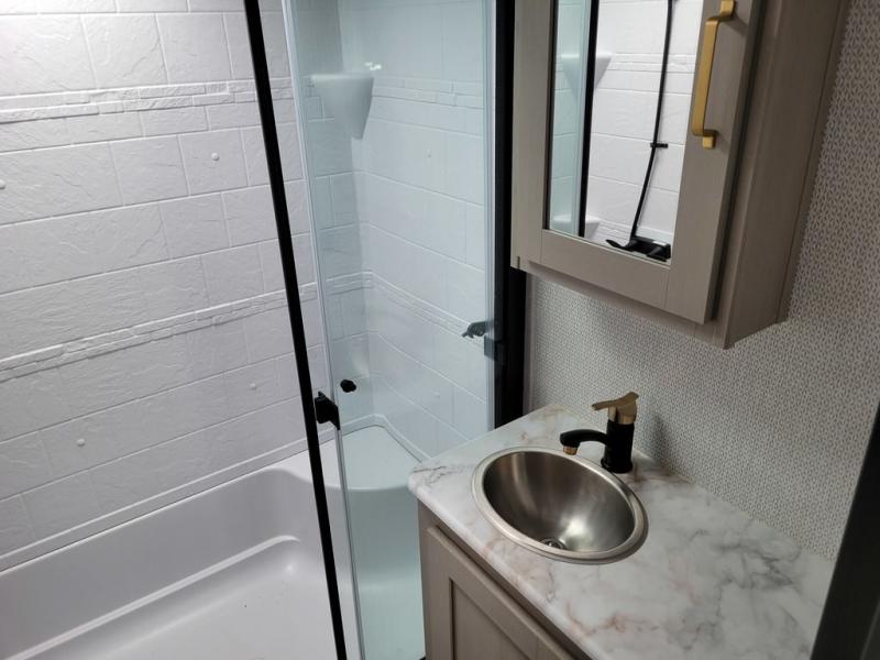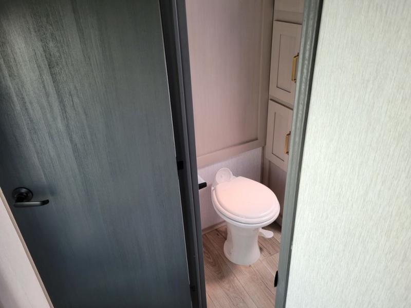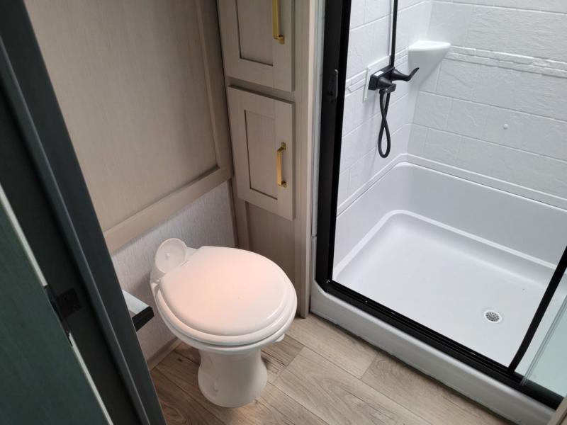 With any Wildwood Heritage Glen fifth wheel by Forest River, the quality construction, attention to detail and design along with a bright and welcoming interior allows you to relax in comfort with conveniences while exploring outdoors. The European Oak colored horizontal plank linoleum flooring is unique, beautiful and durable, and there are gold-accented faucets with stainless steel sinks in the bathrooms for added luxury. The Accessibelly underbelly with 12V tank heaters will help protect your unit from the elements, and the power stabilizer jacks and landing gear will make set-up a breeze. More features that provide convenience include the high-end solid surface countertops, an RV Airflow System that provides at least 25% better airflow, an automotive grade painted front cap with a gel coat, and solar prep for off-grid capabilities.