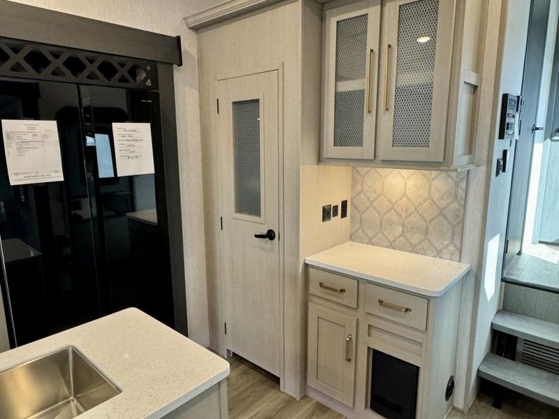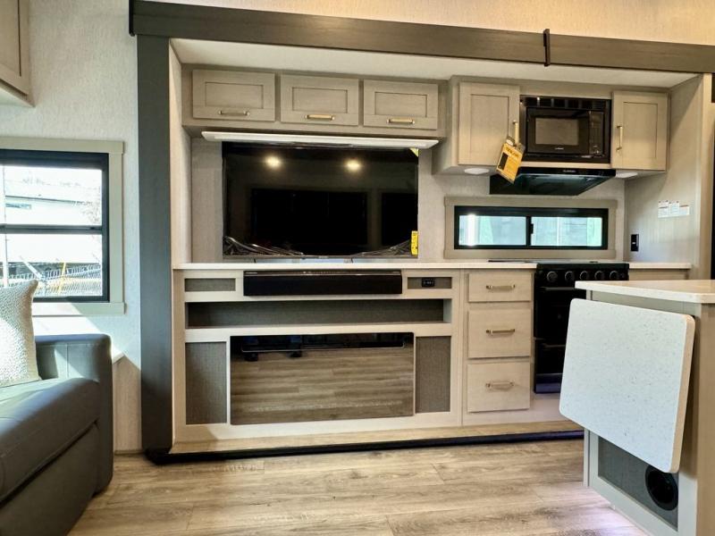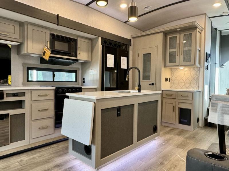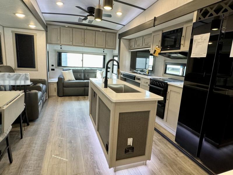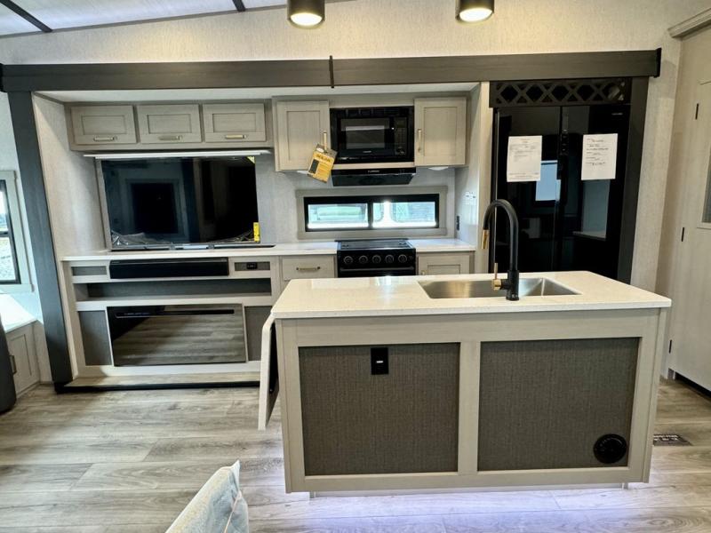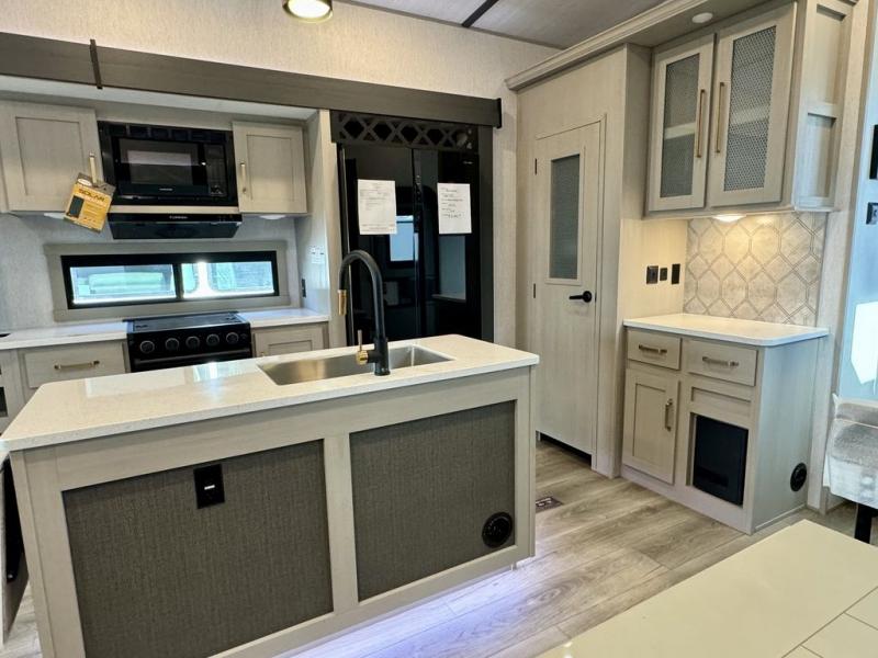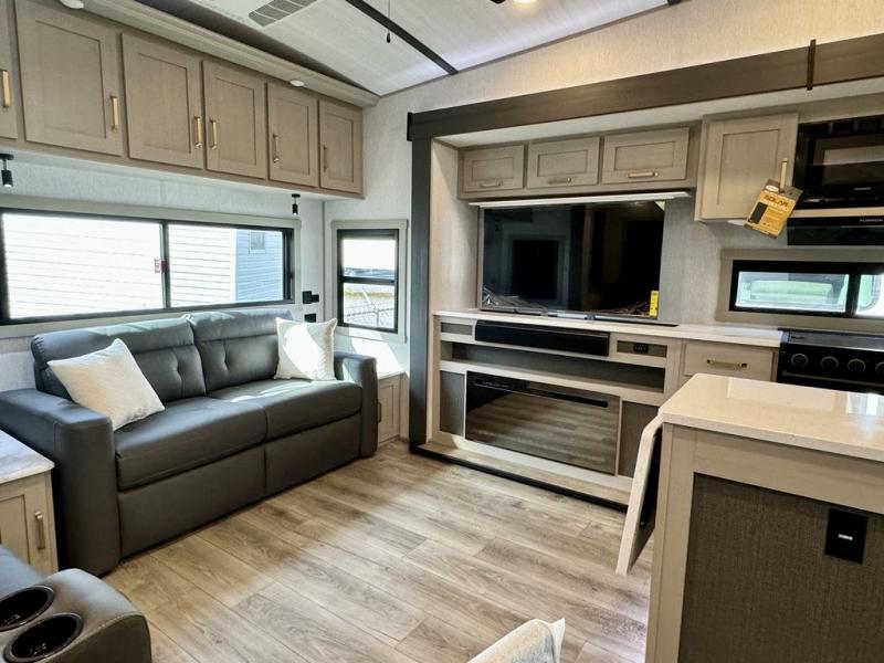 You will love the amount of space you have in this triple slide out fifth wheel, with dual opposing slides in the rear living area/kitchen. Your crew can get cozy on the theater seating across from the pop-up TV and fireplace, play a game at the table and chairs, and sleep on the tri-fold sofa. The chef of your group will love the large kitchen island with an additional countertop extension, plus there is a pantry and 16 cu. ft. 12V refrigerator for food storage. The full bath includes a residential-style walk-in shower with a skylight, a linen closet, and a medicine cabinet to keep everything tidy. And you will sleep like a baby in the front private bedroom with a custom king bed with Versa Tilt, a dresser with a bench, and washer/dryer prep in the walk-in closet!