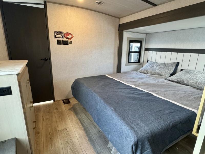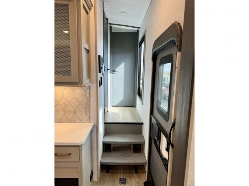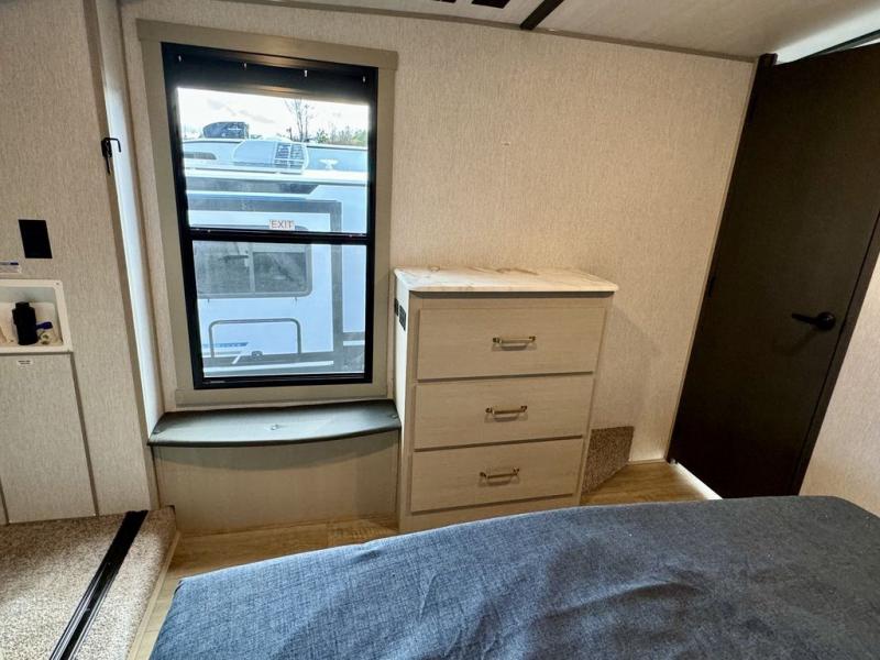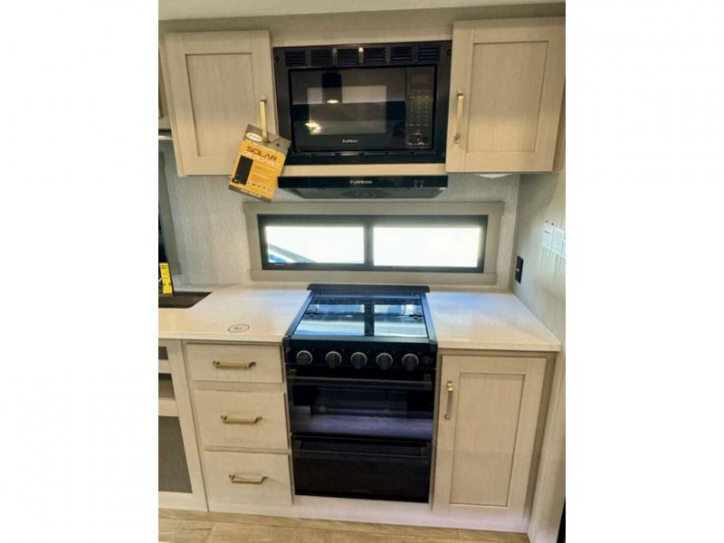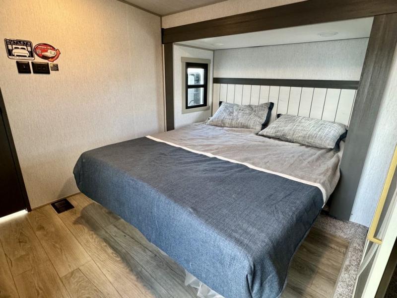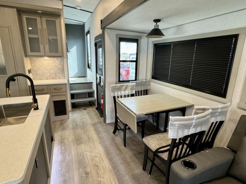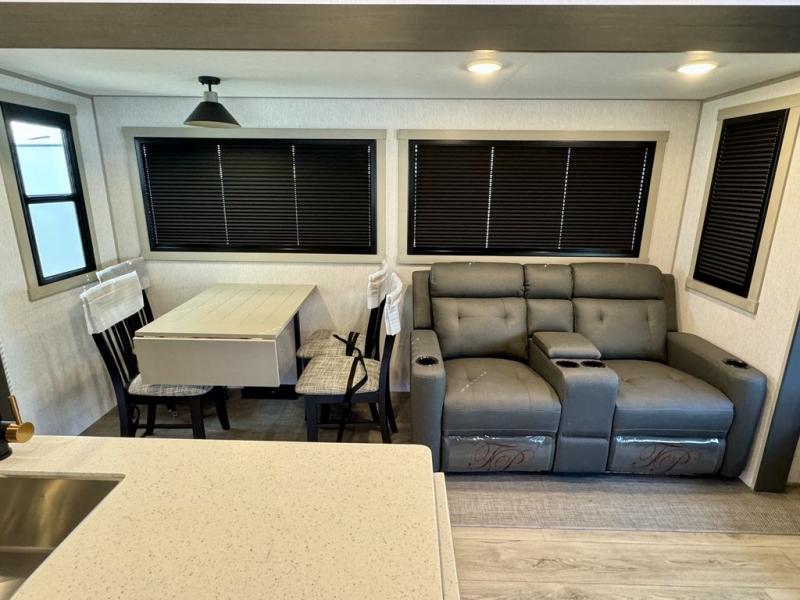 You will love the amount of space you have in this triple slide out fifth wheel, with dual opposing slides in the rear living area/kitchen. Your crew can get cozy on the theater seating across from the pop-up TV and fireplace, play a game at the table and chairs, and sleep on the tri-fold sofa. The chef of your group will love the large kitchen island with an additional countertop extension, plus there is a pantry and 16 cu. ft. 12V refrigerator for food storage. The full bath includes a residential-style walk-in shower with a skylight, a linen closet, and a medicine cabinet to keep everything tidy. And you will sleep like a baby in the front private bedroom with a custom king bed with Versa Tilt, a dresser with a bench, and washer/dryer prep in the walk-in closet!