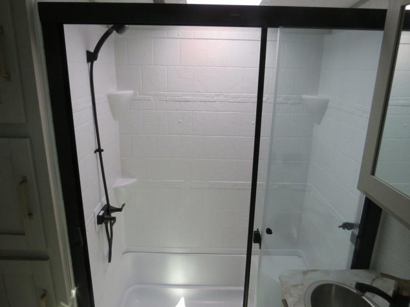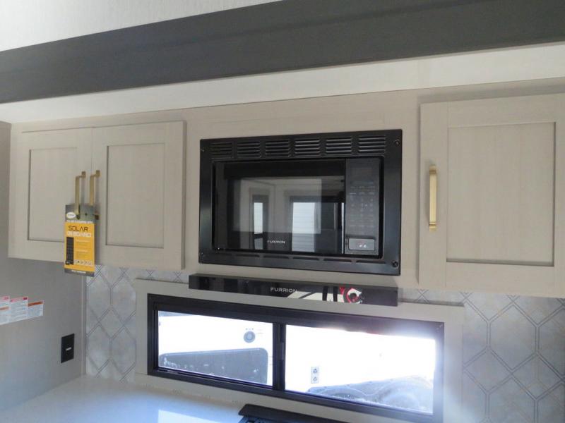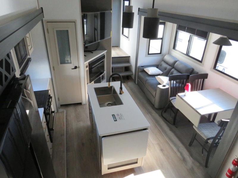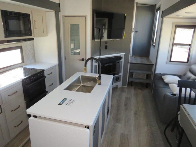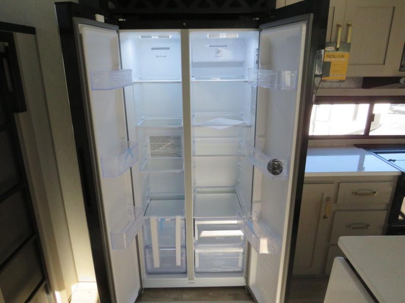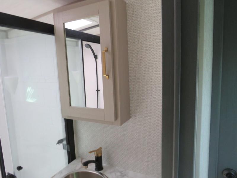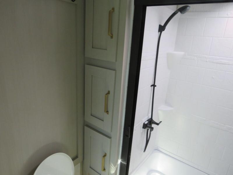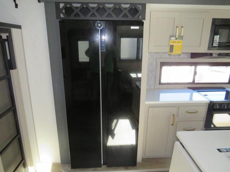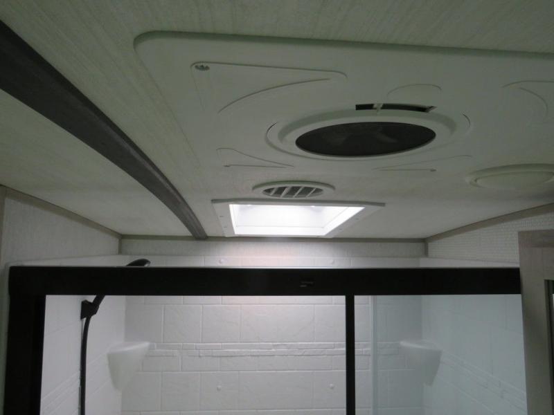 With any Wildwood Heritage Glen fifth wheel by Forest River, the quality construction, attention to detail and design along with a bright and welcoming interior allows you to relax in comfort with conveniences while exploring outdoors. The European Oak colored horizontal plank linoleum flooring is unique, beautiful and durable, and there are gold-accented faucets with stainless steel sinks in the bathrooms for added luxury. The Accessibelly underbelly with 12V tank heaters will help protect your unit from the elements, and the power stabilizer jacks and landing gear will make set-up a breeze. More features that provide convenience include the high-end solid surface countertops, an RV Airflow System that provides at least 25% better airflow, an automotive grade painted front cap with a gel coat, and solar prep for off-grid capabilities.